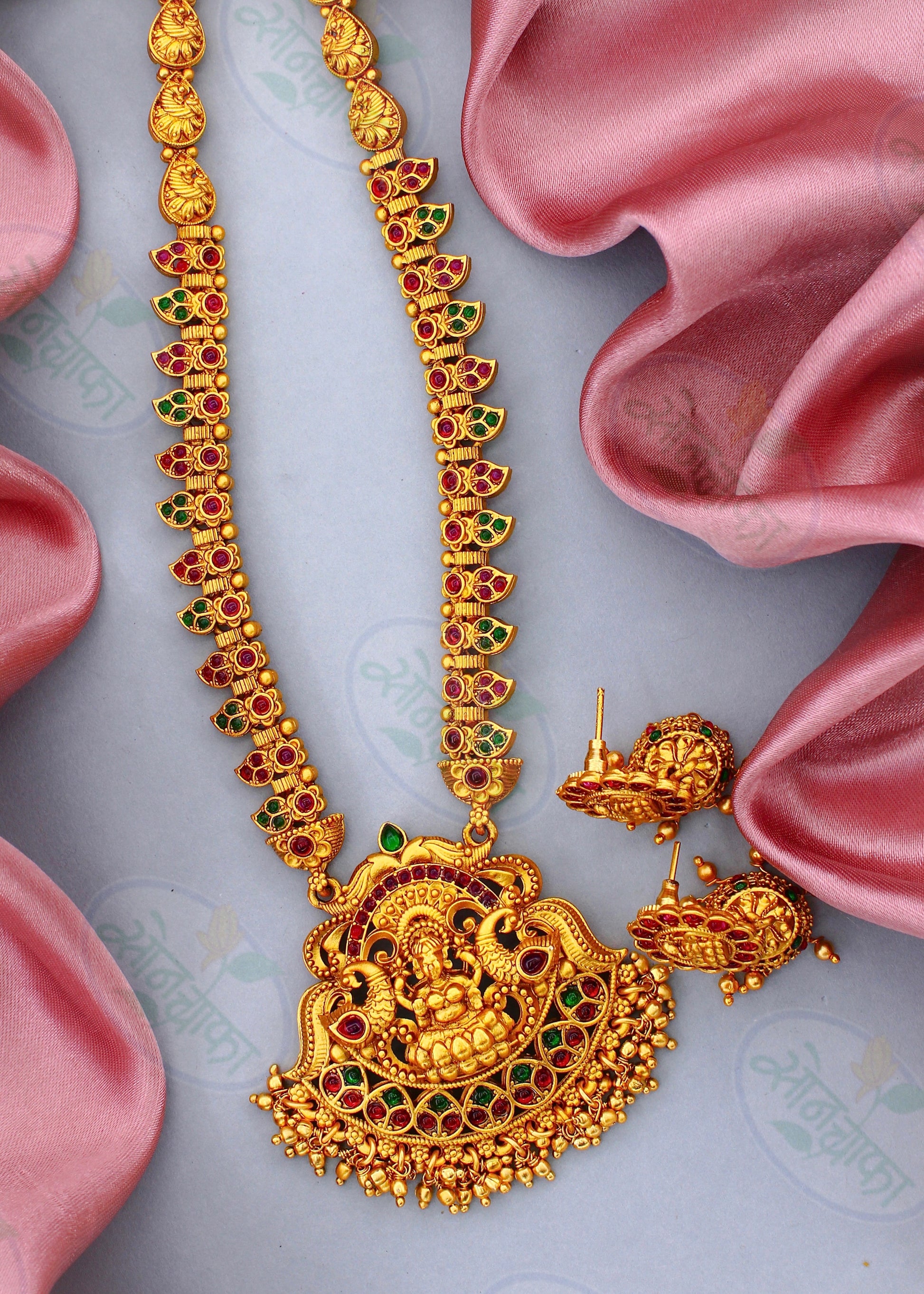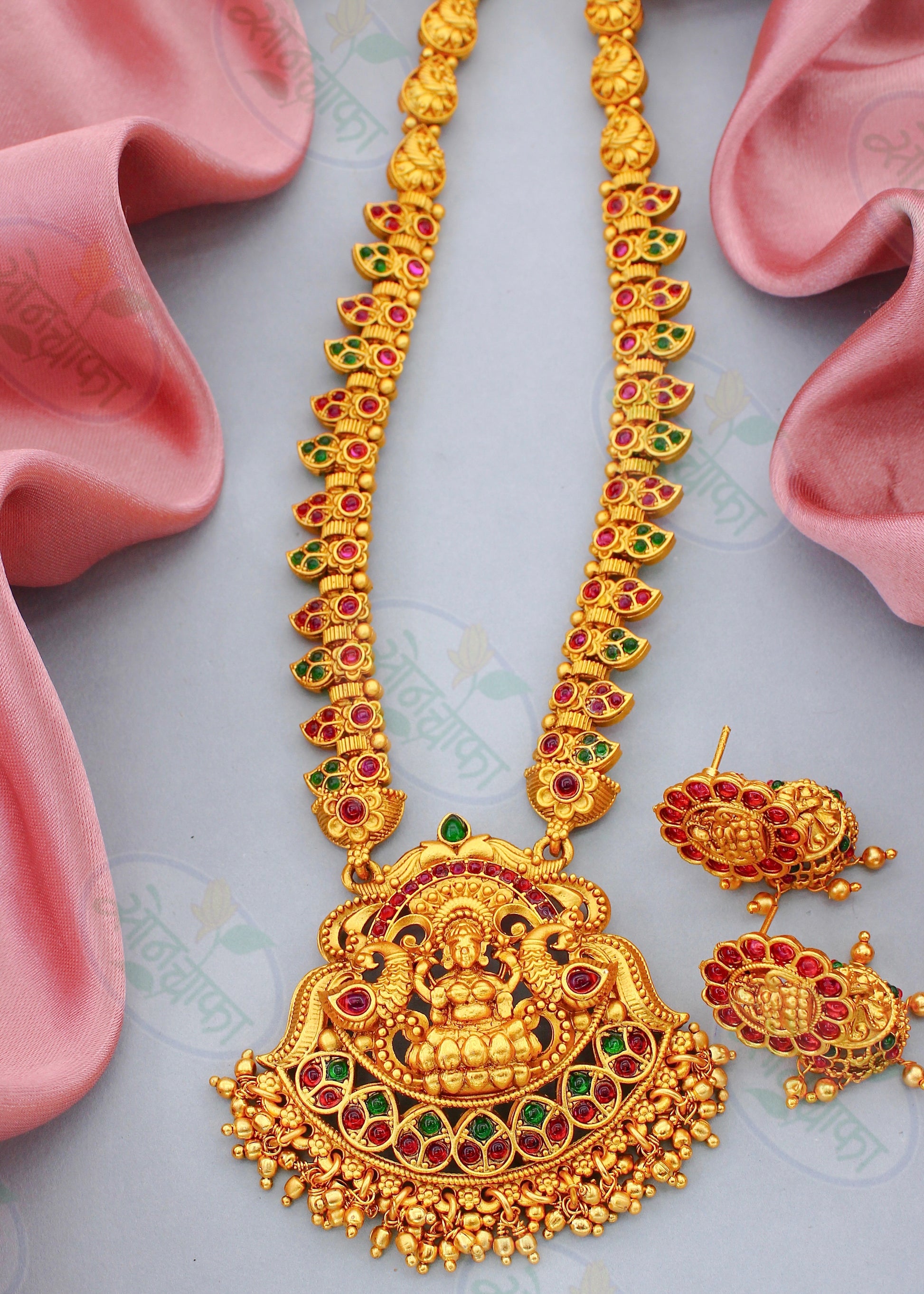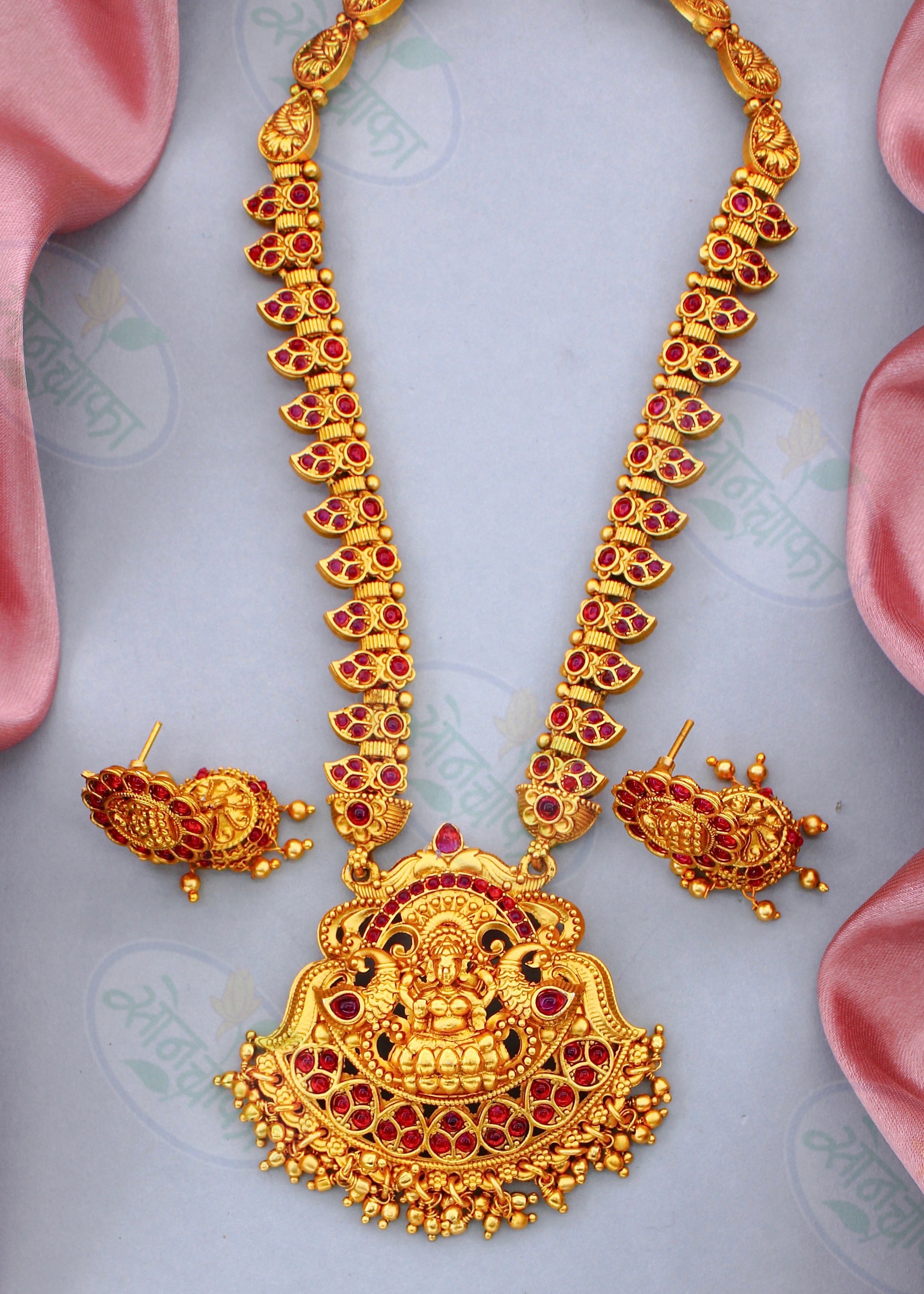 Adorn your neckline with this pearl beads necklace set with your traditional costume. This necklace is decorated with dangled pearl beads for more attraction. This appealing necklace set is good in quality and will retain its shine for years to come.