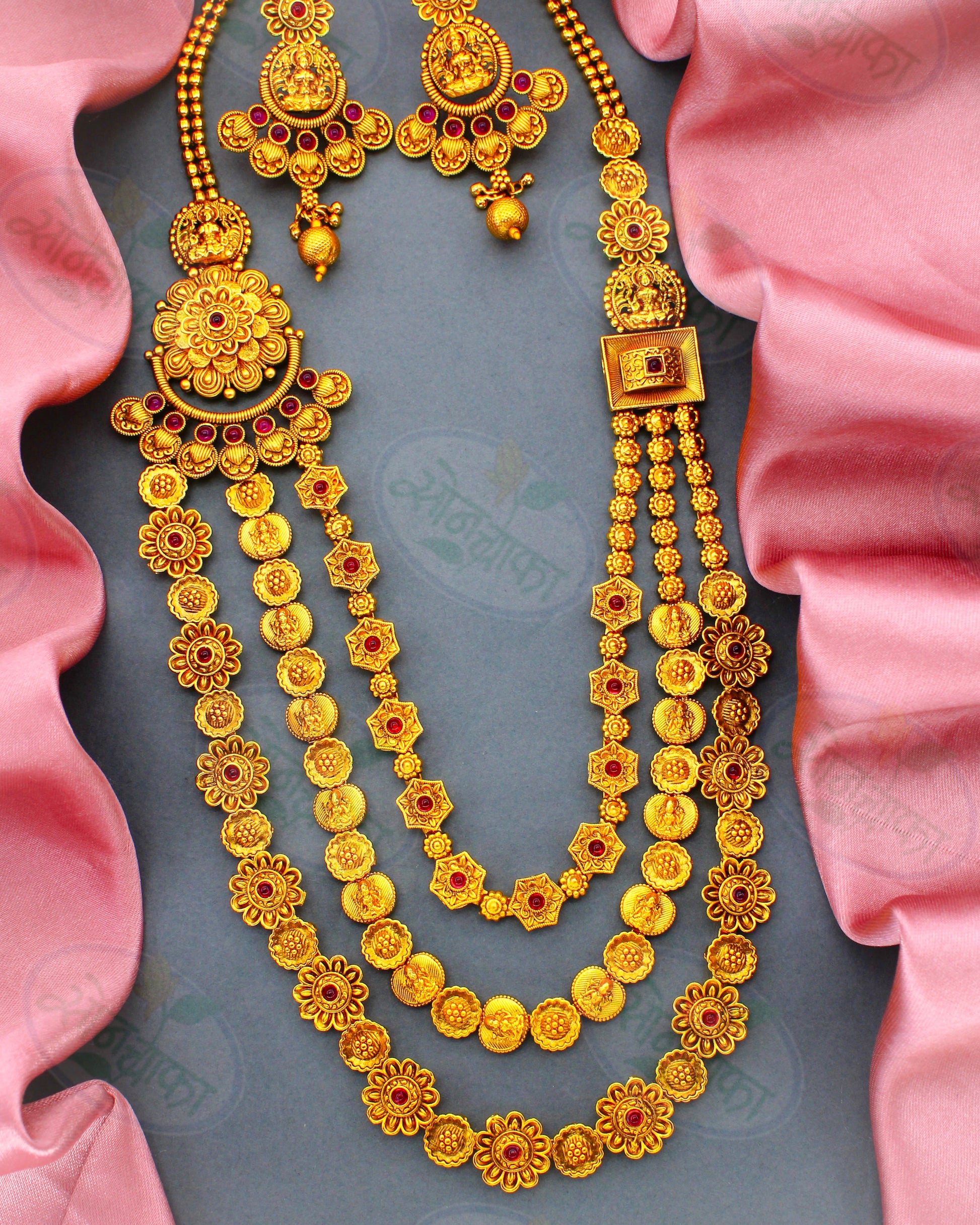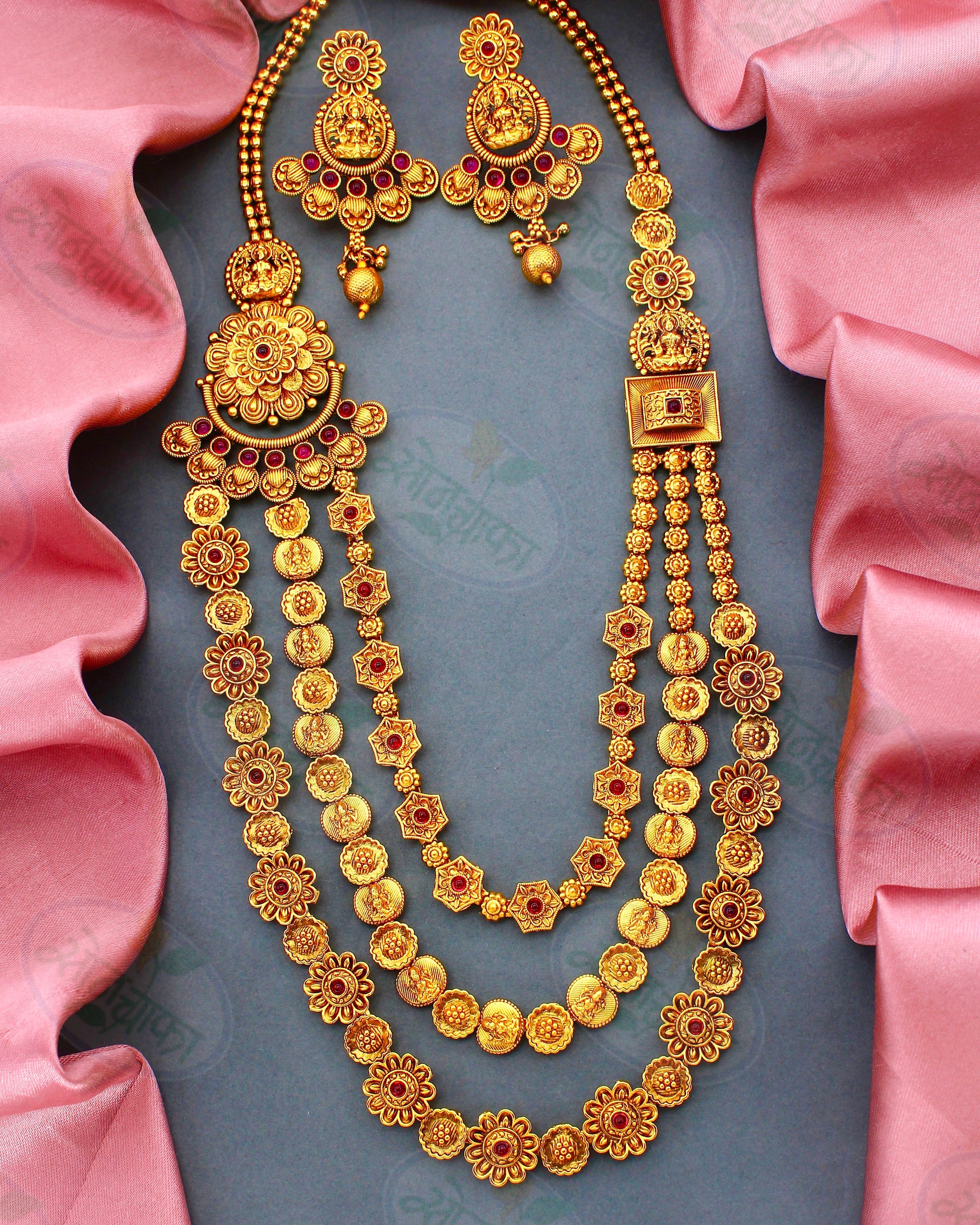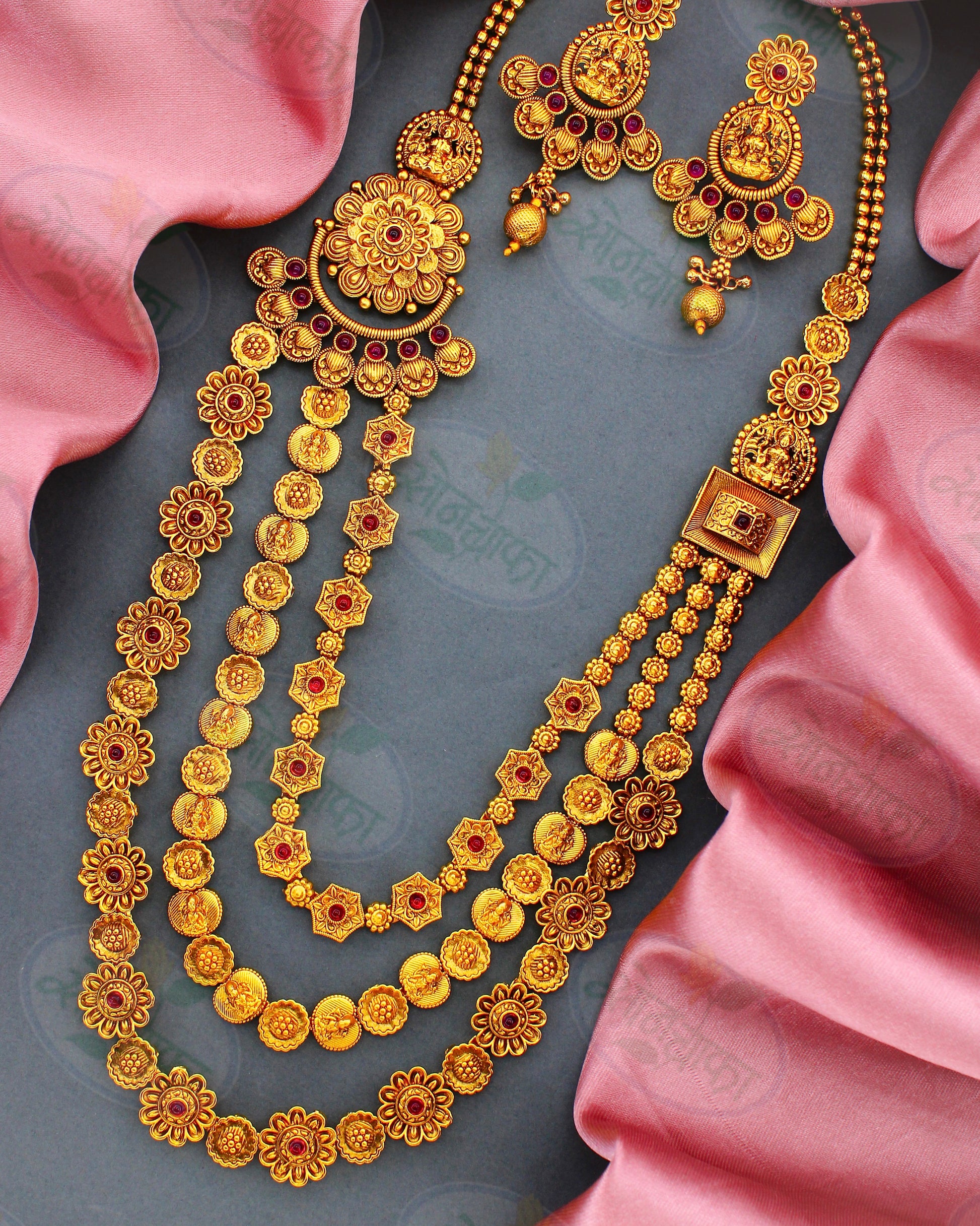 Upgrade your jewellery collection by adding this classy floral influenced Ahilya necklace set from Sonchafa Jewellery. It is crafted from antique golden finish metal and feature wonderful peacock design on metal surface In addition it has adjustable dori so you can fit it properly.
