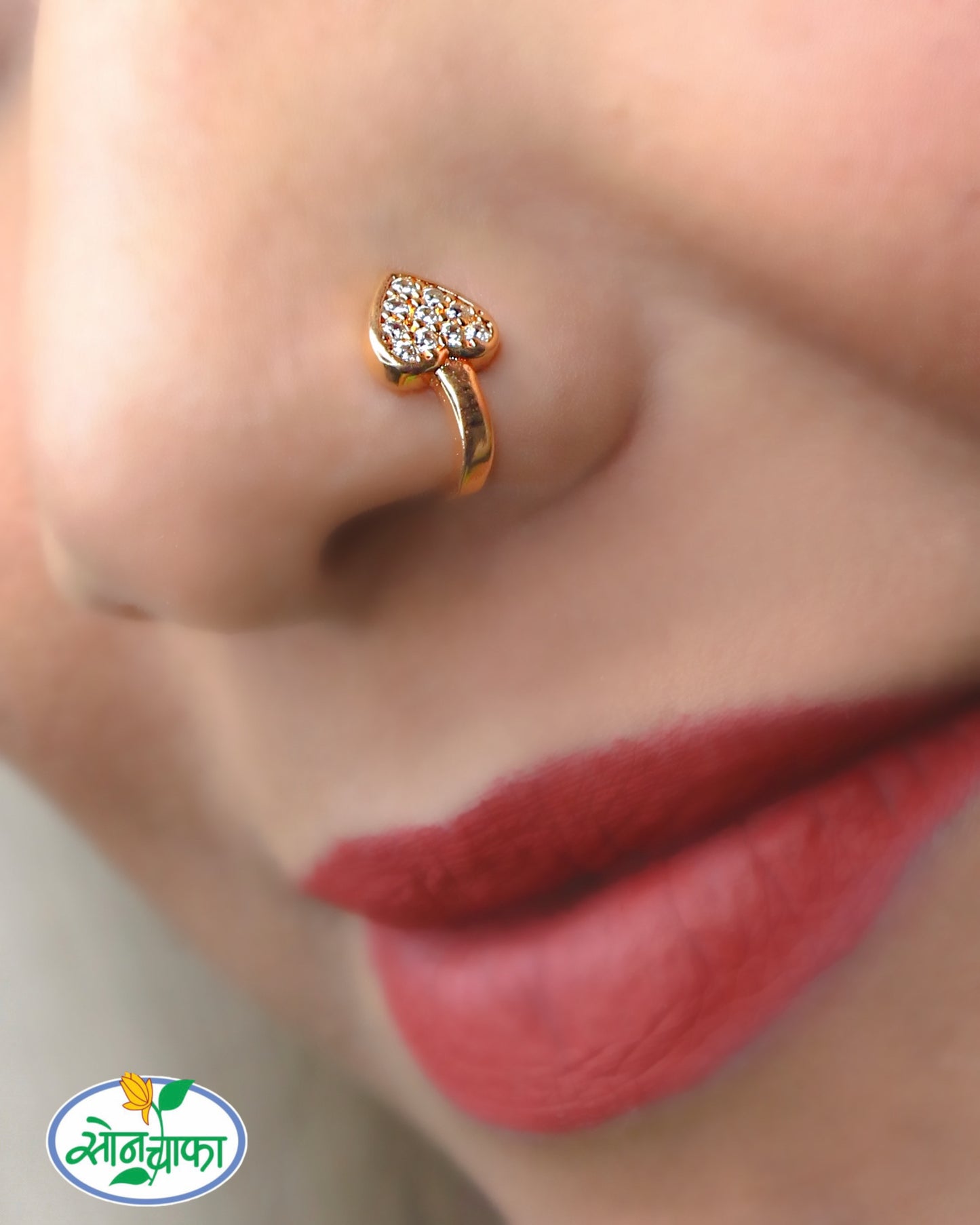 Enhance your persona by clubbing this beautiful nose pin with your favorite costume. It is embedded with sparkling white and crafted from metal. This nath is easy to wear as it is clip on..