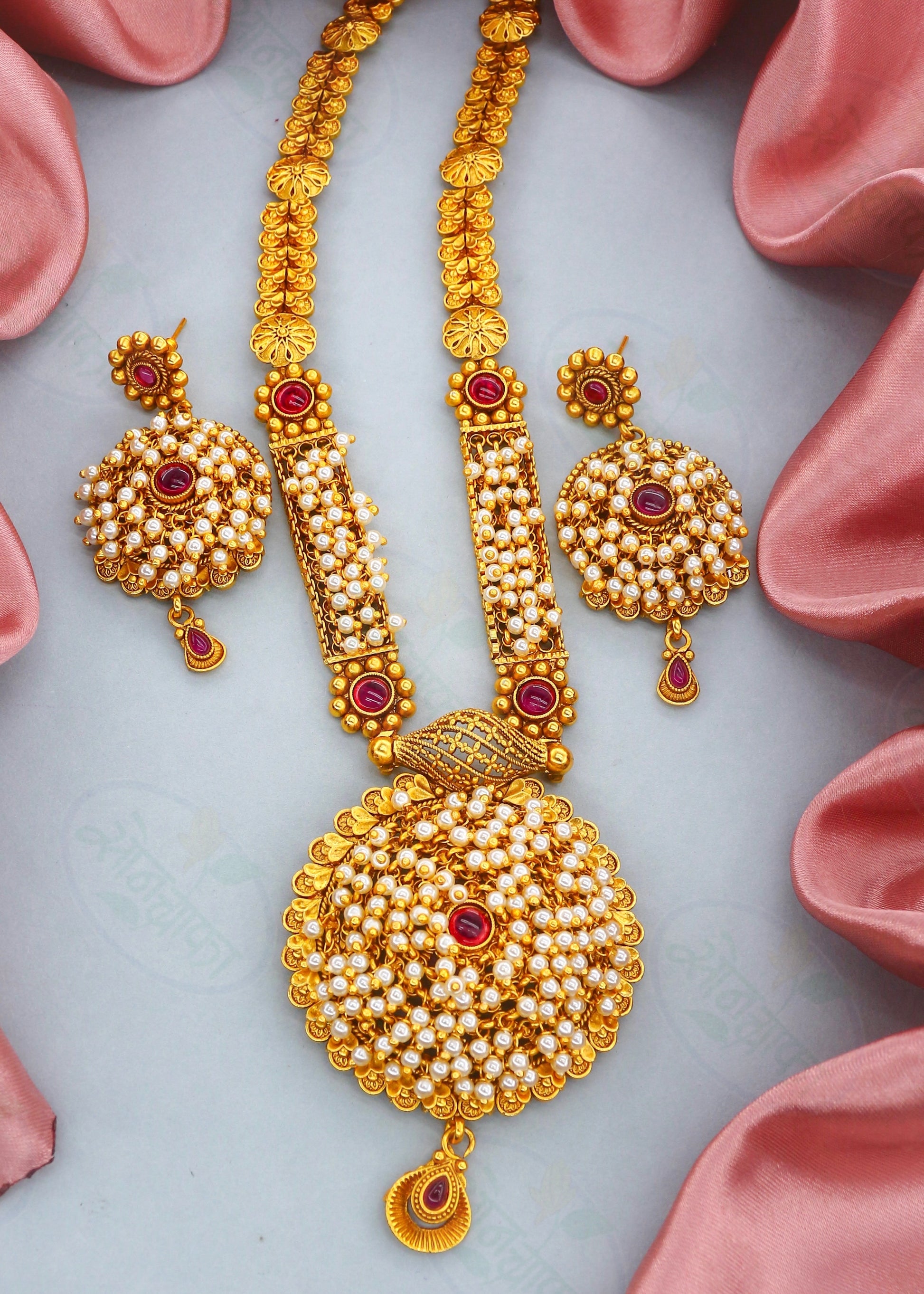Buy something stylish for yourself in the form of this golden finish short necklace set from Sonchafa Jewellery. It is beautifully woven with pink & golden beads featuring flawless kundan work. In addition the neck-piece of this necklace comes with adjustable dori, so that you can fit it properly.