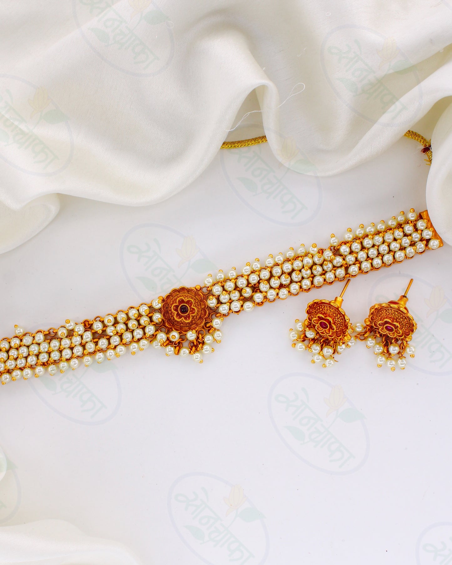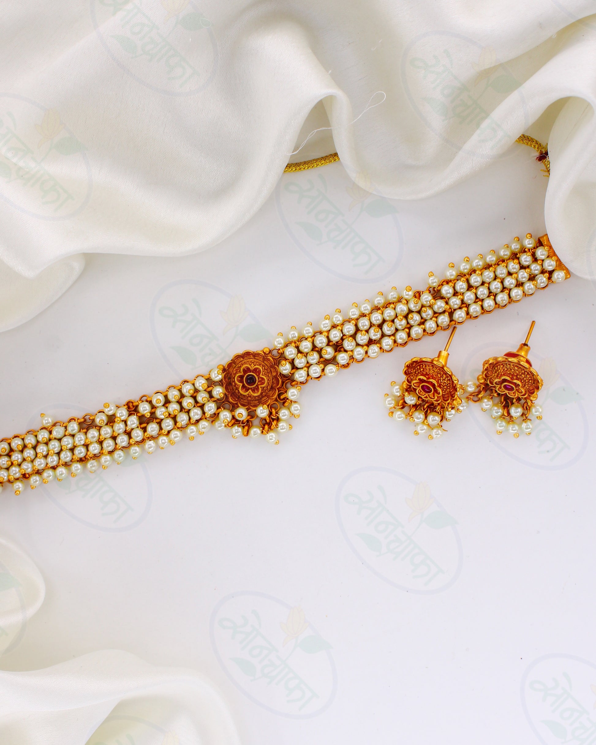 Sonchafa Jewellery offers this attractive floret design necklace set for women who love to wear traditional jewellery. Perfectly encrusted with pink, white stones and crafted from golden finish metal. It is excellently woven with pearl beads and has dangling pearls for added attraction. This set consists of necklace and pair of matching earrings.