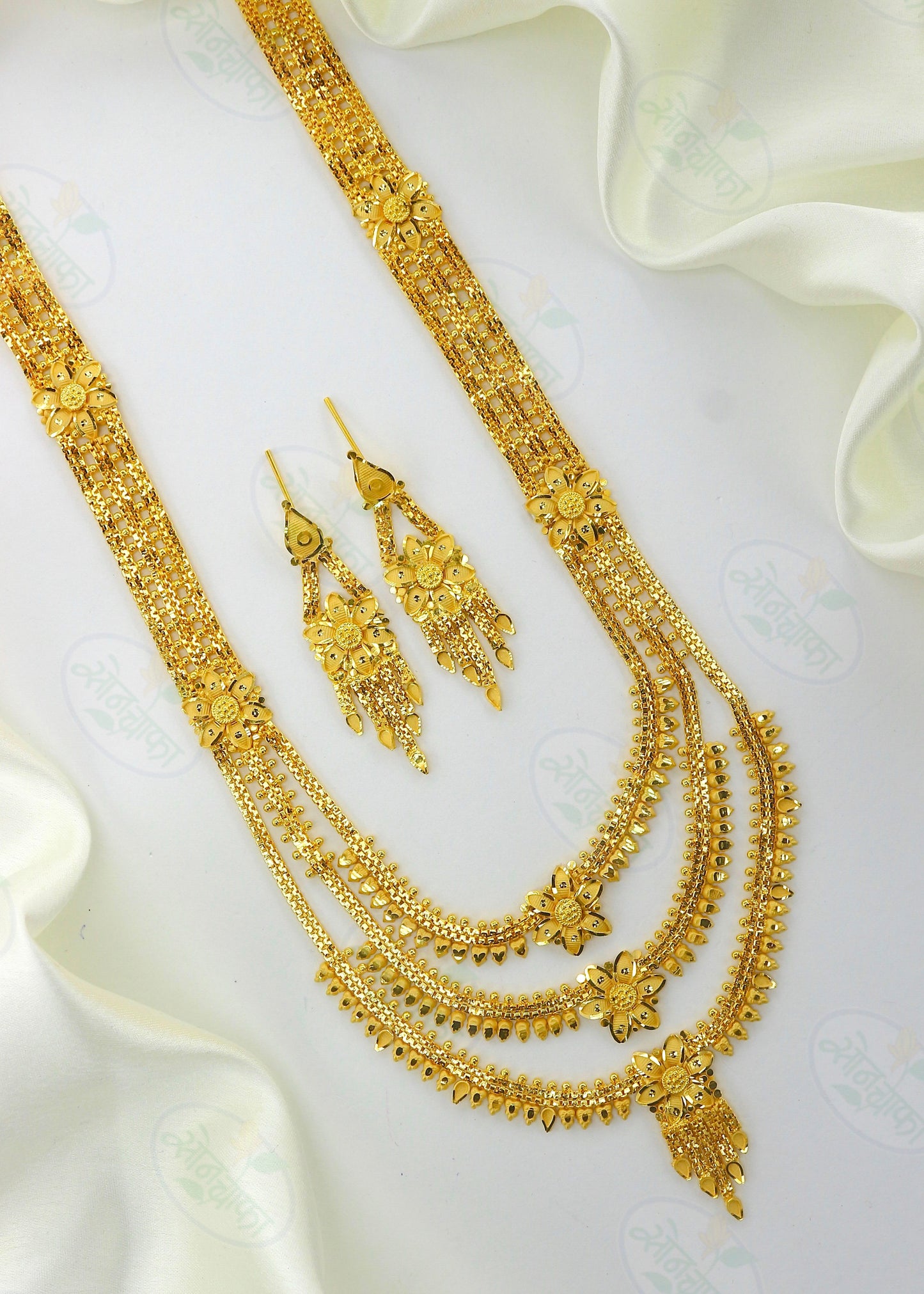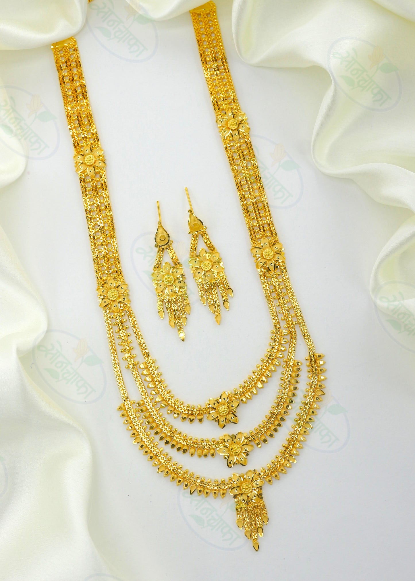 Gold plated triple layer long floral designer necklace set from Sonchafa Jewellery for traditional look. It is wonderfully crafted with 1 gram gold plated metal along with golden chain. It is long lasting and high in durability. It will surely intensify your classy look.