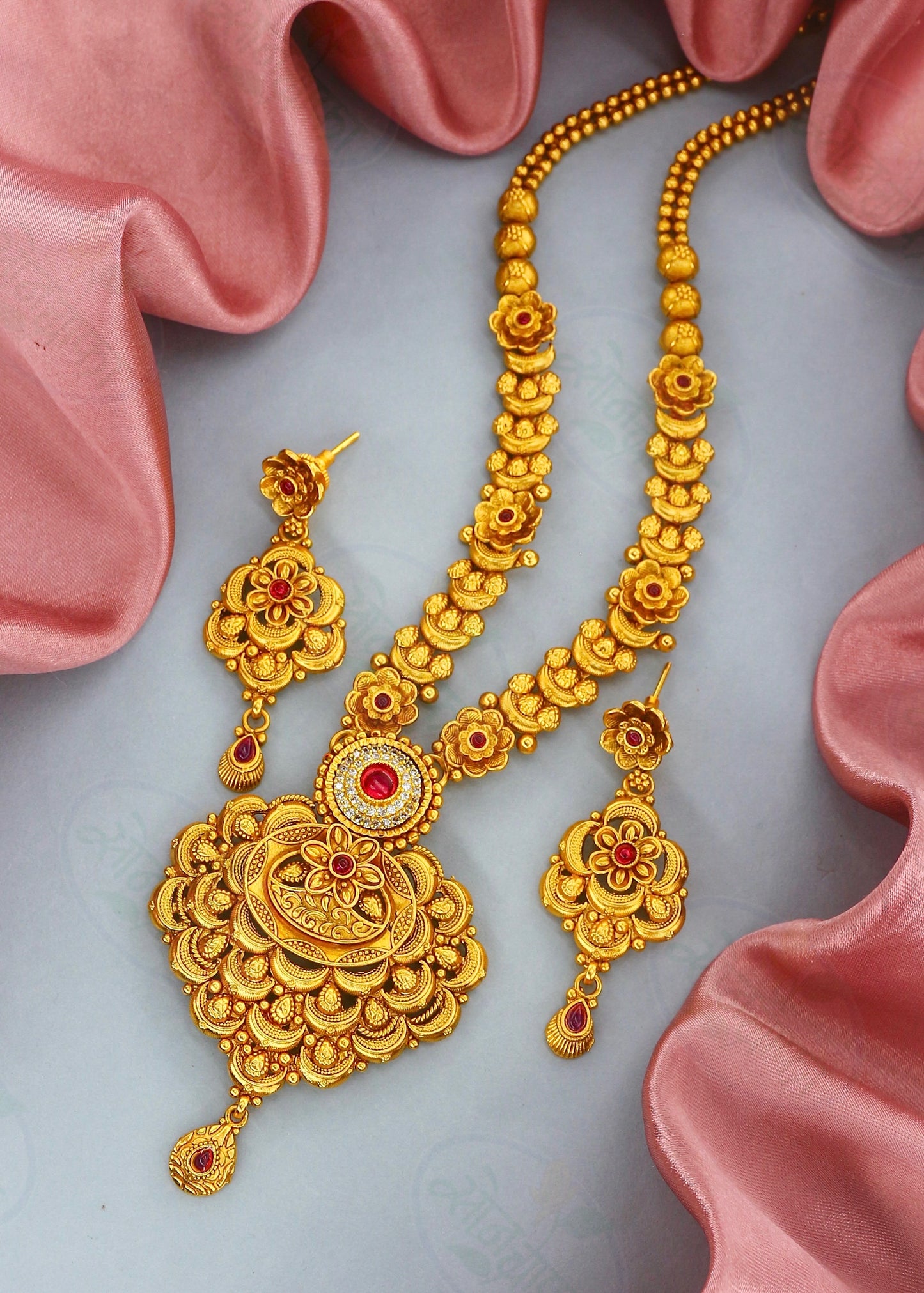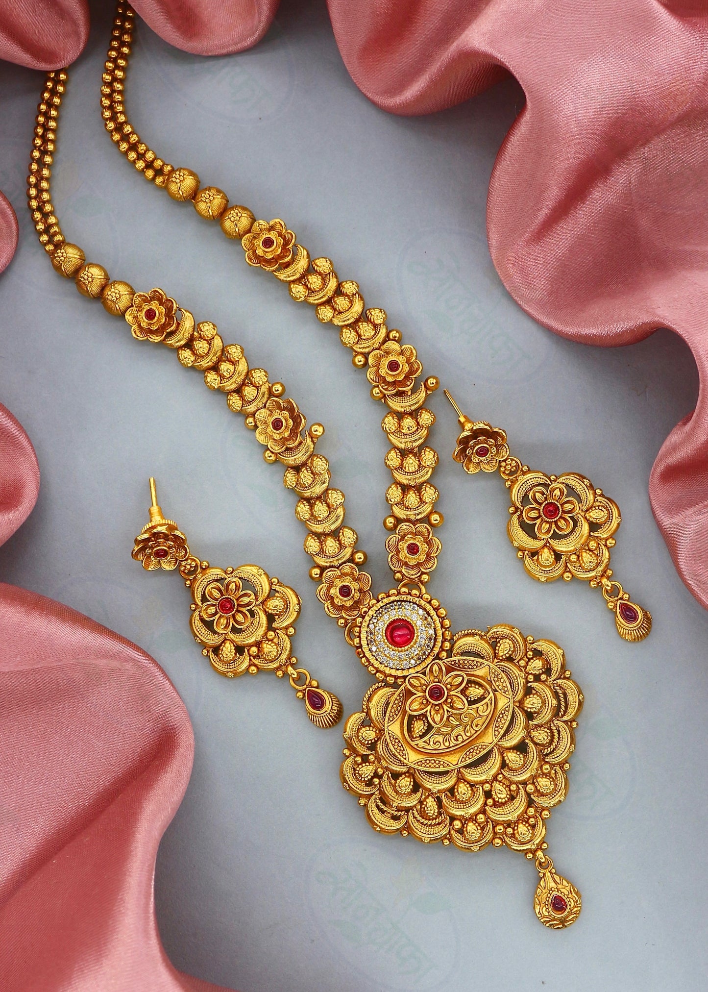This super elegant rajwadi necklace set is perfect for everyday wear as well as for special occasions. It is crafted from antique gold finish metal and studded with pink stone, white stone.