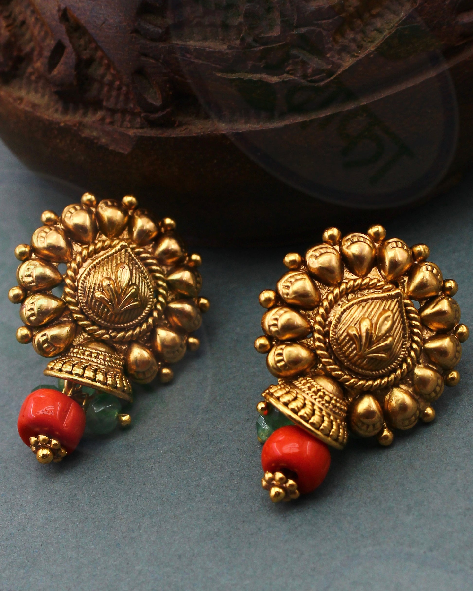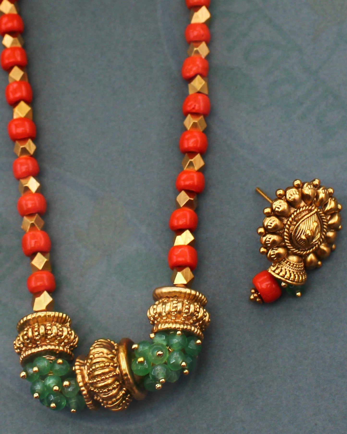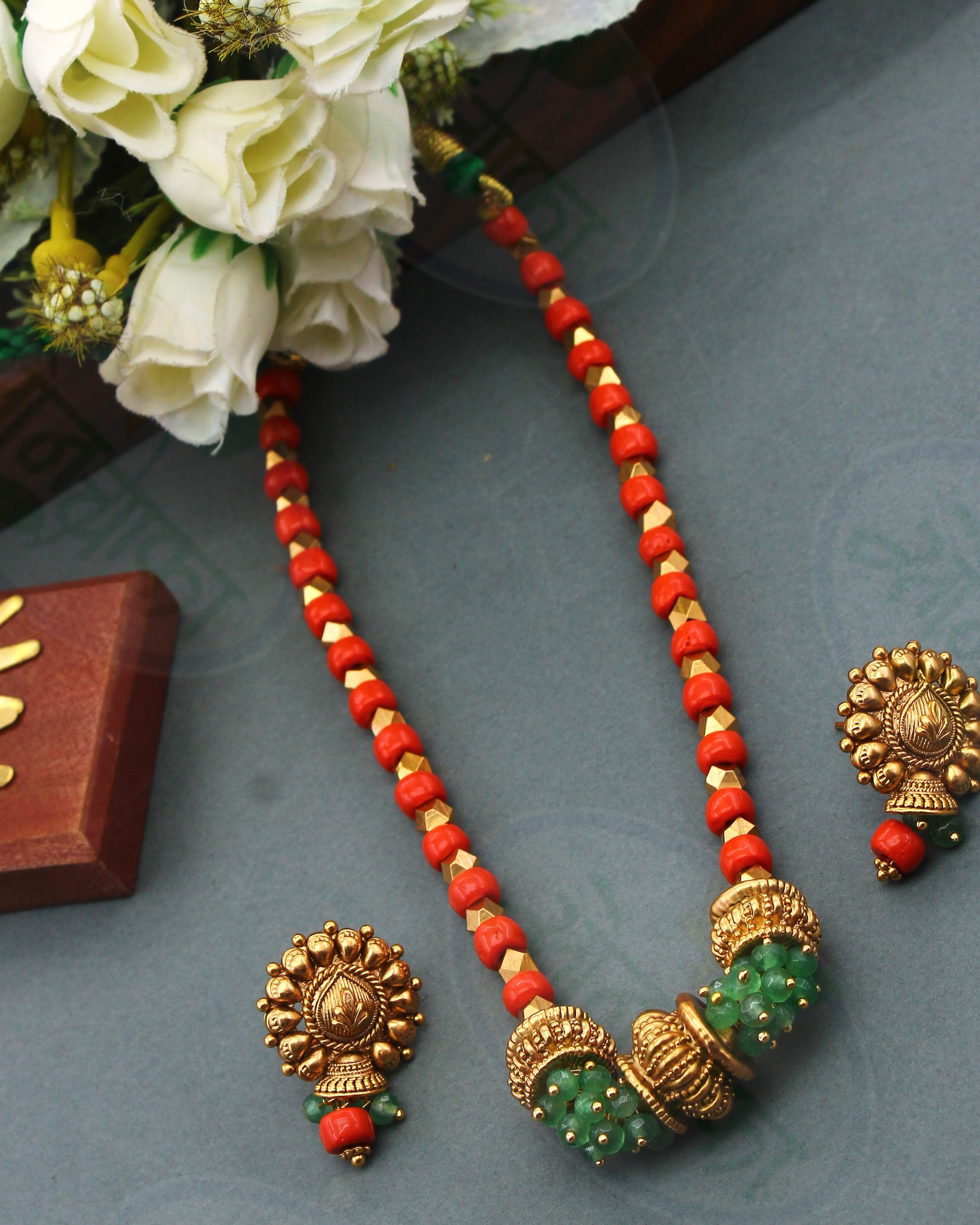 Sonchafa Jewellery presents this golden finish rajasi necklace for stylish women lie you. It is embedded with orange beads and crafted from golden finish metal. It will surely give you attractive look and will be your fashion companion for many years.