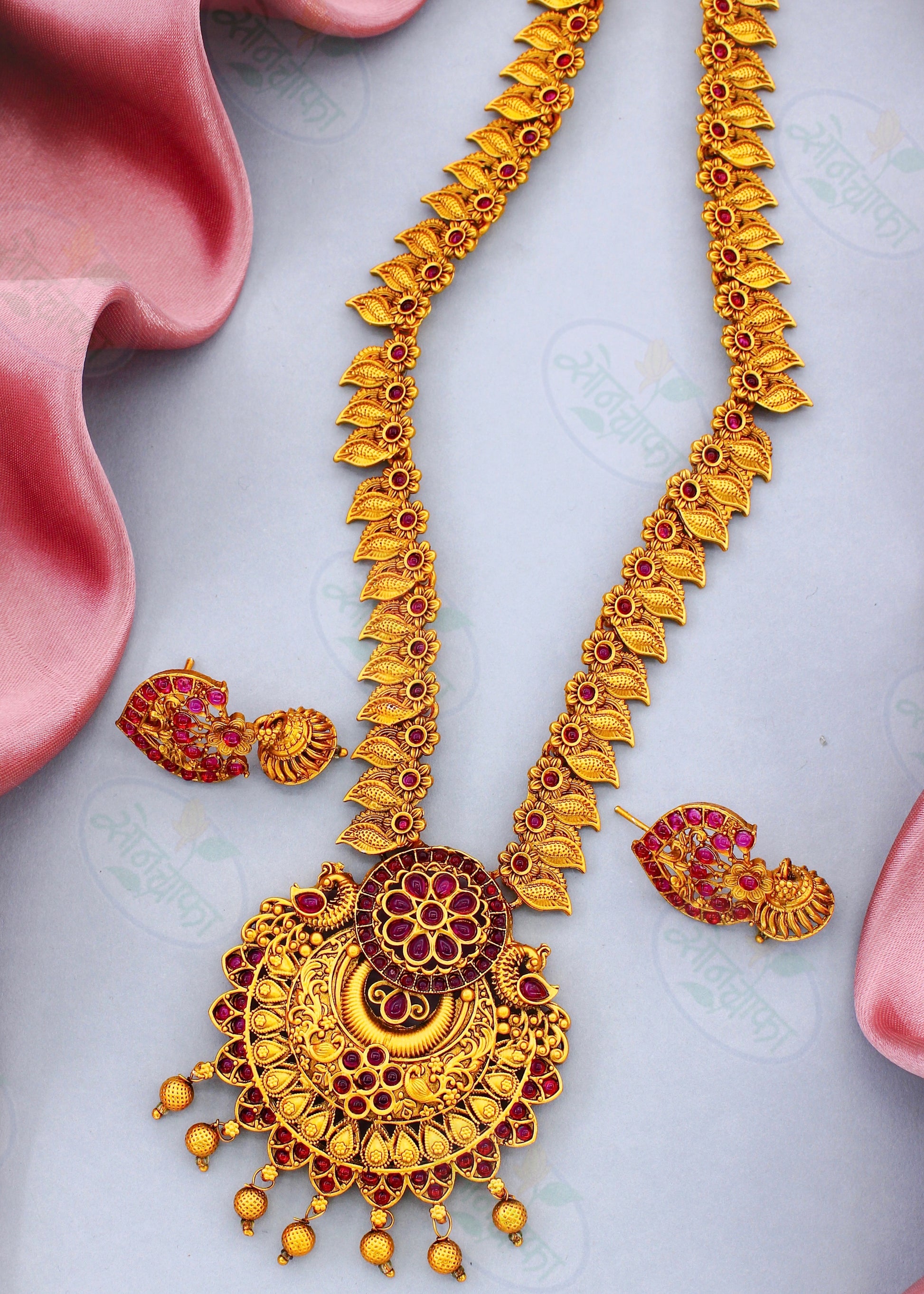 Sonchafa Jewellers brings to you this peacock designer necklace set for modish women like you. Club this designer necklace set with your traditional costumes. It is embedded with sparkling pink stones and made from matte golden finish metal. It also has beautifully designed earrings. It is woven with stunning peacock design. This long necklace set is superior in quality and rust-resistant as well.
