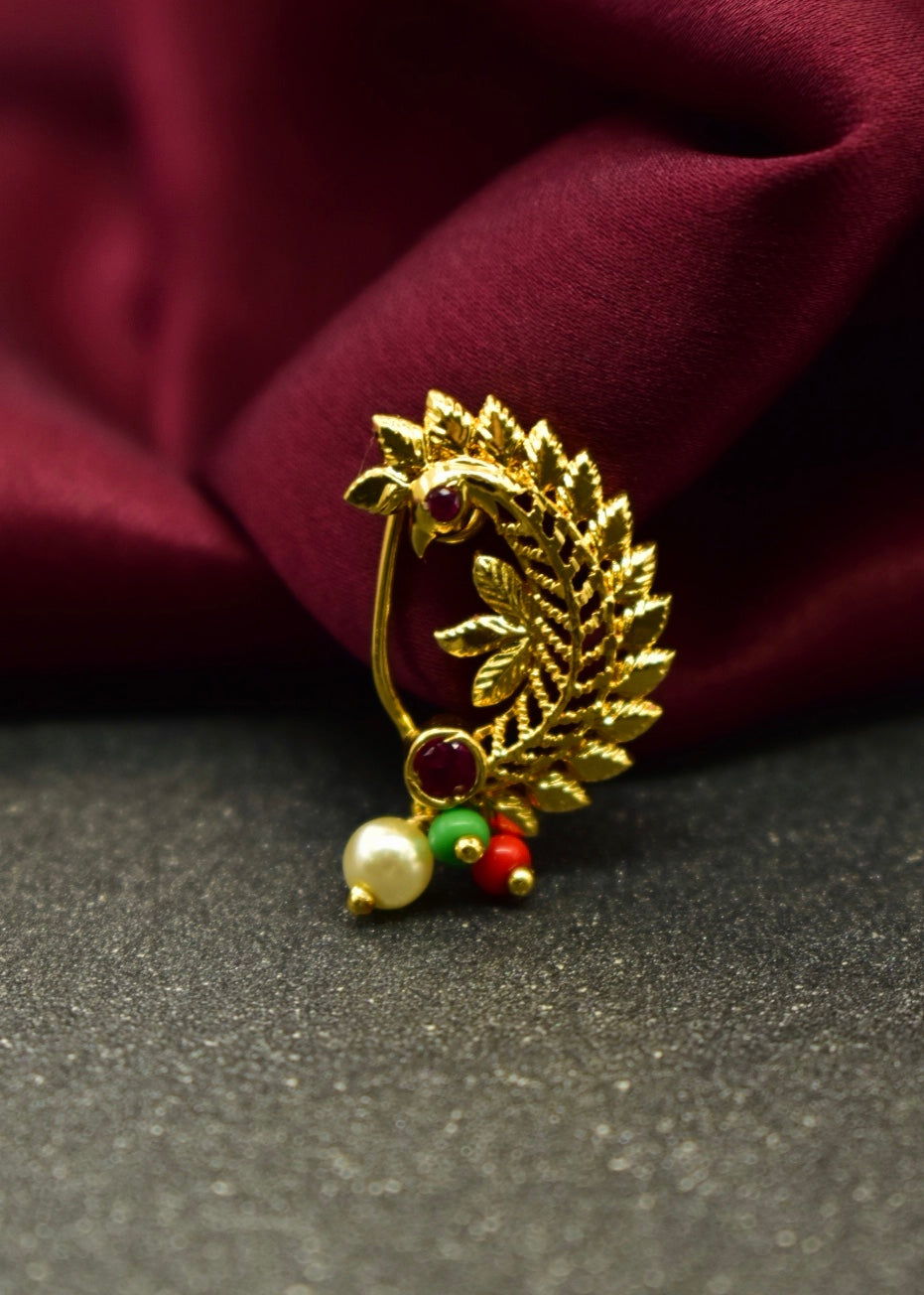 Creatively designed this golden colored Maharashtrian nath from Sonchafa Jewellery is perfect for your traditional ppearance. It is styled with sparkling pink stones & green-red-white pearl beads. This beautiful nath is fashioned from purely golden polished metal.