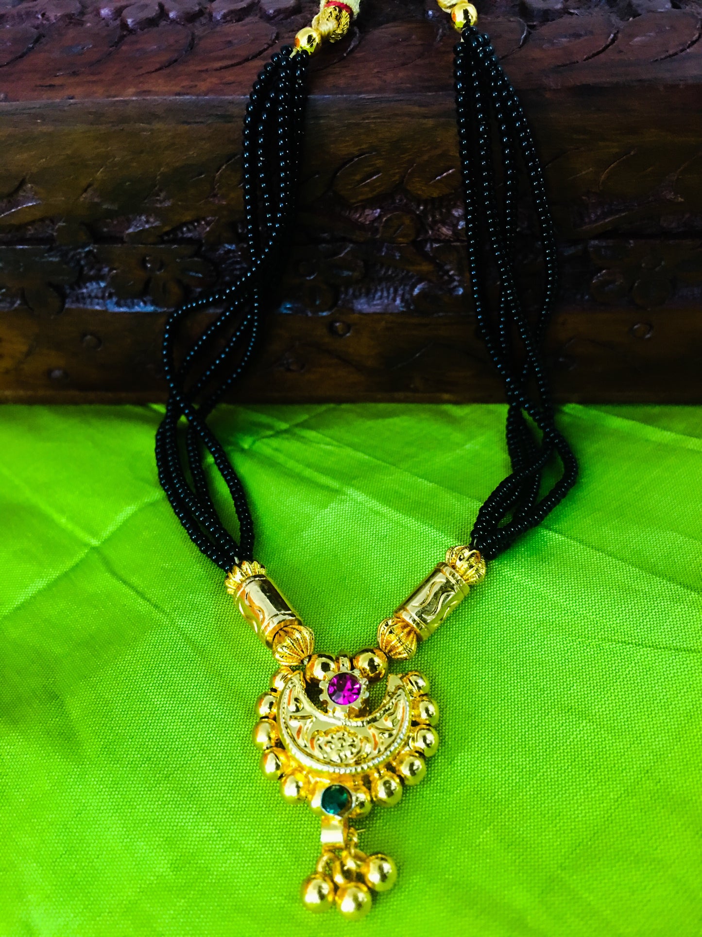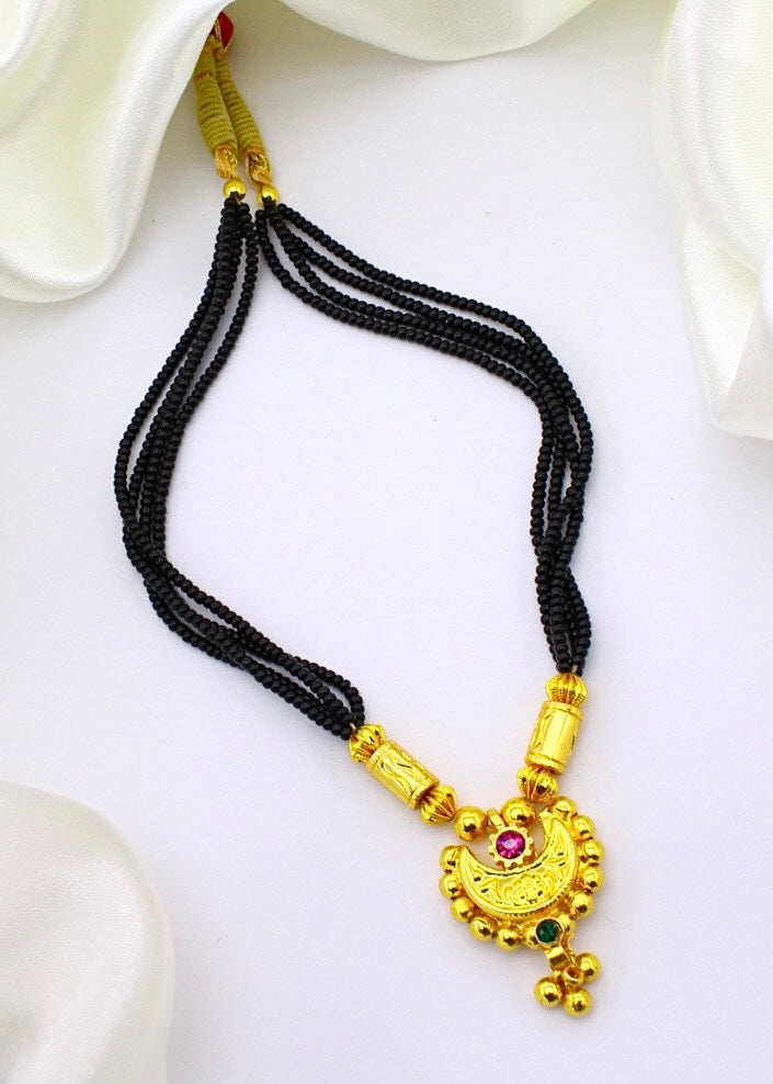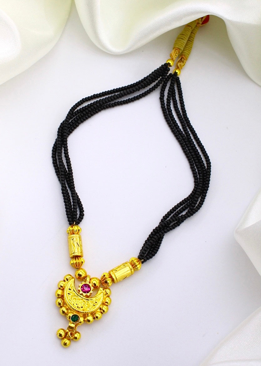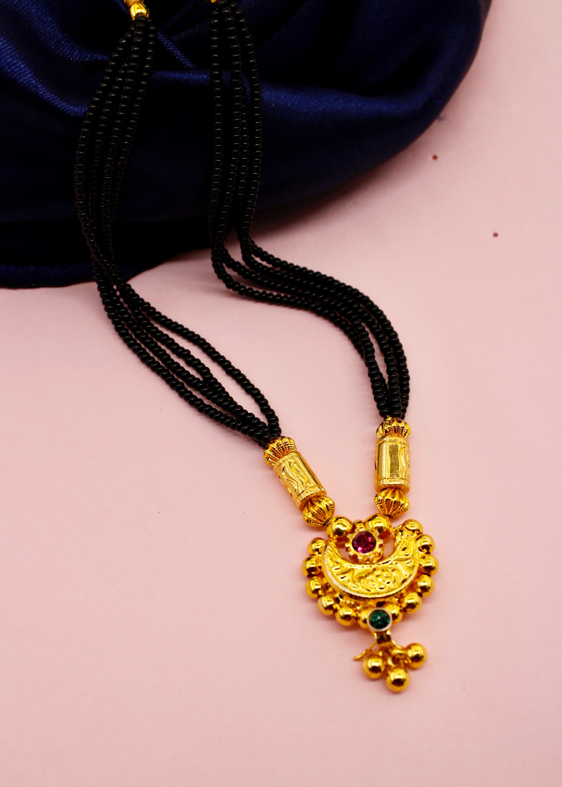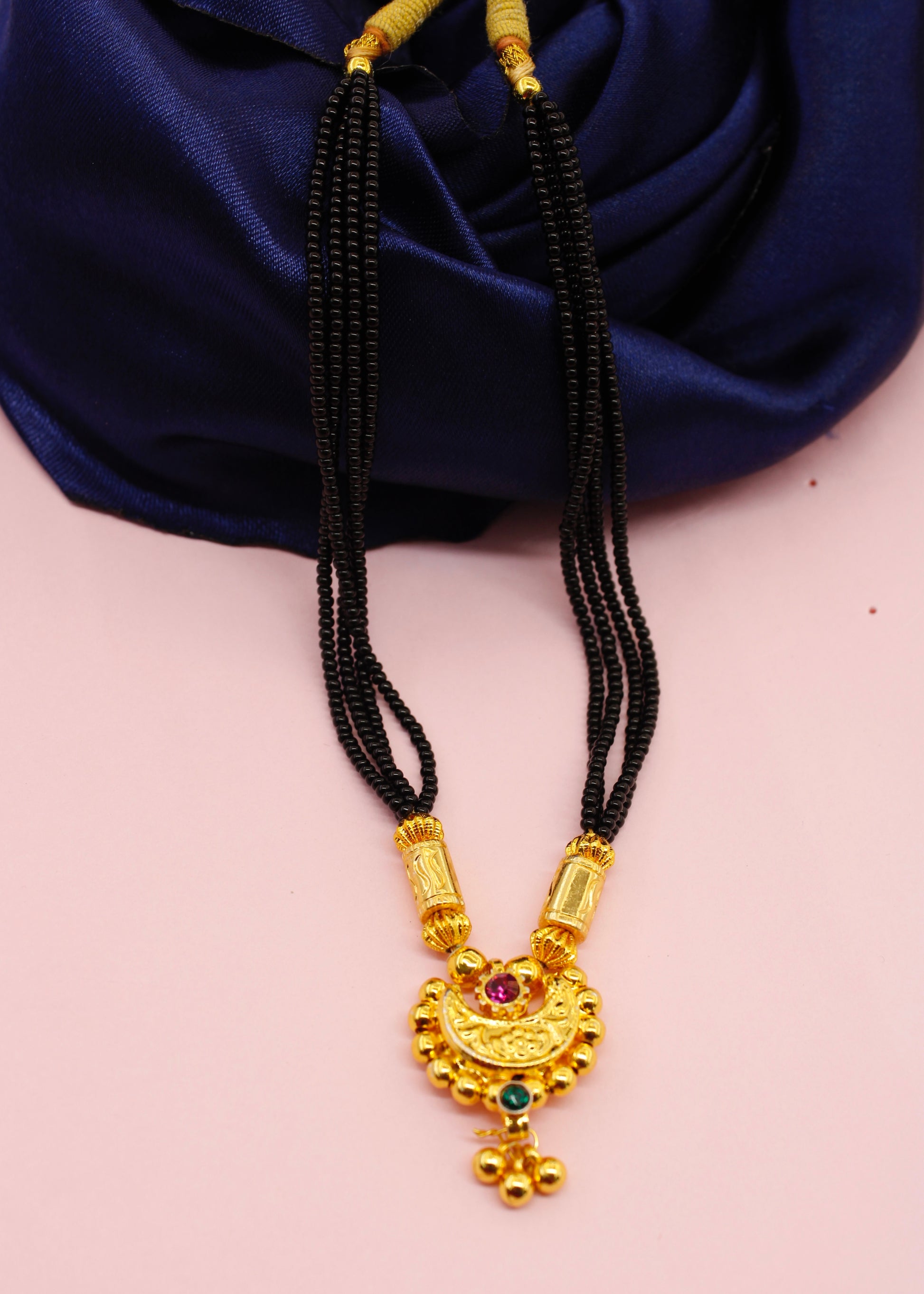 This season Sonchafa Jewellery offers this golden finish beautiful mangalsutra for you. It is wonderfully woven with golden beads and has half-moon (chandrakor) pendant decked with sparkling pink, green colour stone. This mangalsutra comes with adjustable dori, so that you could fit it properly according to you neck.