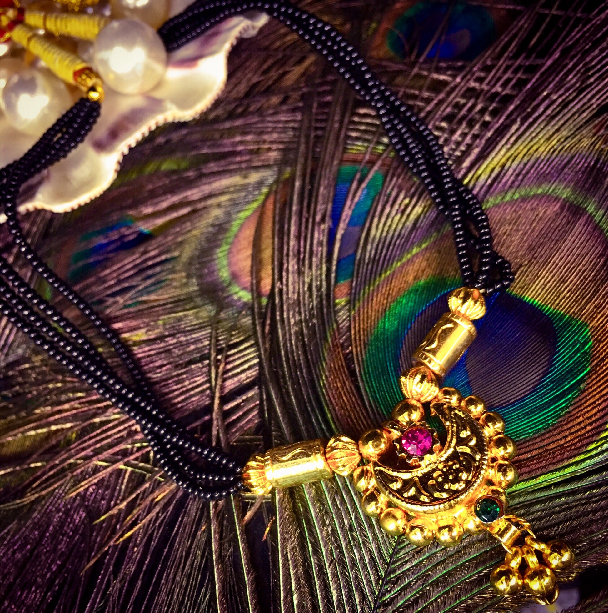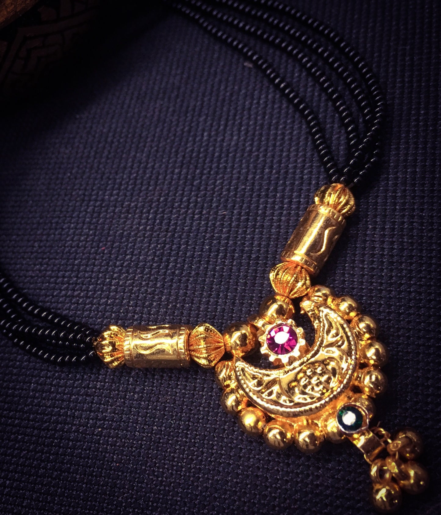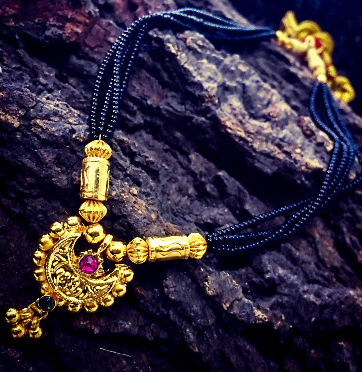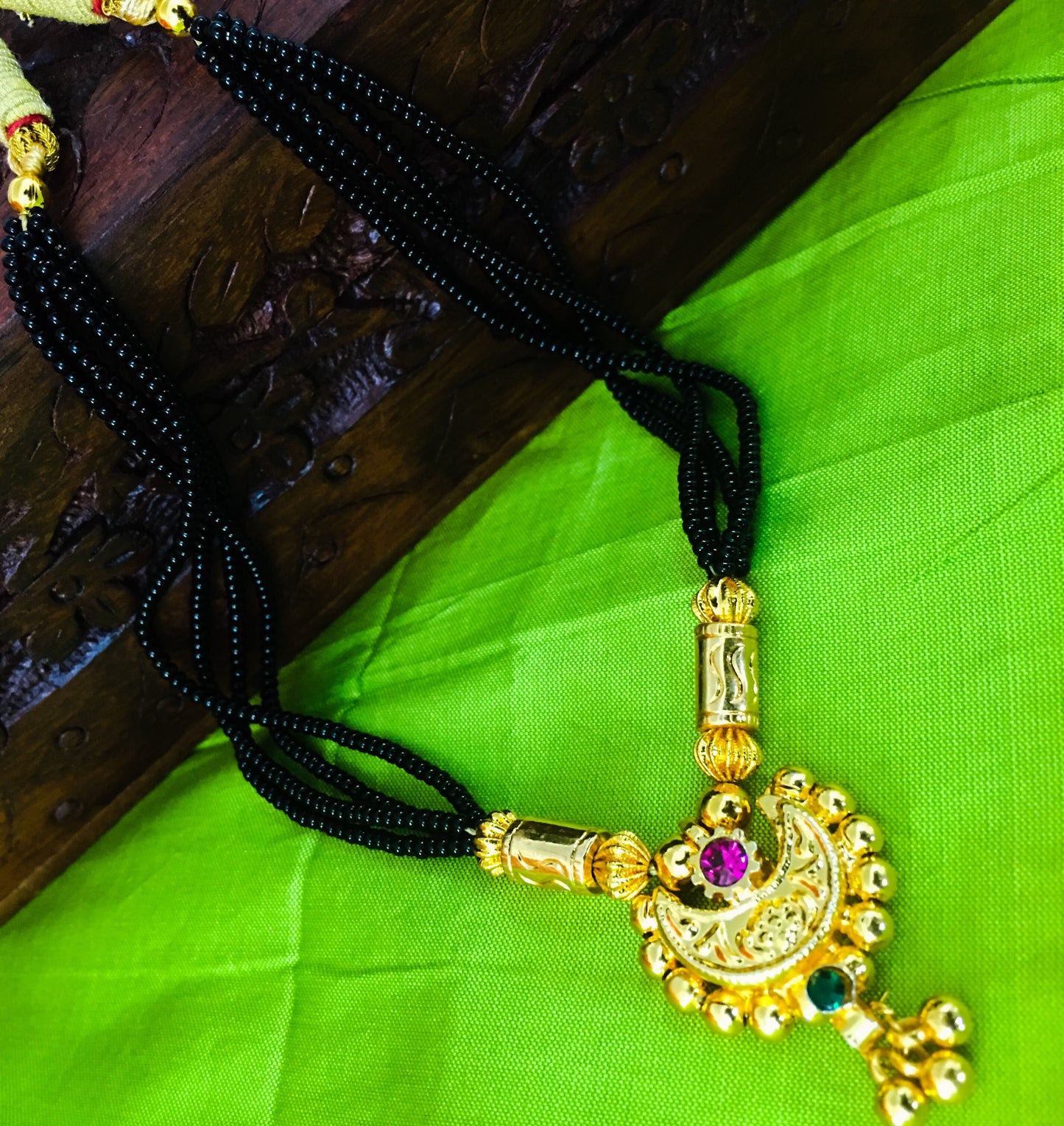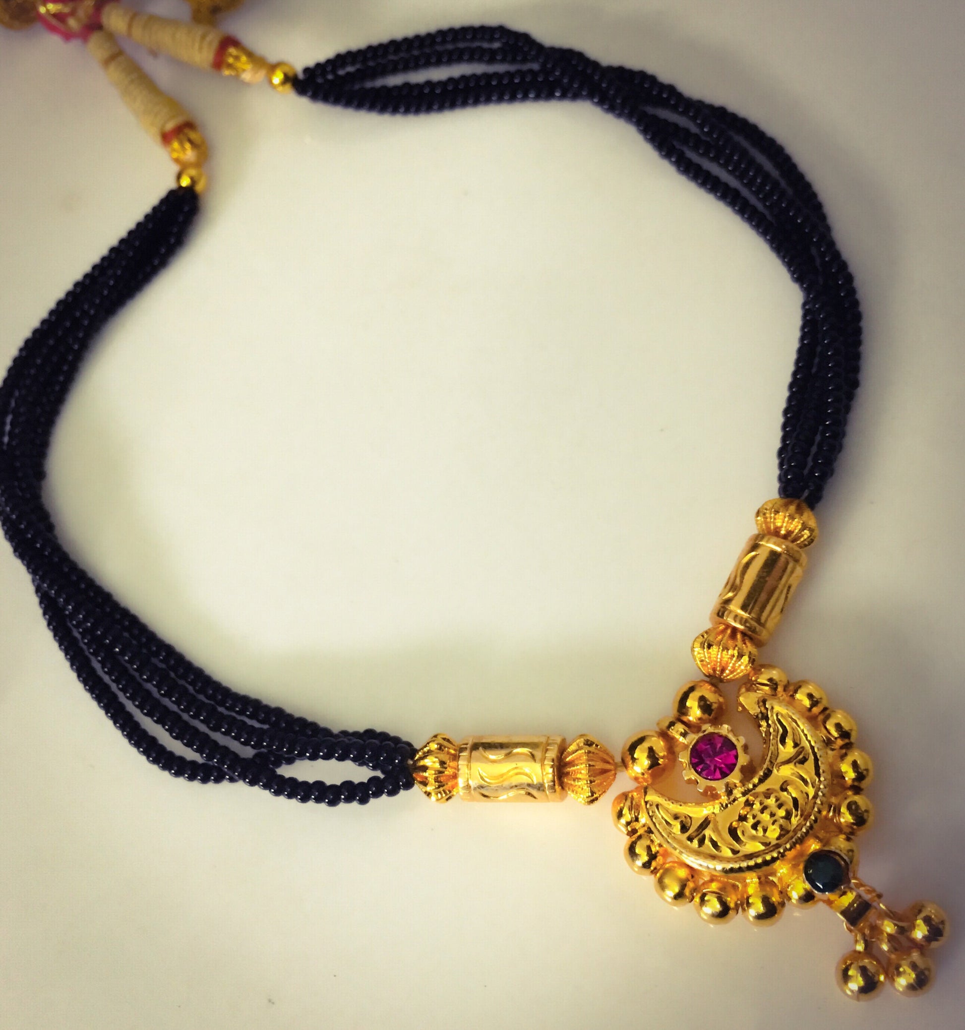 This season Sonchafa Jewellery offers this golden finish beautiful mangalsutra for you. It is wonderfully woven with golden beads and has half-moon (chandrakor) pendant decked with sparkling pink, green colour stone. This mangalsutra comes with adjustable dori, so that you could fit it properly according to you neck.
