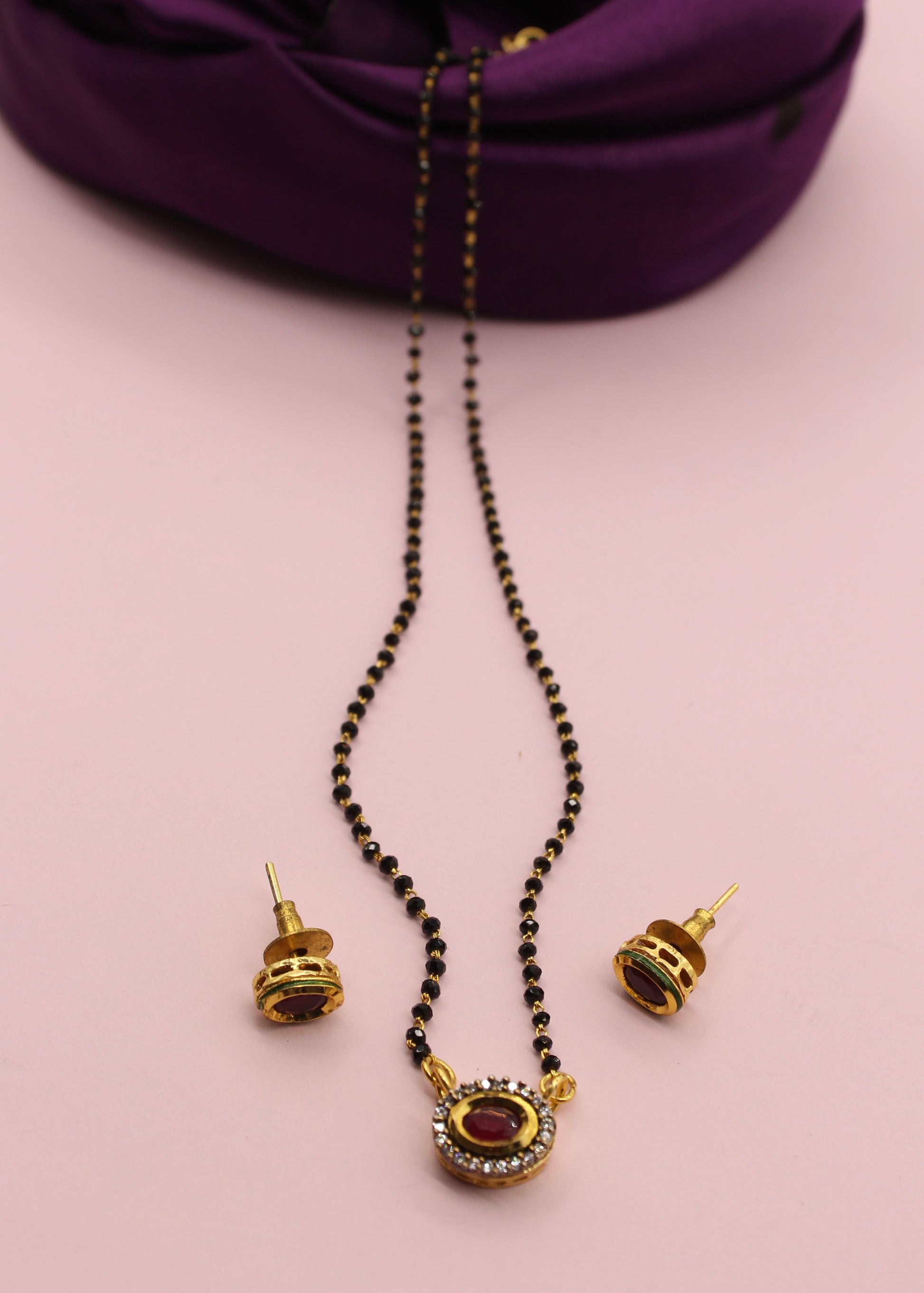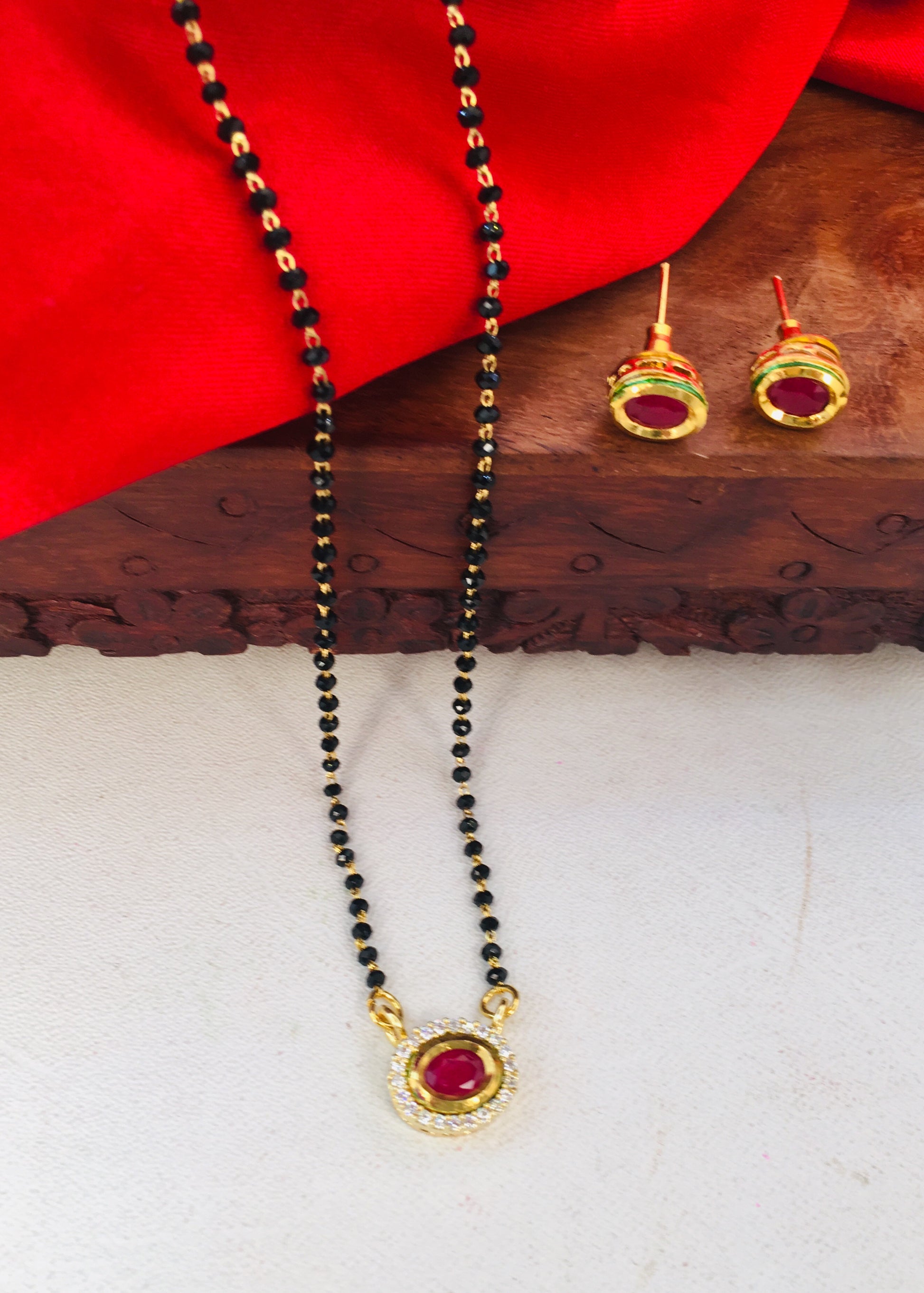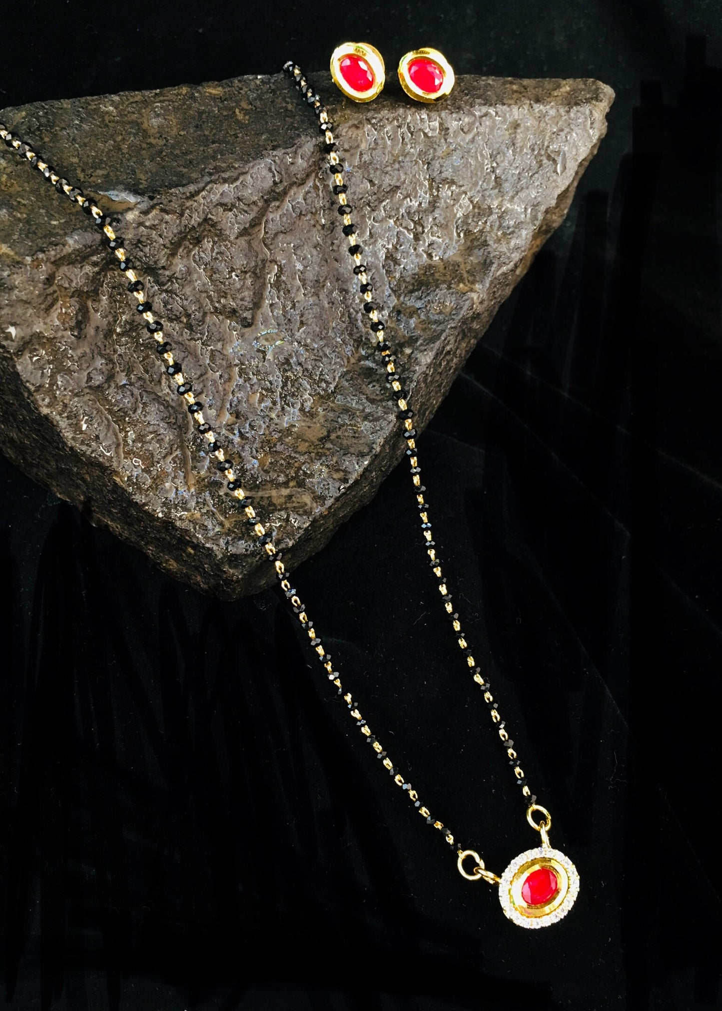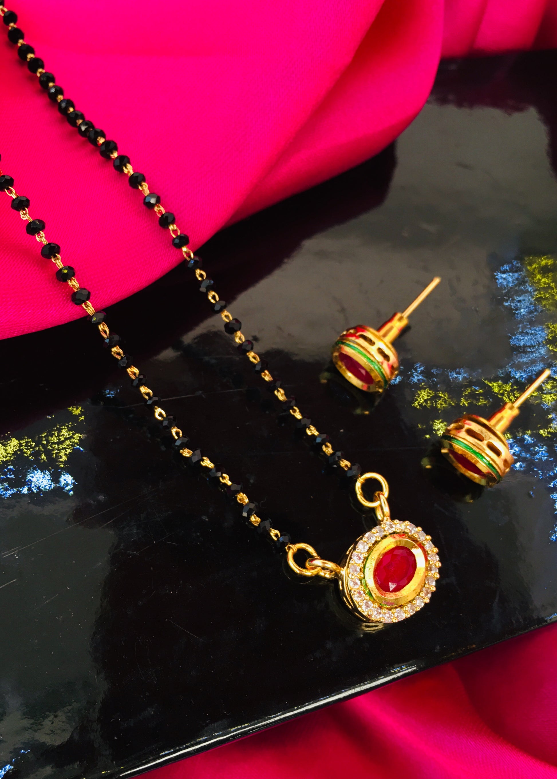 Red colour designer mangalsutra set from Sonchafa Jewellery will strike you at very first look. The oval shape designer pendant is studded with precious white diamonds along with red colour stone and made from golden finish metal. In addition the pendant has attachment of beautiful mangalsutra black beaded chain. It is good in quality and will be your fashion companion for many years.