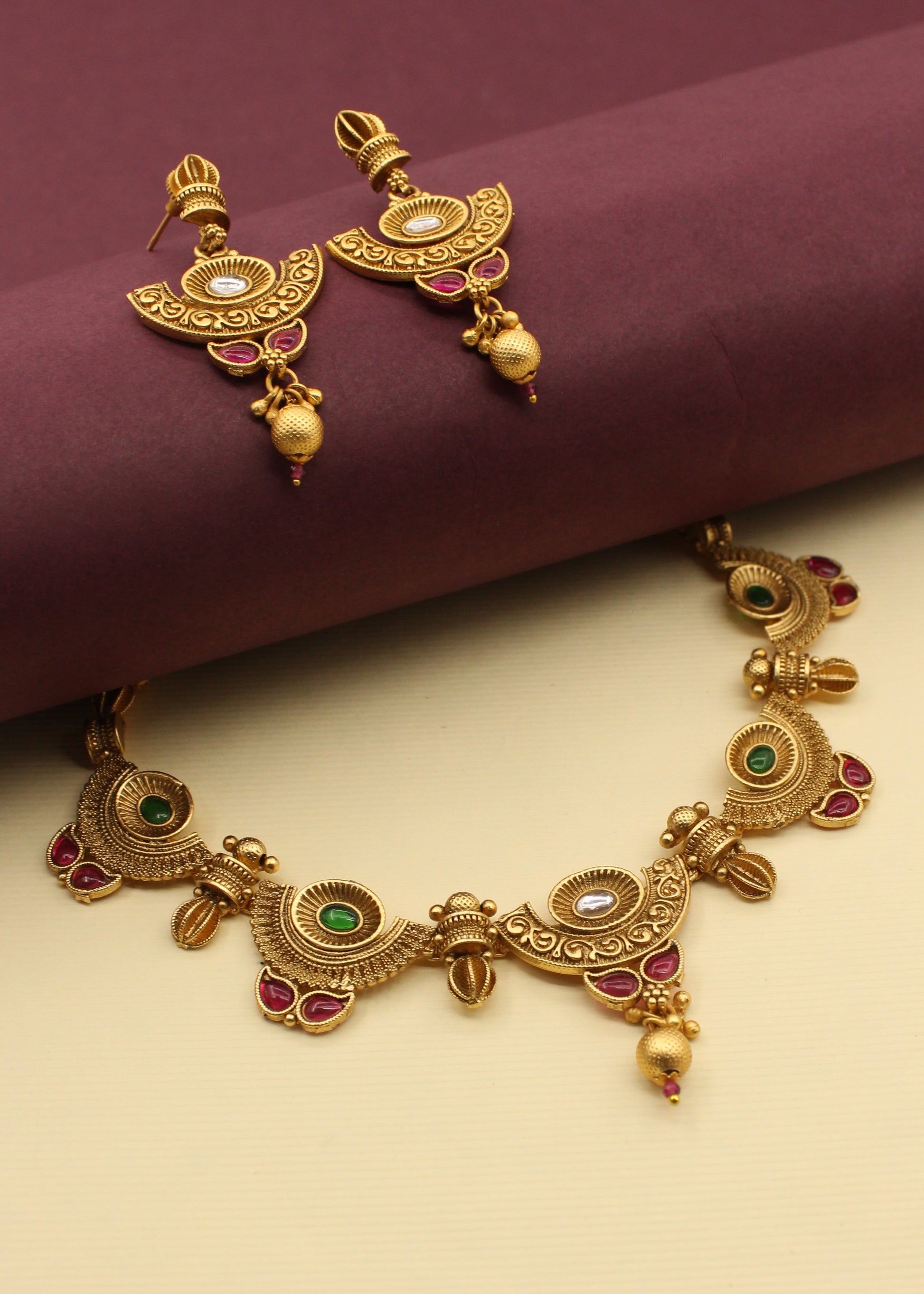 Sonchafa Jewellery brings to you this antique gold finish designer Ahilya necklace set with your festive costume. It is encrusted with pink, green stone and white kundan along with dangling golden beads. The design of this necklace is unique and worth noticing. This piece of jewellery will fetch you lots of compliments from onlookers for your amazing choice.