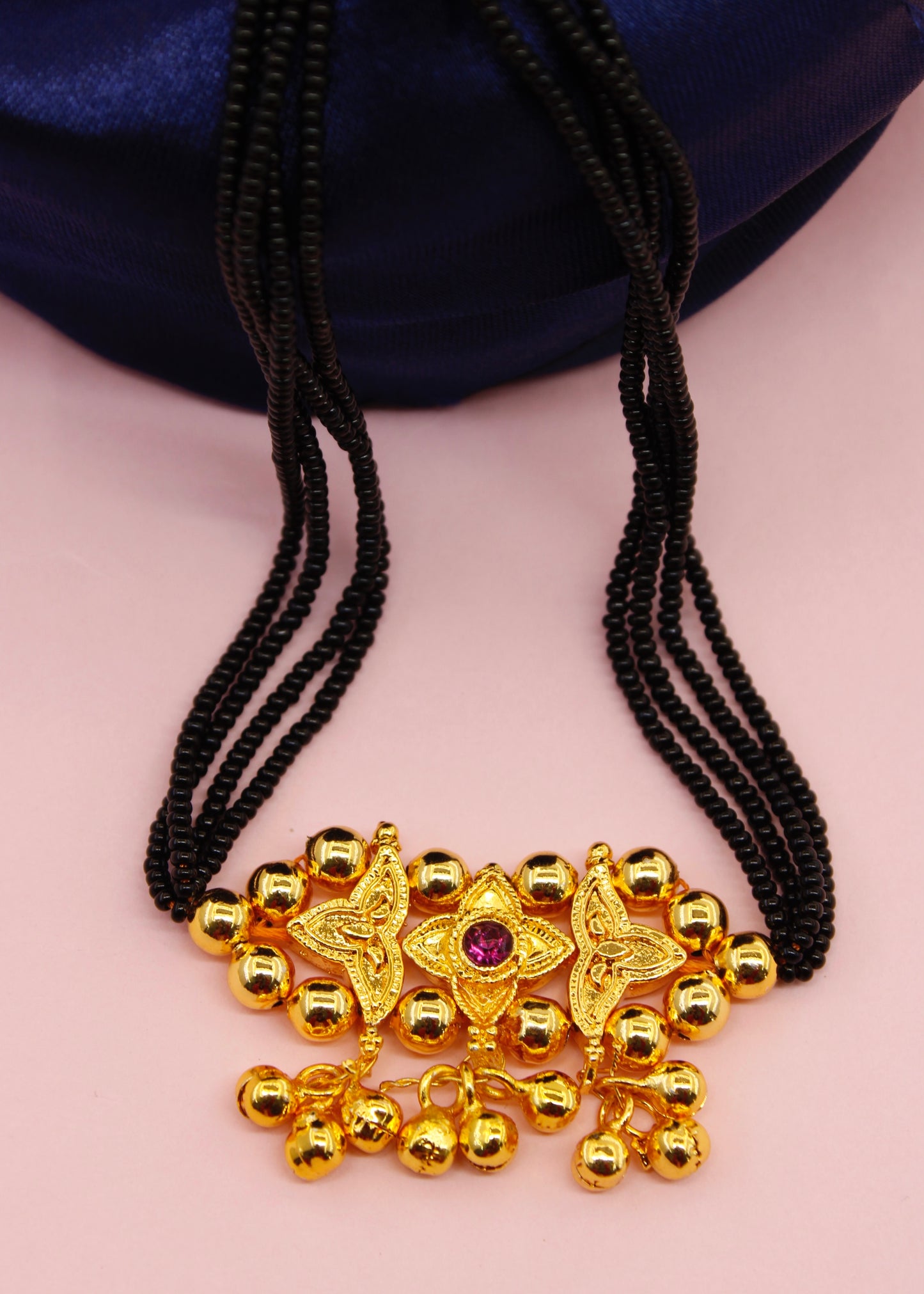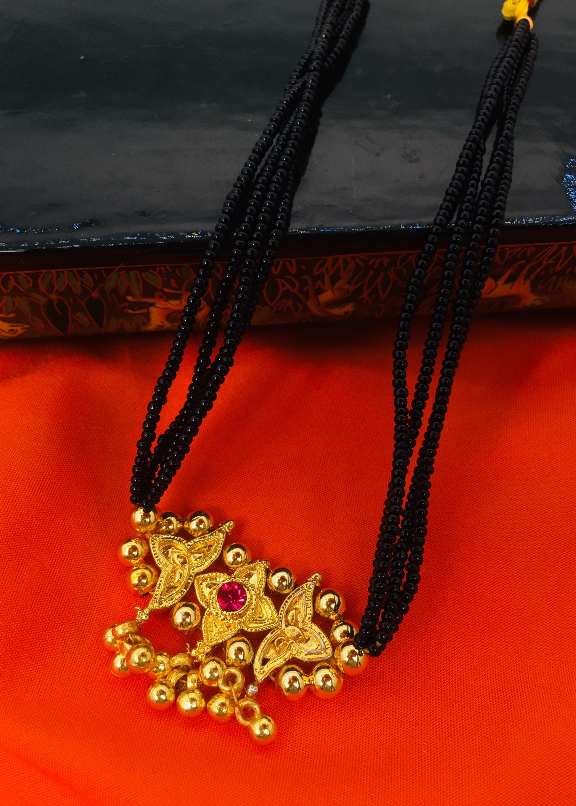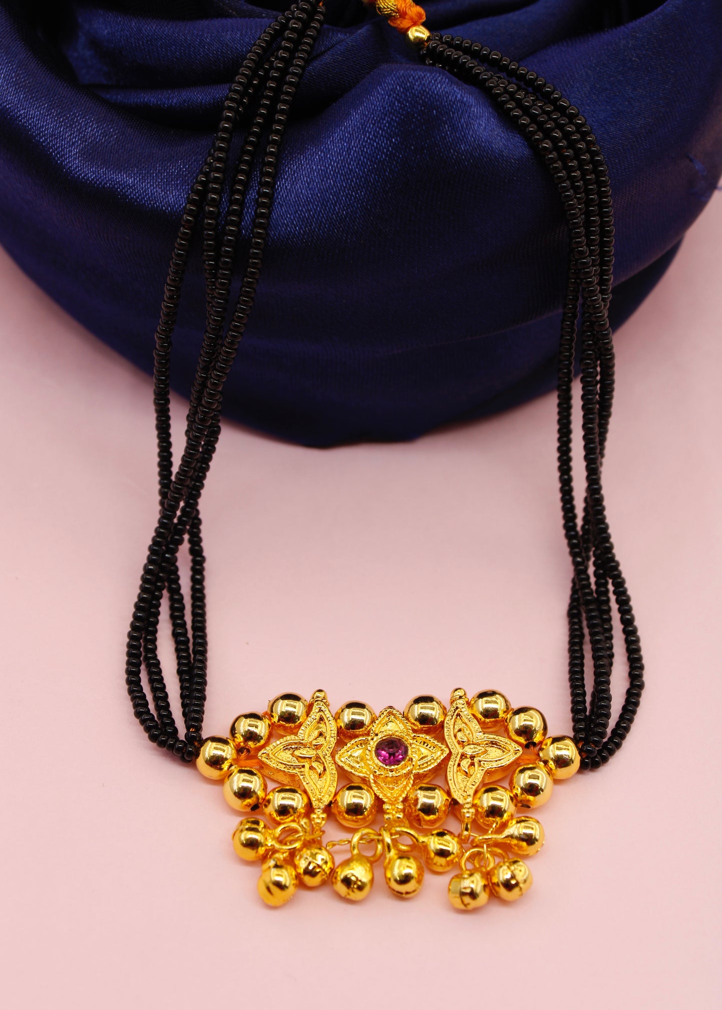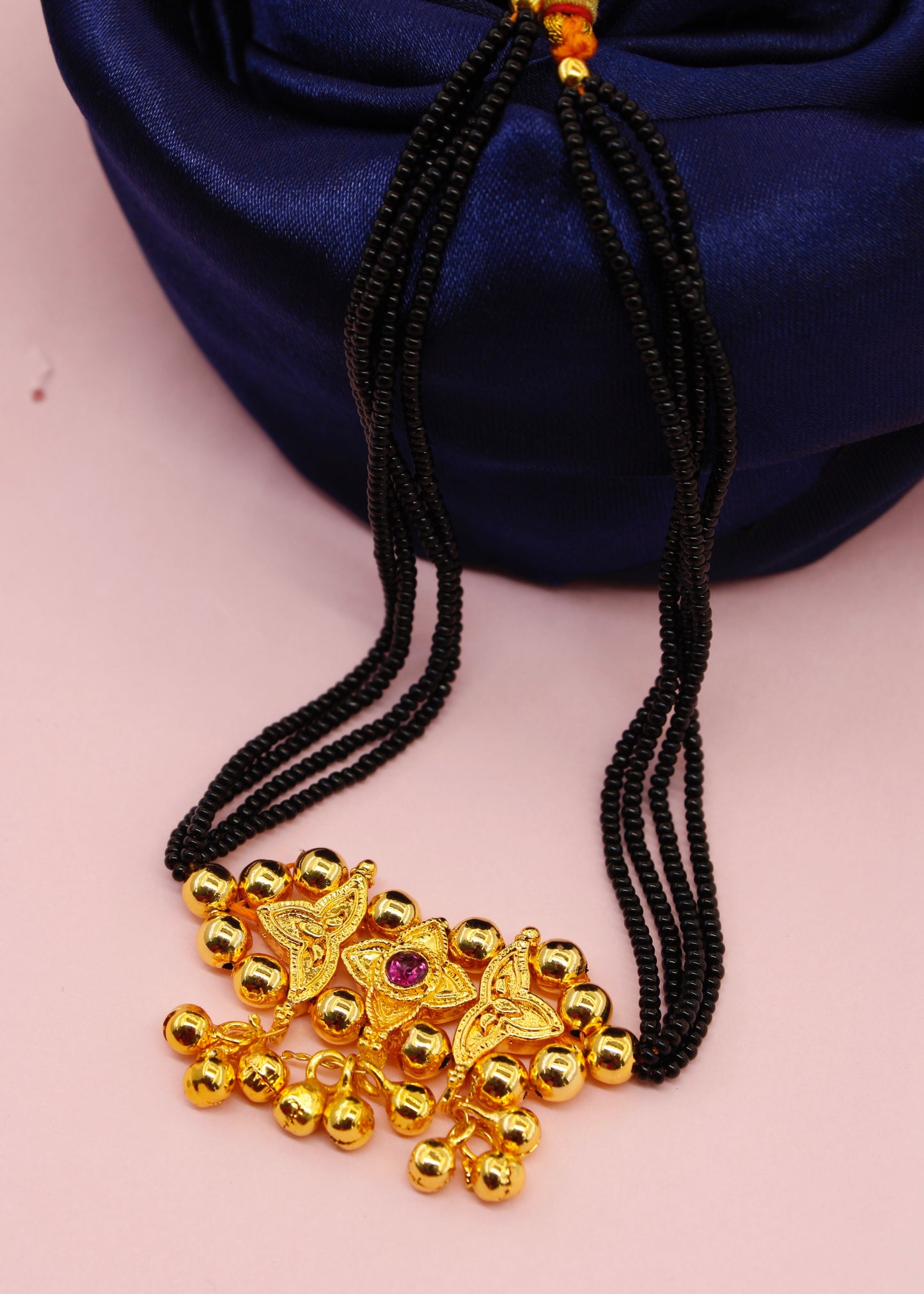 Simple Belpaan Mangalsutra from Sonchafa jewellery with sparkling pink colour stone and made from golden finish metal. It is woven with golden beads and comes with adjustable dori, Caring for your fashion jewellery.