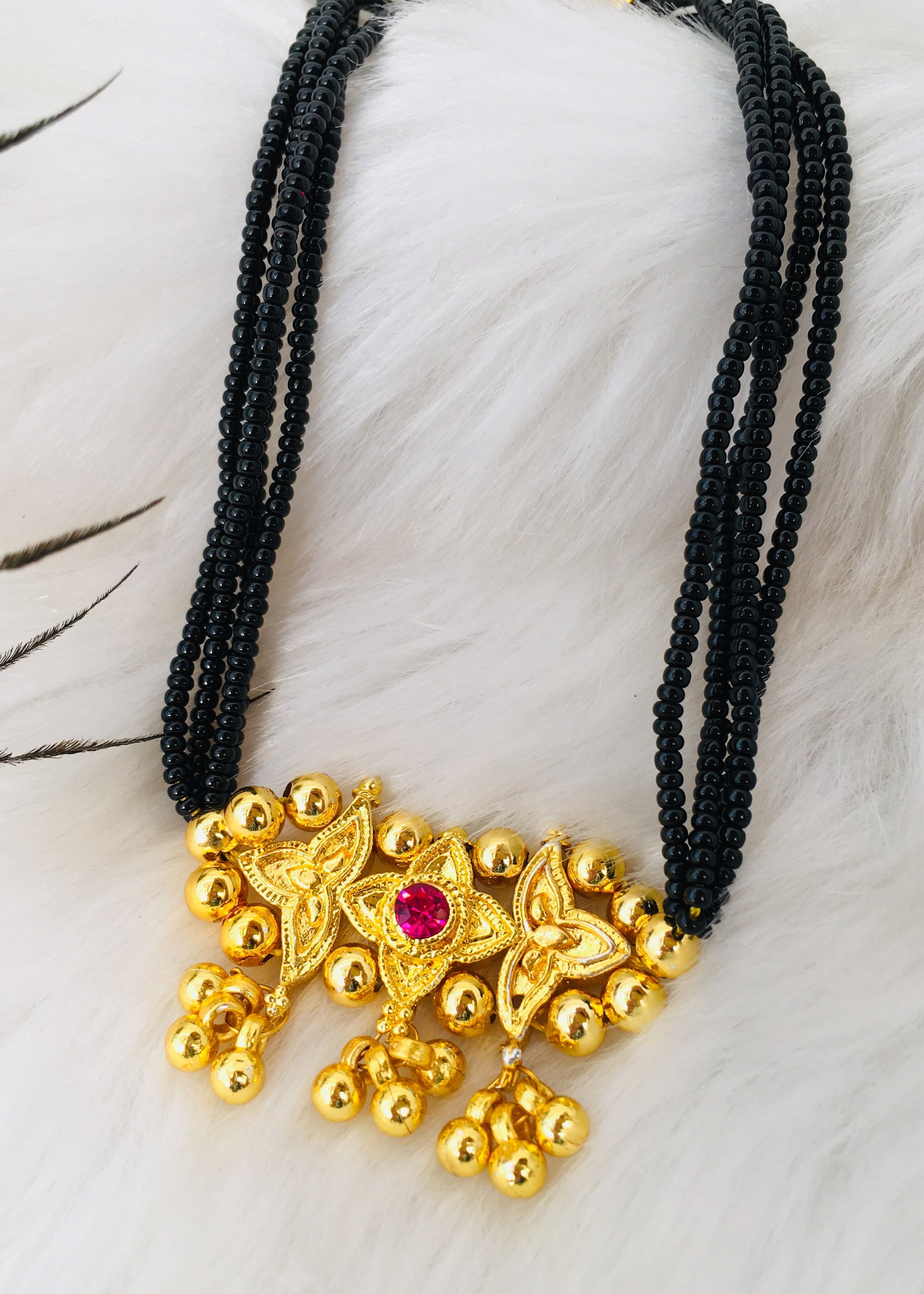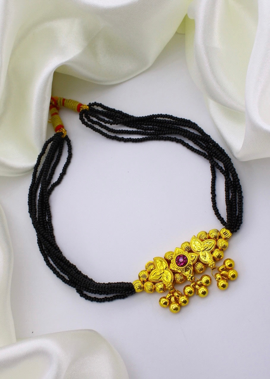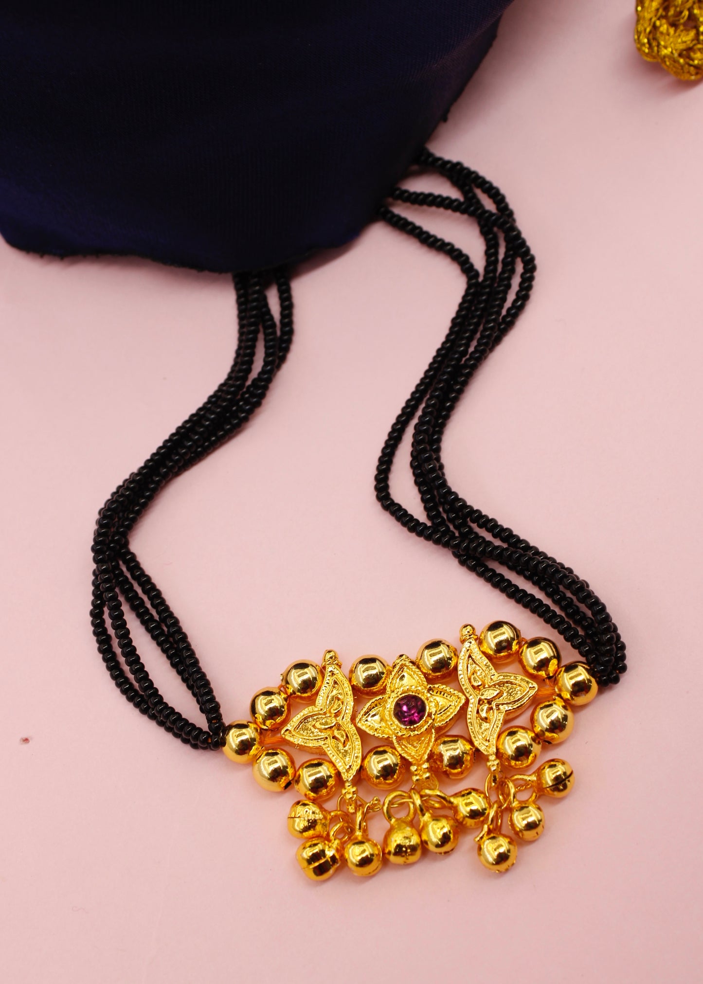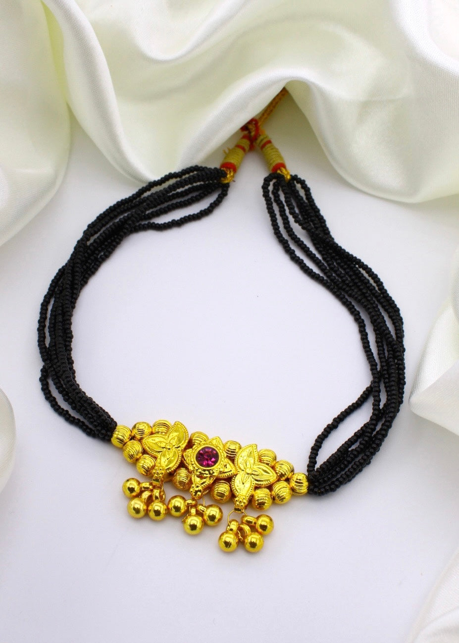 Simple Belpaan Mangalsutra from Sonchafa jewellery with sparkling pink colour stone and made from golden finish metal. It is woven with golden beads and comes with adjustable dori, Caring for your fashion jewellery.