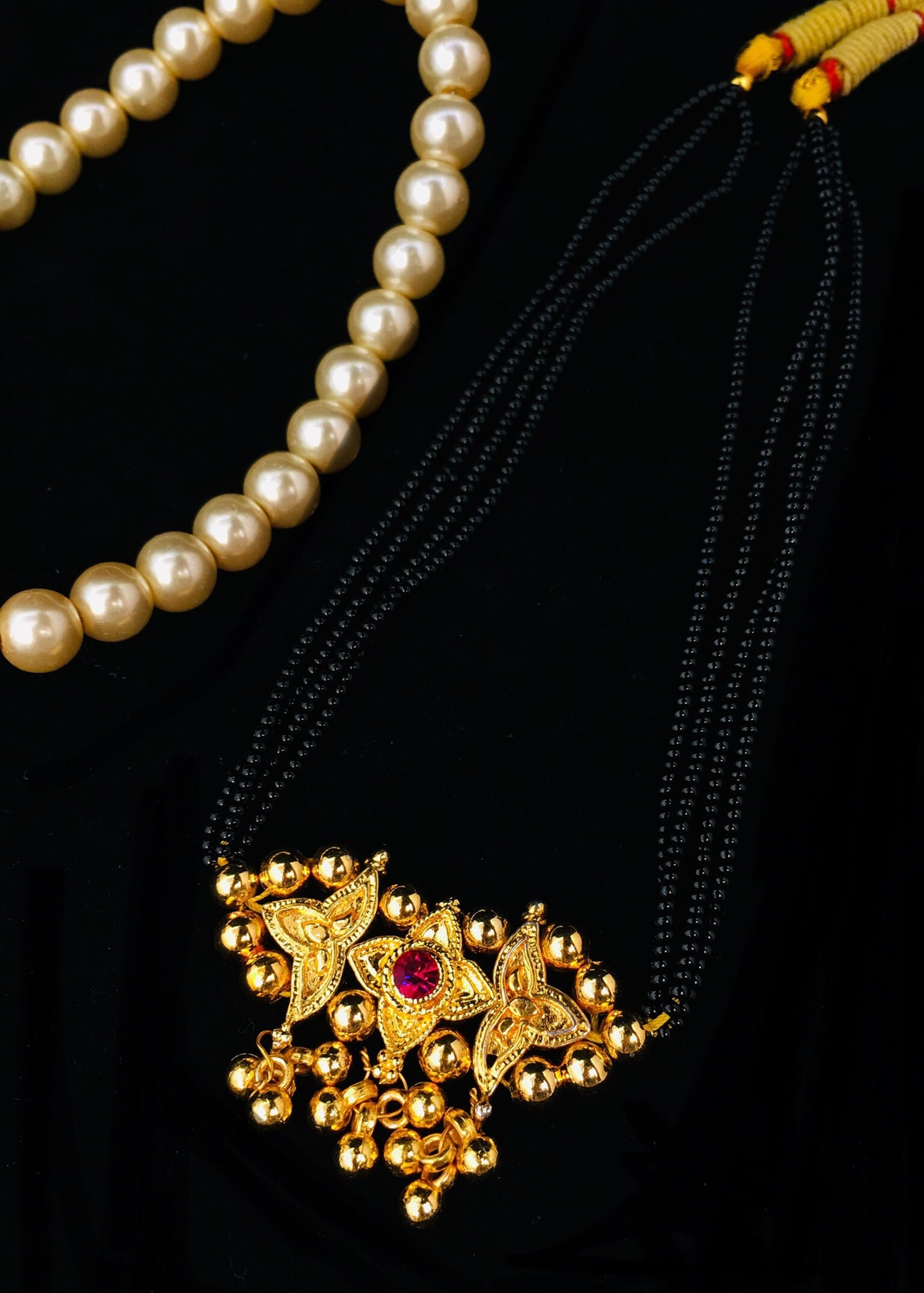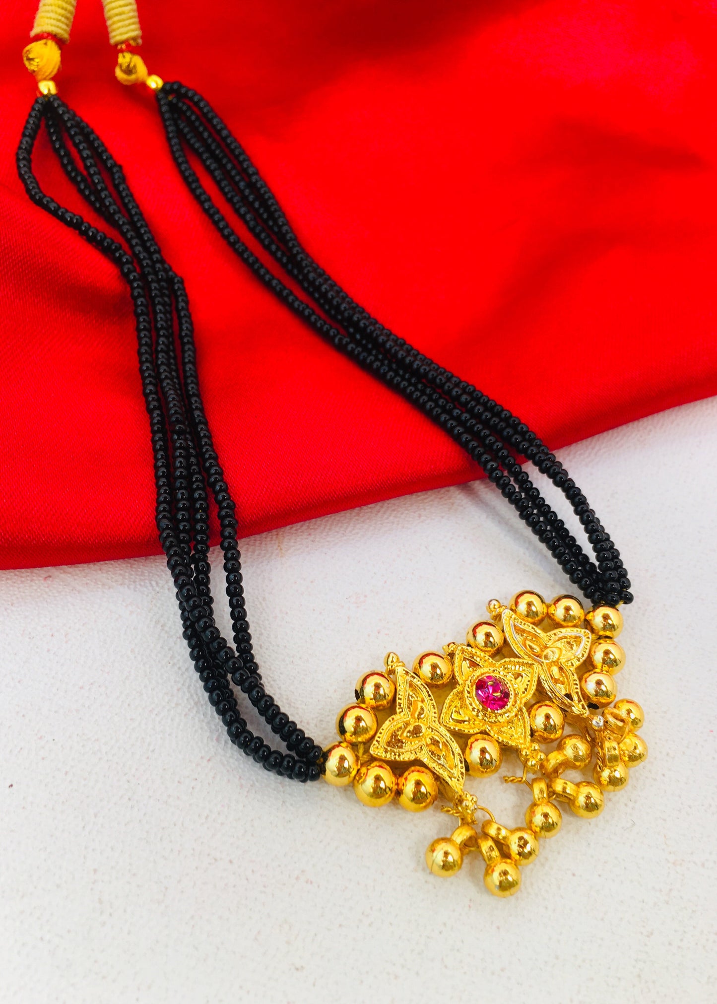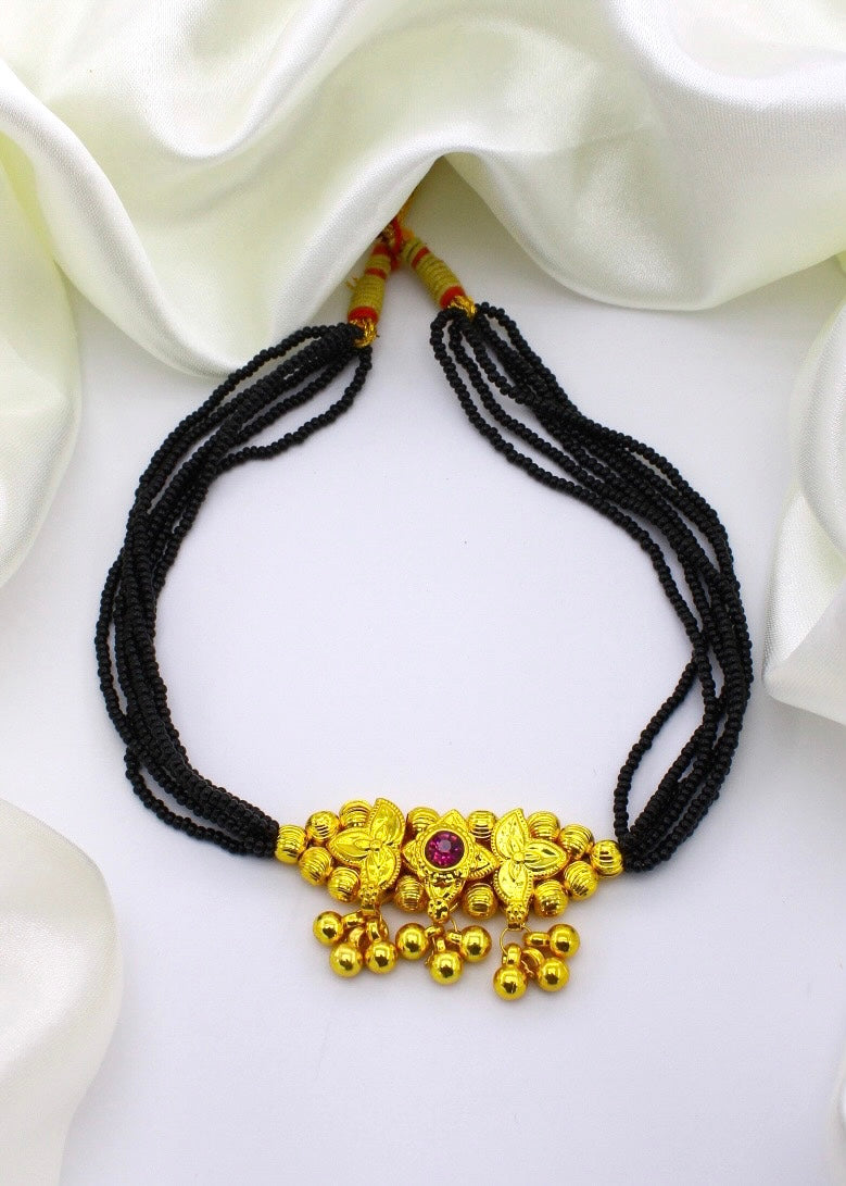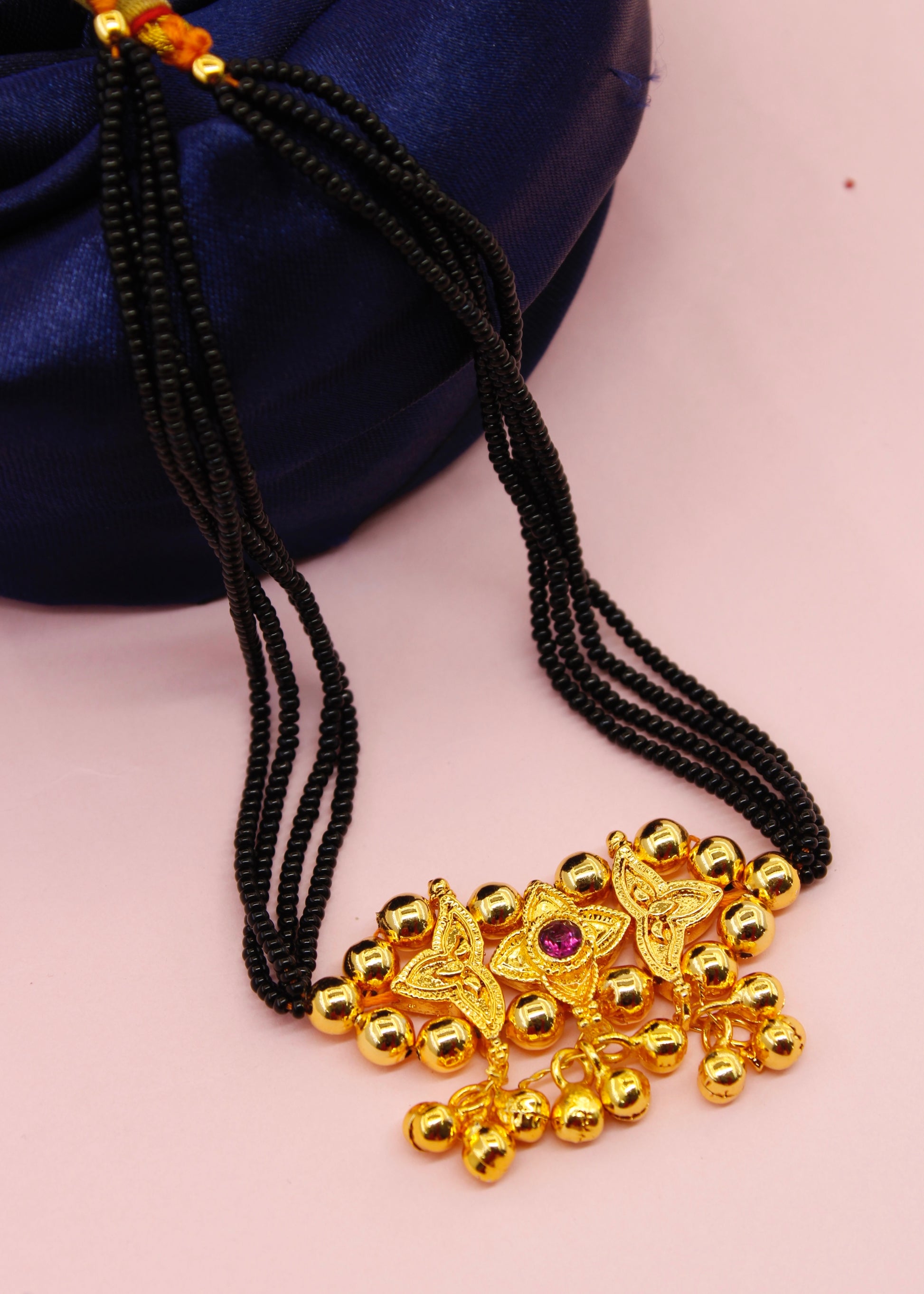 Simple Belpaan Mangalsutra from Sonchafa jewellery with sparkling pink colour stone and made from golden finish metal. It is woven with golden beads and comes with adjustable dori, Caring for your fashion jewellery.