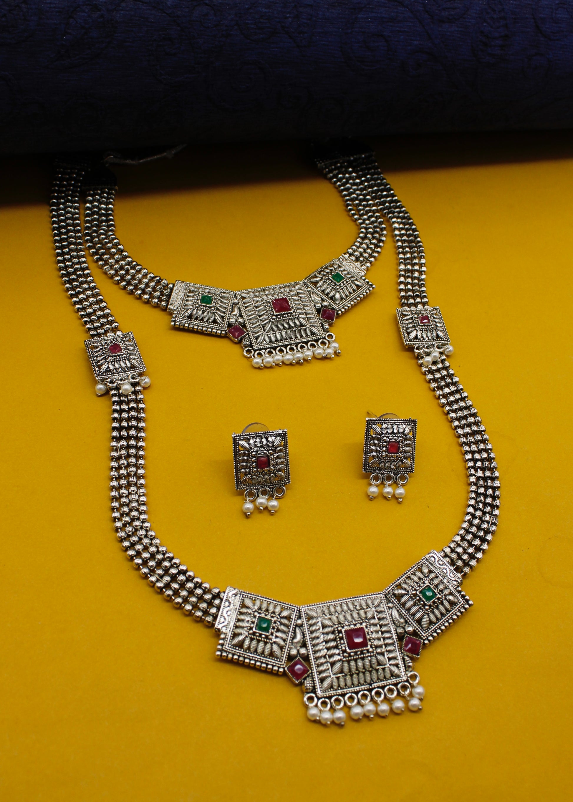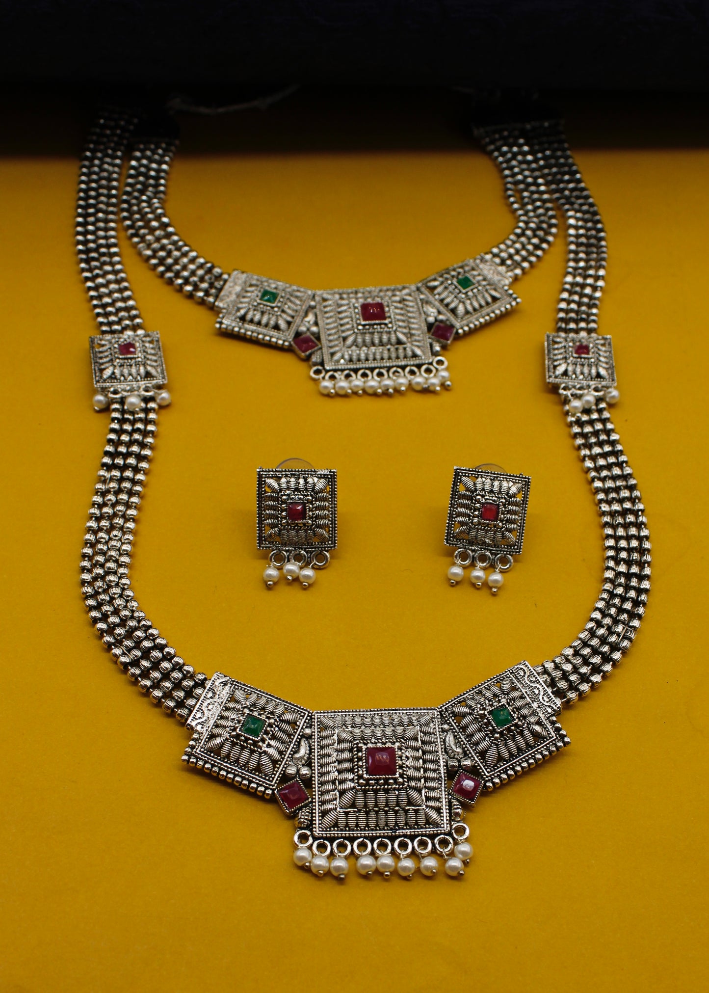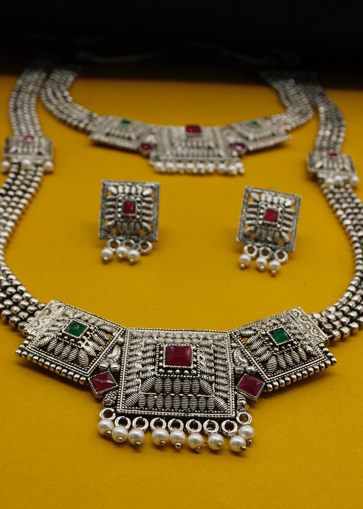 Silver oxidised necklace set form Sonchafa Jewellery for stylish women like you. It is styled with carving designs on the necklace & made from oxidised finish metal. It is woven with oxidised beads and studded with shiny pink, green stone. For your additional look it has pearl droplets.