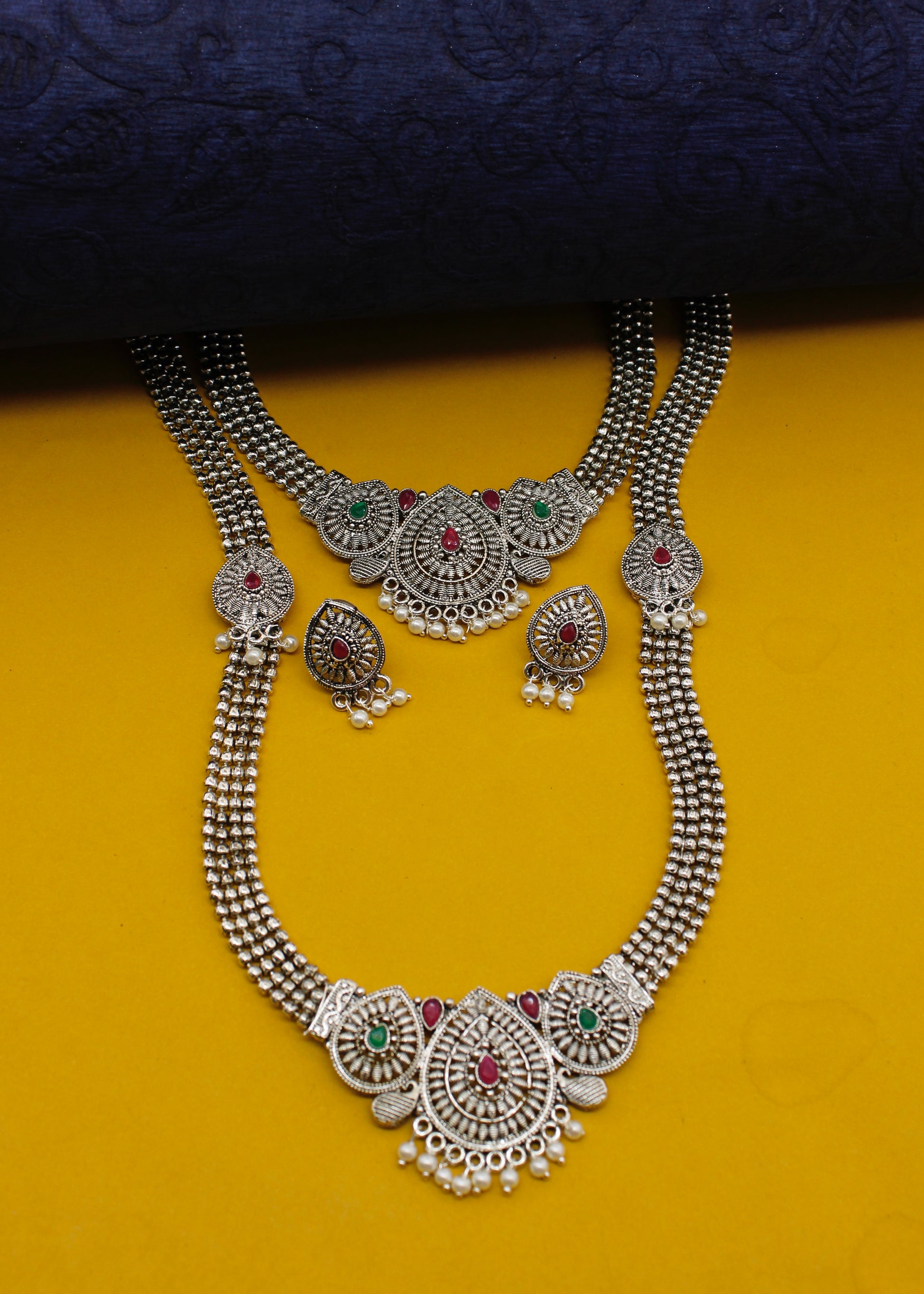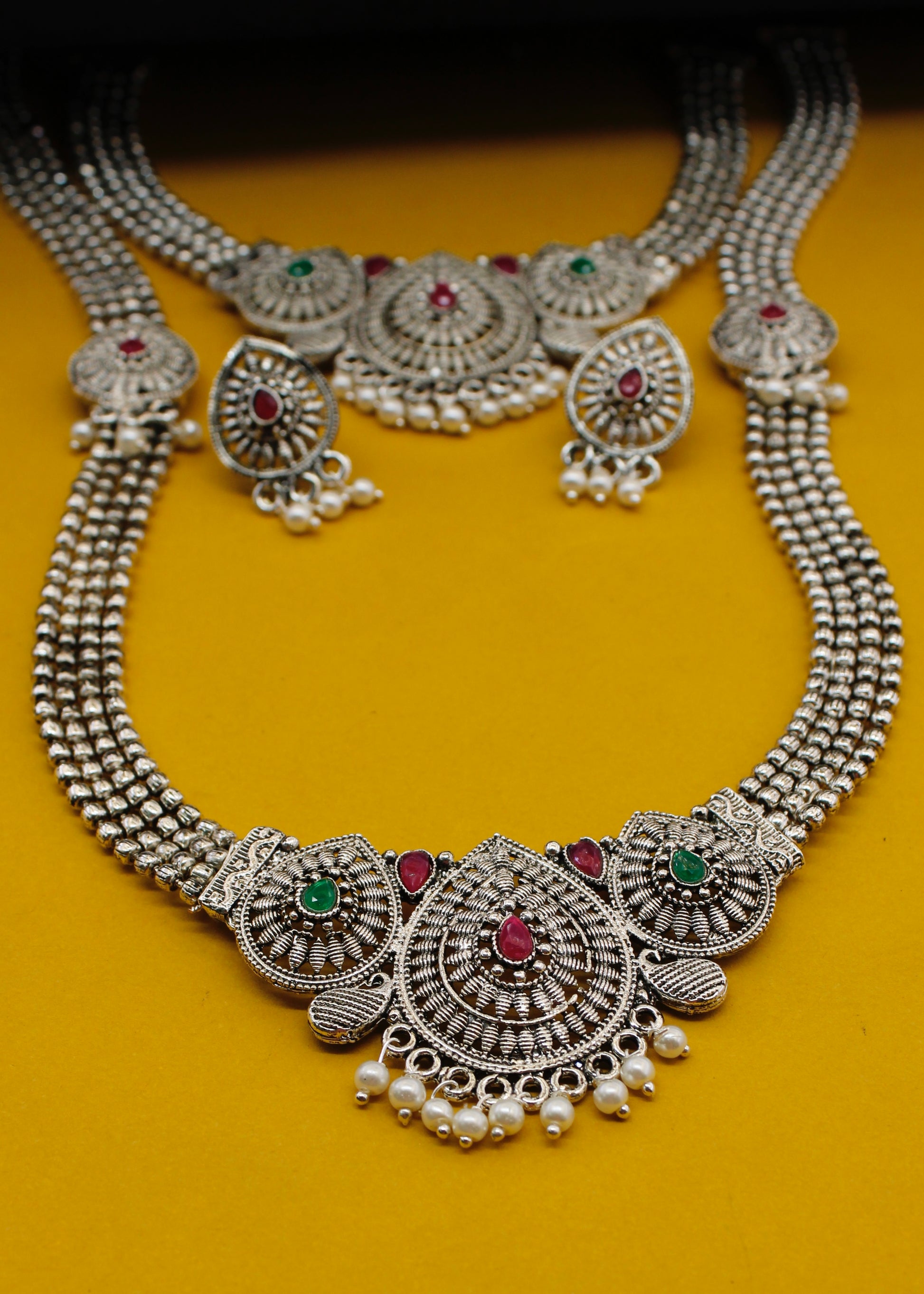 Try something new and stylish oxidised necklace set from Sonchafa Jewellery for trendy women like you. It is wonderfully crafted with oxidised finish metal and studded with pink, green stones. It is woven with attractive oxidised beads. This adorable necklace set gives a stylish look and is superior in quality.