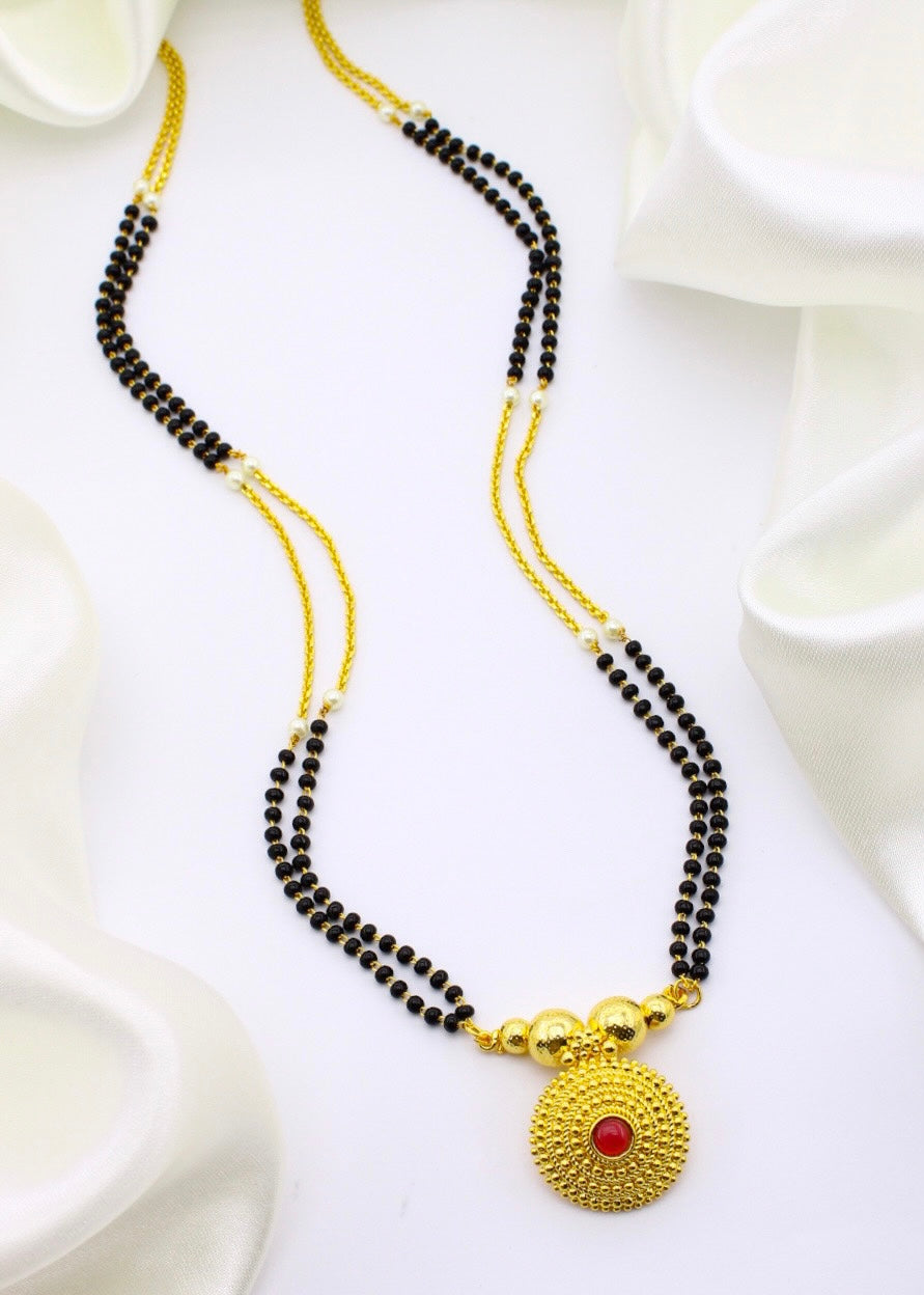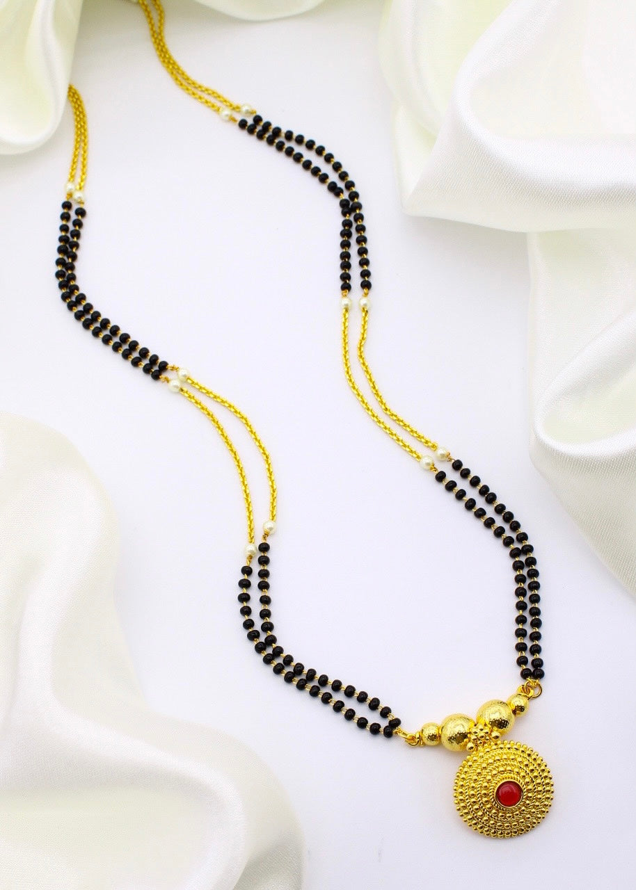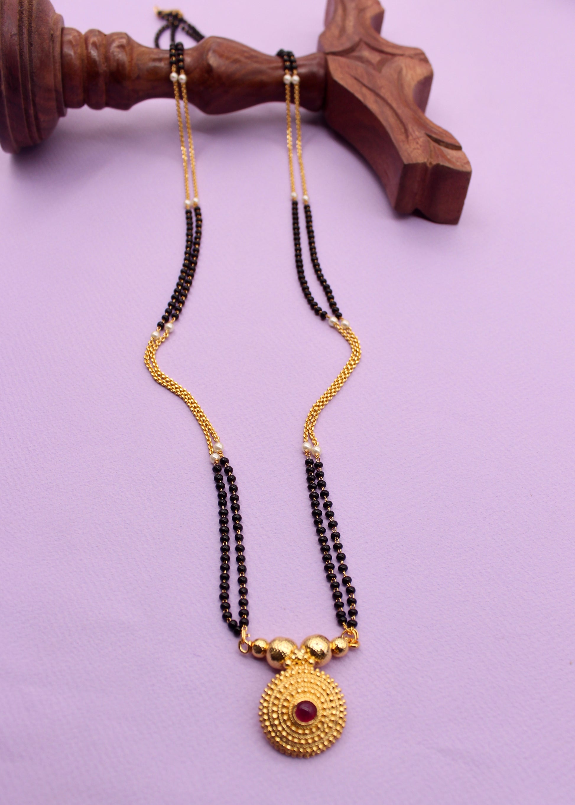 Sonchafa Jewellery offers this designer malhar mangalsutra in classy look for women who love to adorn traditional accessory. The round pendant is studded with sparkling pink stone and made from golden finish metal. It is wonderfully woven with black, pearl, golden beads. This mangalsutra is superior in quality and rust-resistant as well.