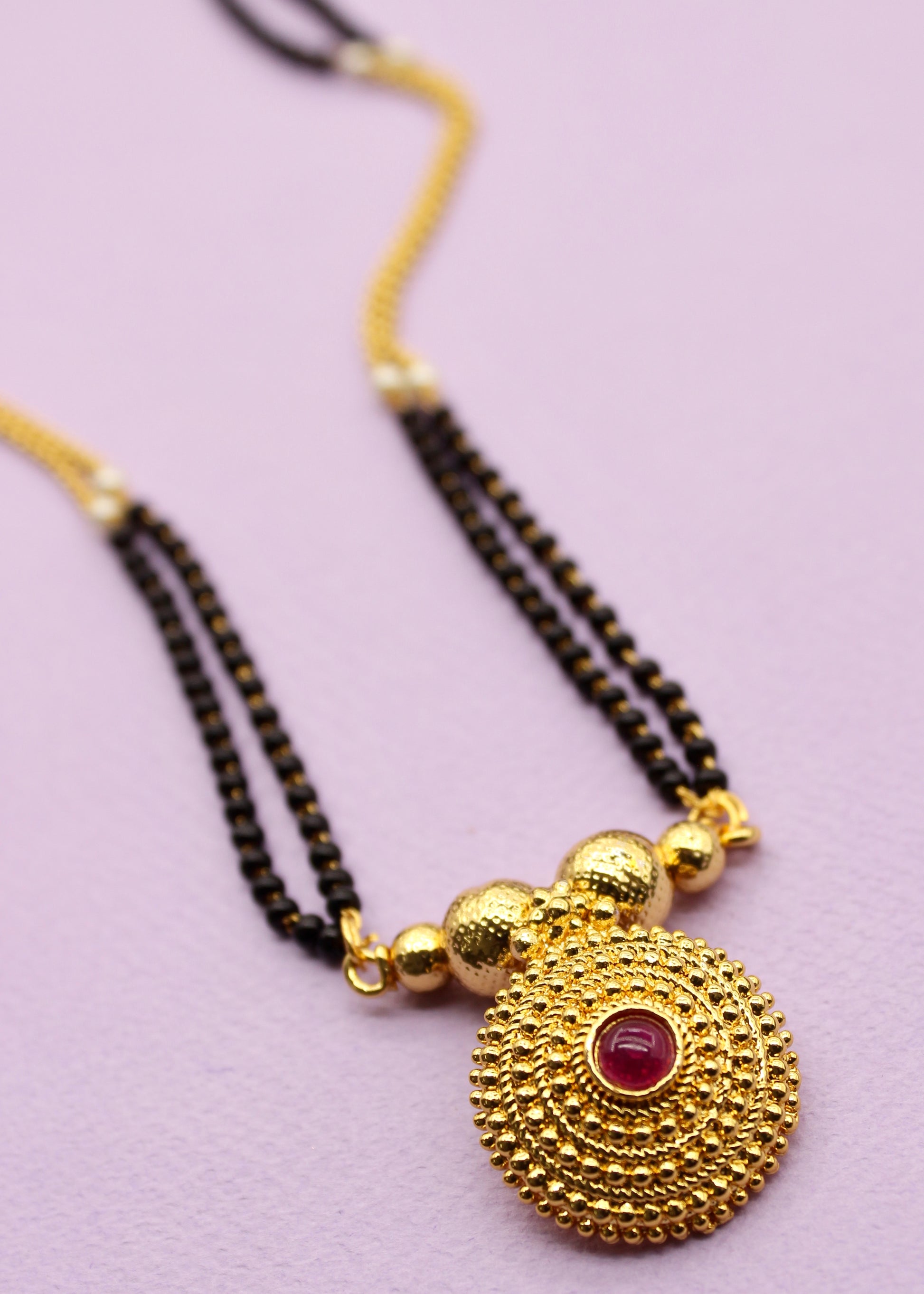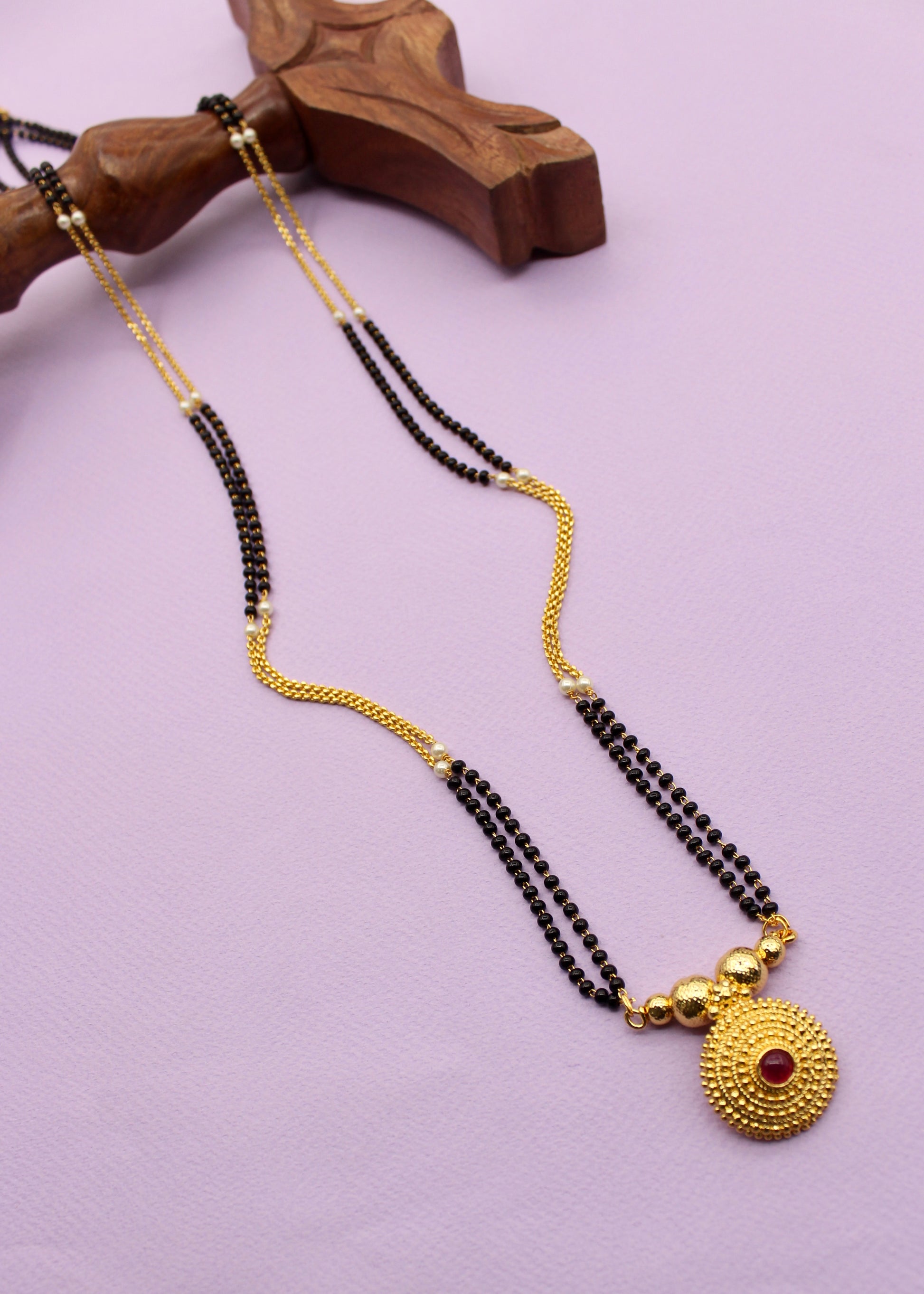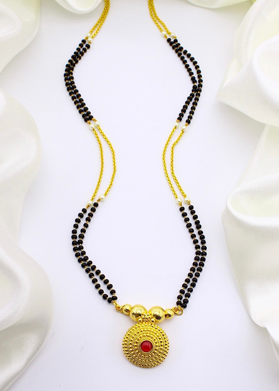 Sonchafa Jewellery offers this designer malhar mangalsutra in classy look for women who love to adorn traditional accessory. The round pendant is studded with sparkling pink stone and made from golden finish metal. It is wonderfully woven with black, pearl, golden beads. This mangalsutra is superior in quality and rust-resistant as well.