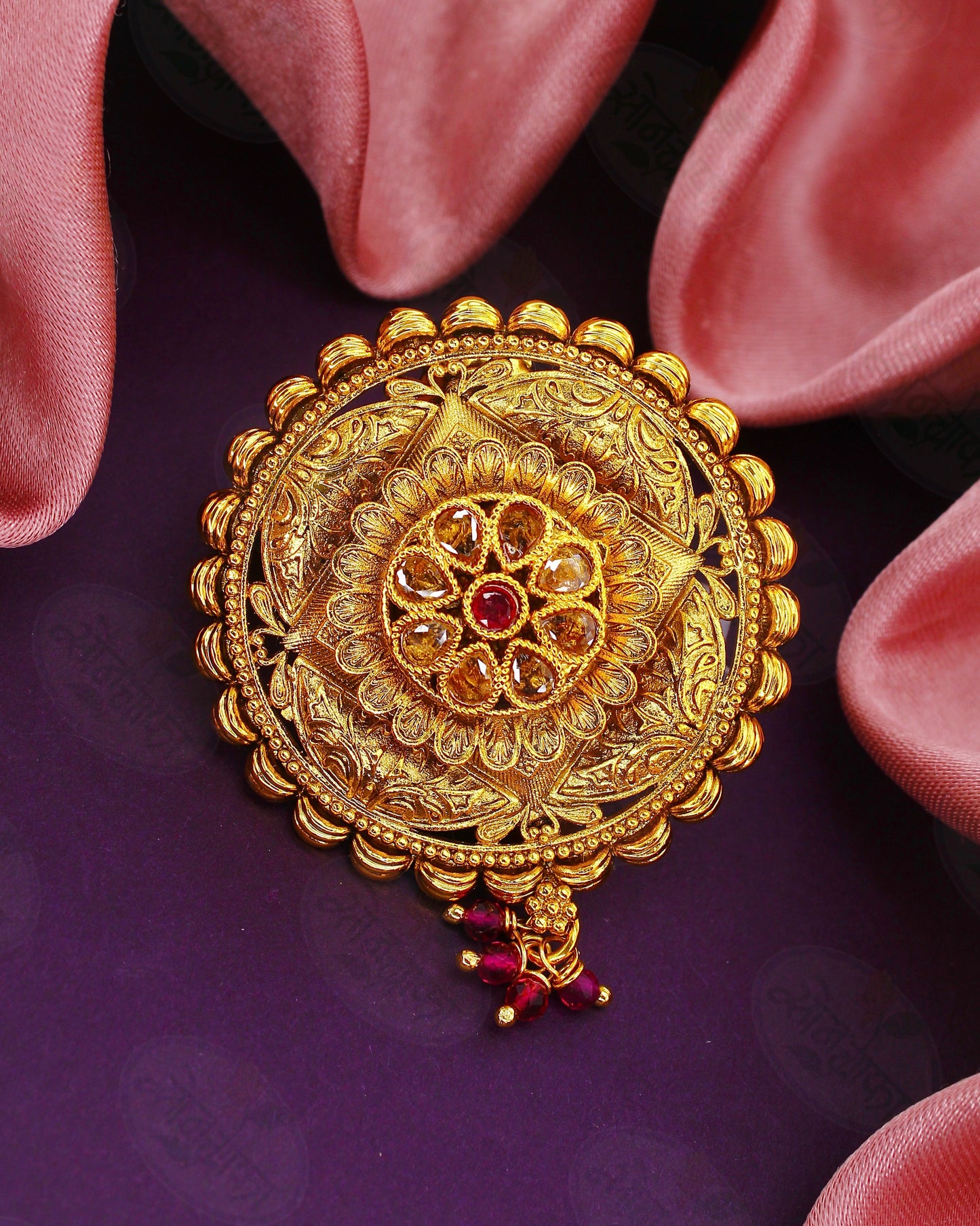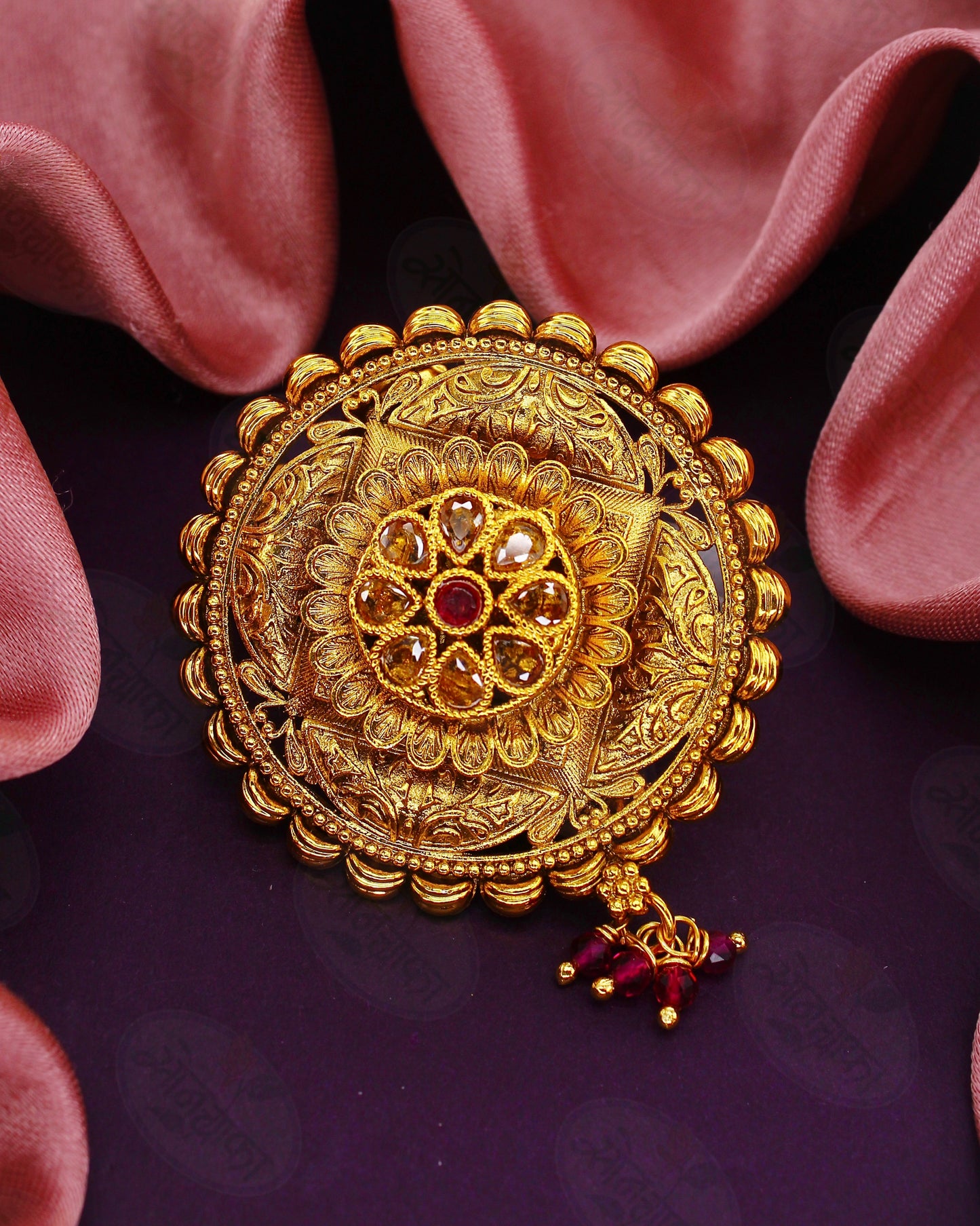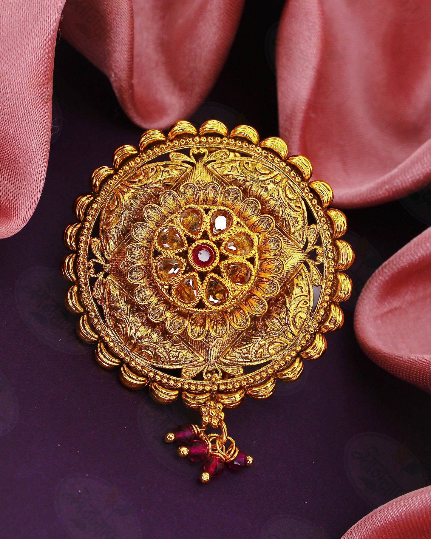 This wonderful classy round shape designer judapin form Sonchafa Jewellery for styled on hair. It Is studded pink, white stone along with beads and made from metal. This judapin is good in quality and will be your fashion companion for many years.