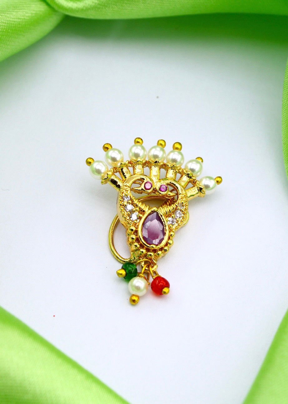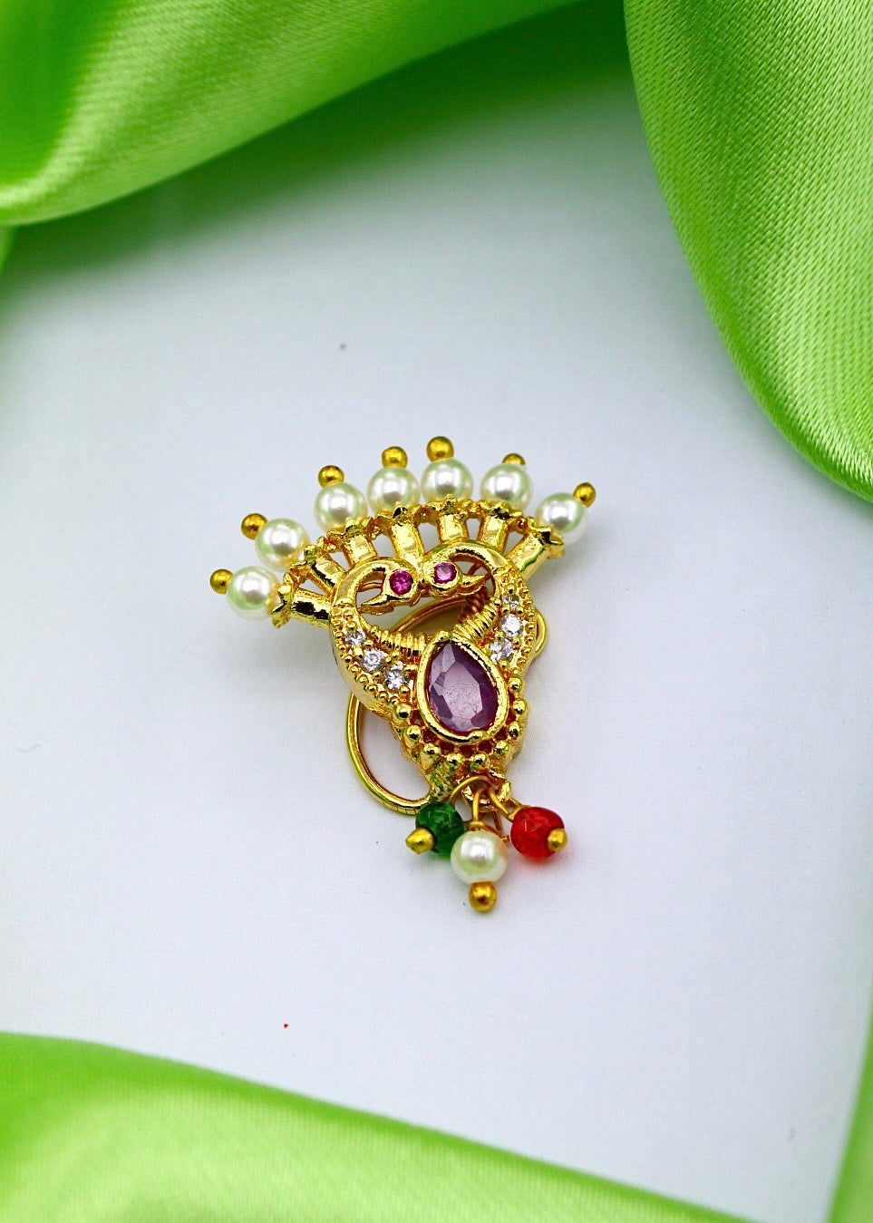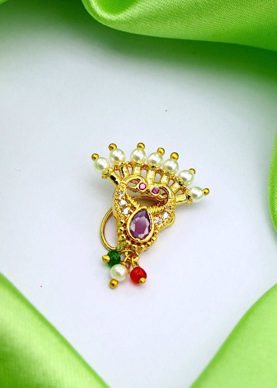 Sonchafa Jewellery brings to you this golden finish peafowl inspired nath for stylish traditional look. It is encrusted with pink stones along with pearls beads and red-green beads. Crafted from golden finish metal. This nath is easy to wear and press on.