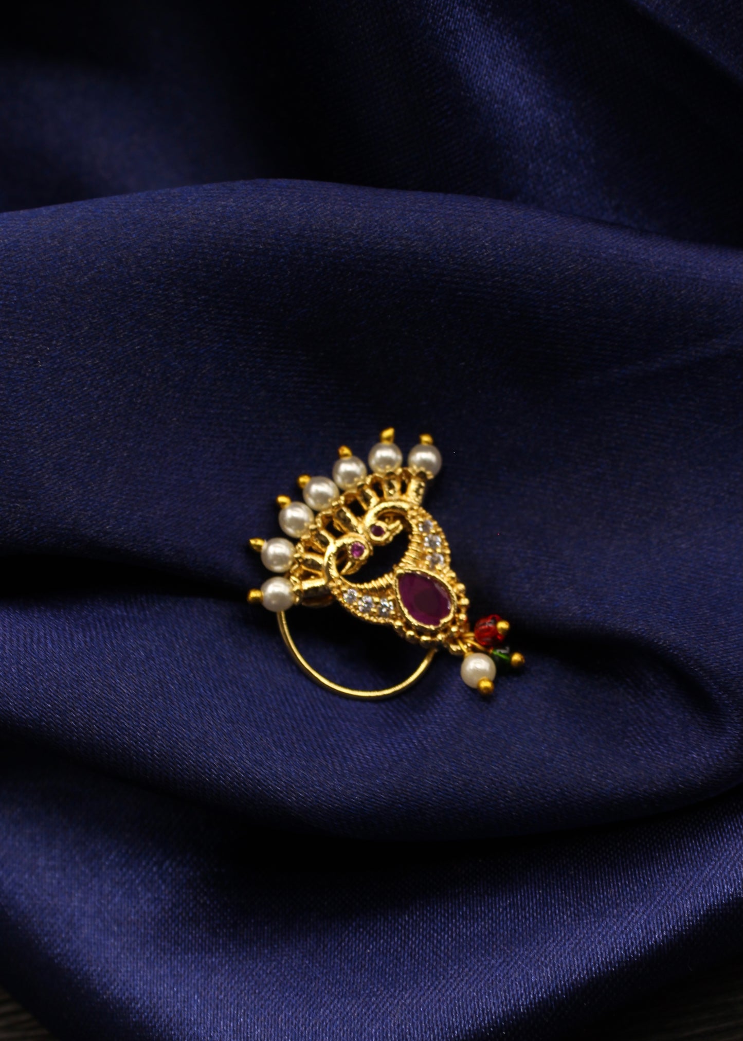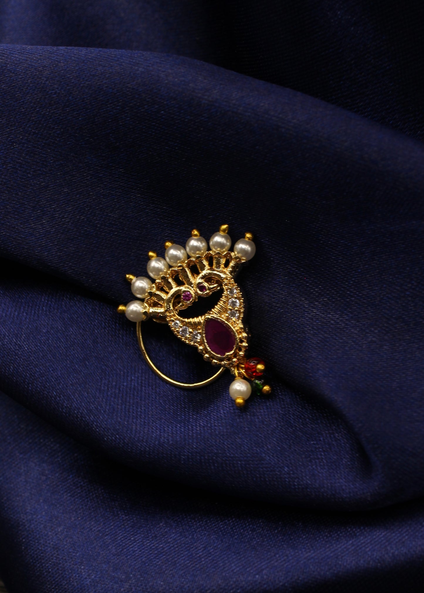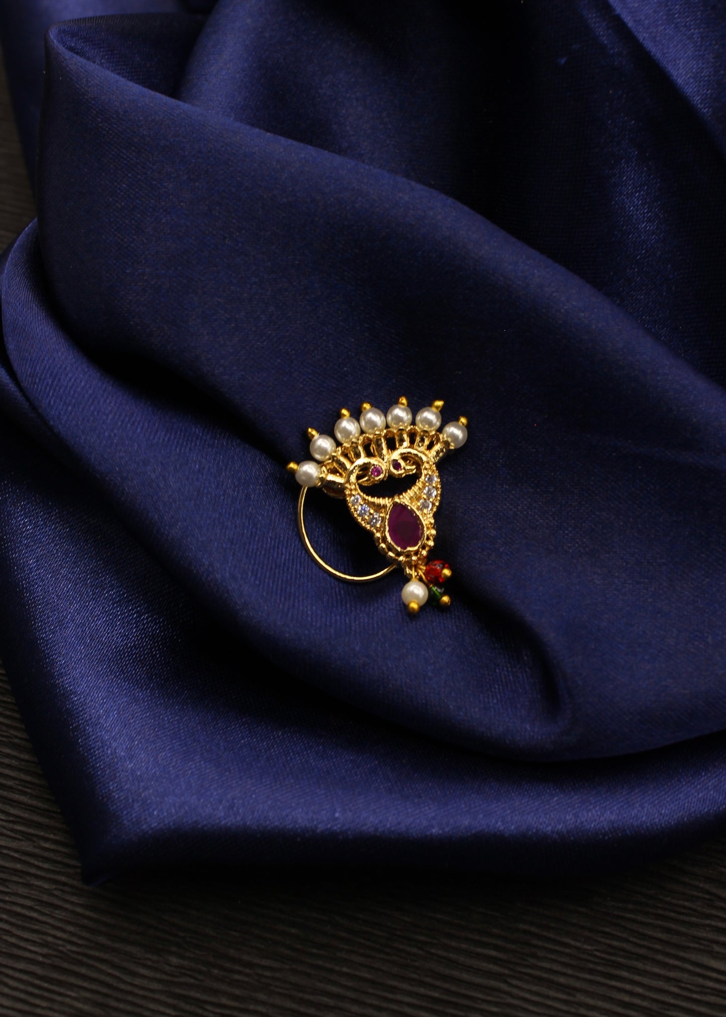 Sonchafa Jewellery brings to you this golden finish peafowl inspired nath for stylish traditional look. It is encrusted with pink stones along with pearls beads and red-green beads. Crafted from golden finish metal. This nath is easy to wear and press on.