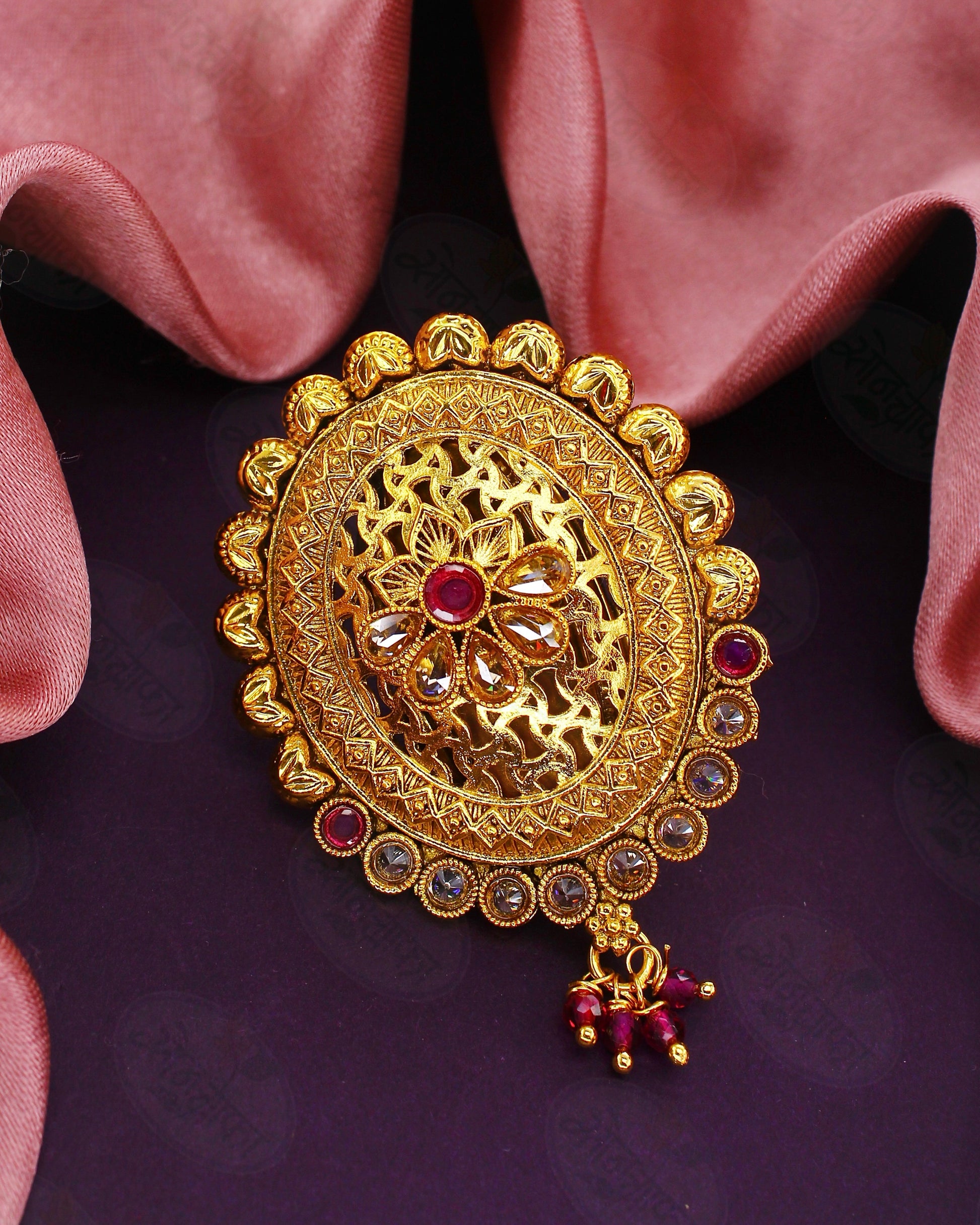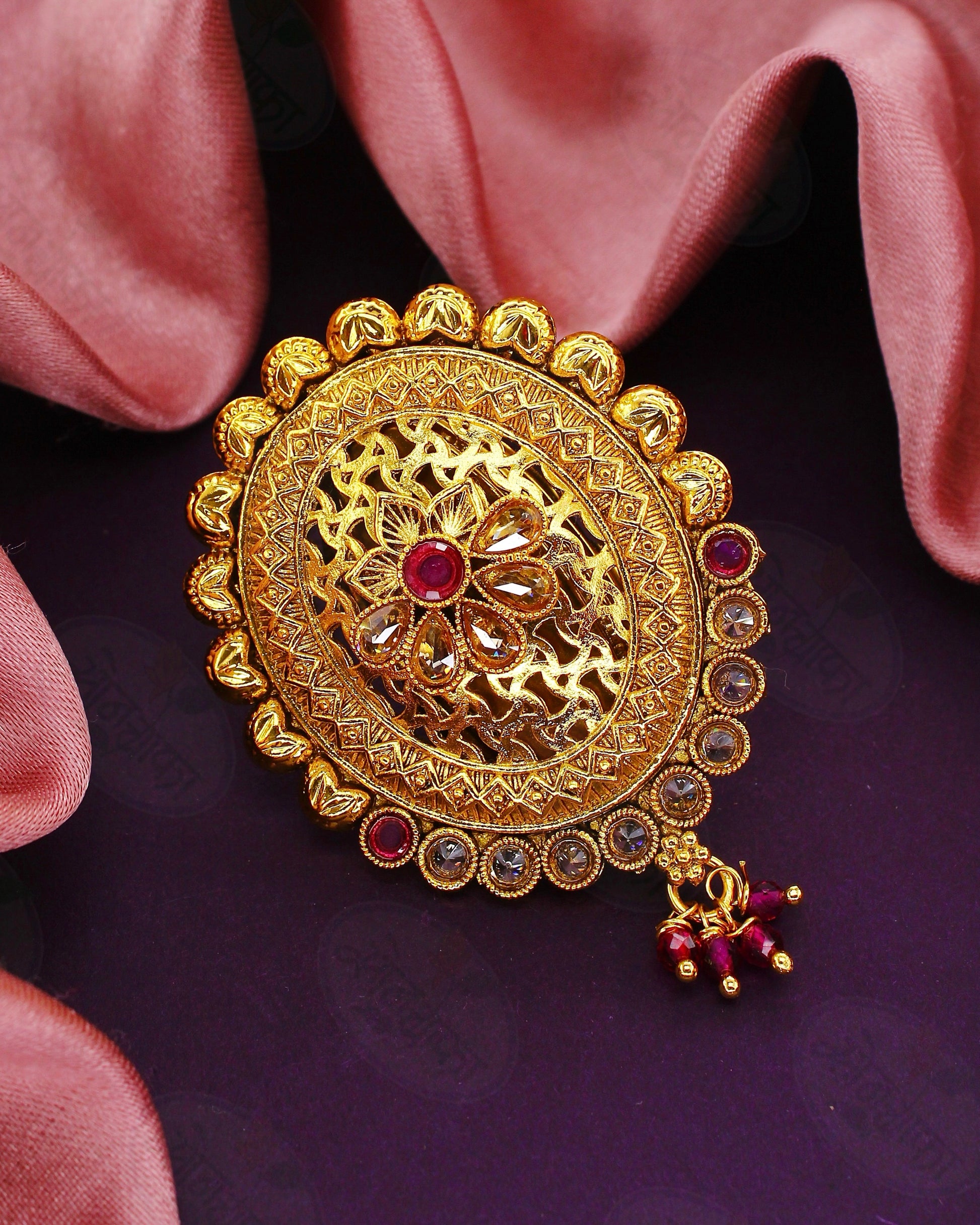 This wonderful classy round shape designer sareepin form Sonchafa Jewellery for styled on hair. It Is studded pink stone along with beads and made from metal. This judapin is good in quality and will be your fashion companion for many years.