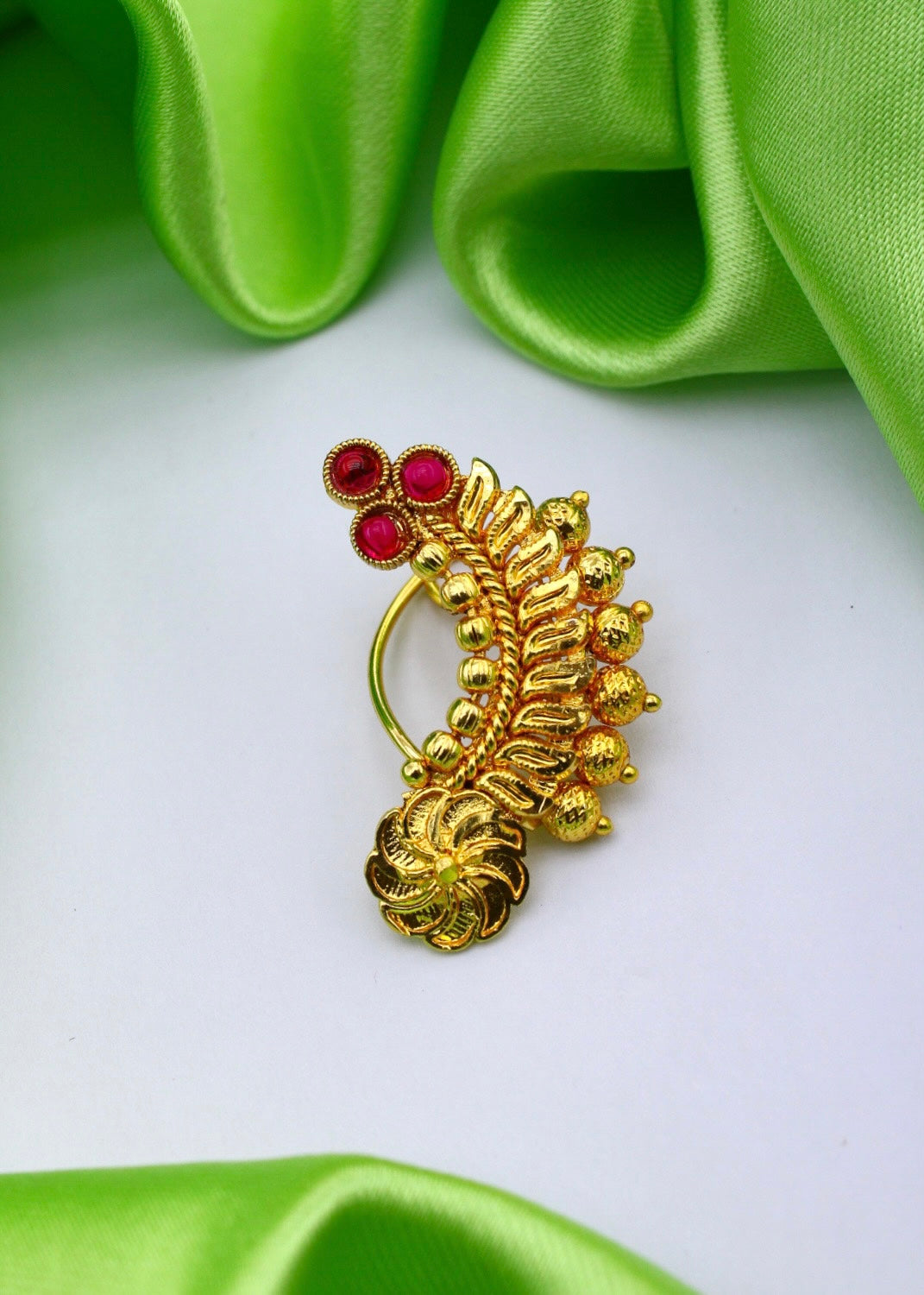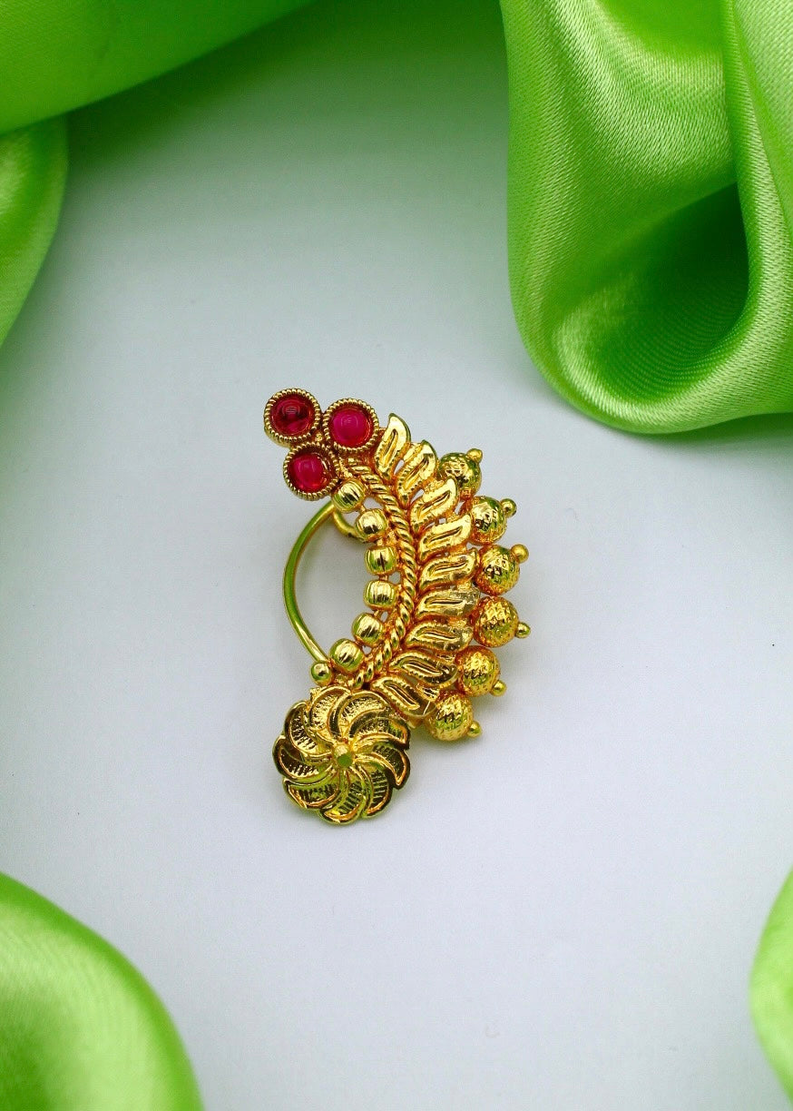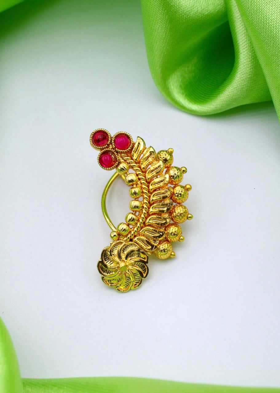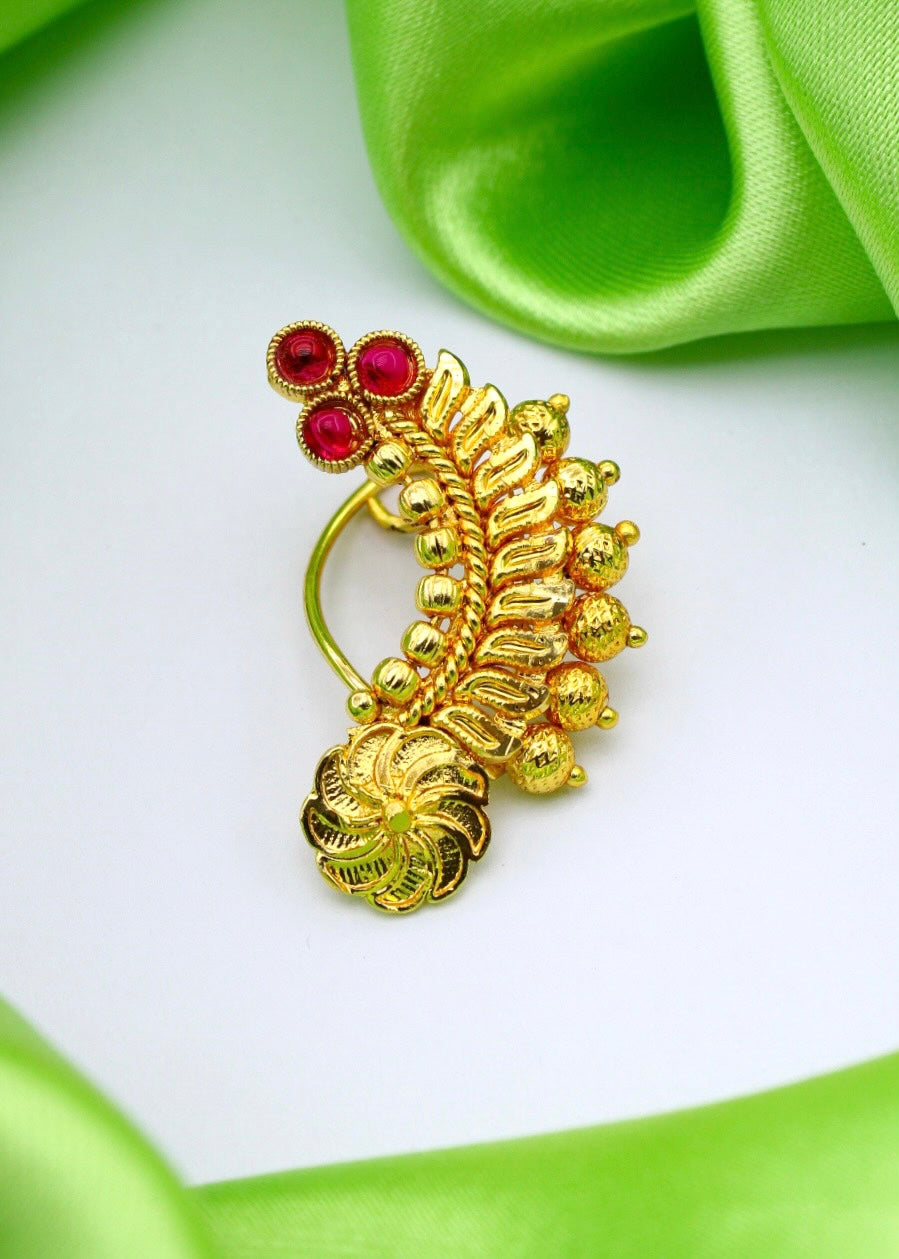 To get that perfect Maharashtrian look, nath is must to wear so Sonchafa Jewellery offers this beautiful nath for you. It is woven with golden beads and studded with sparkling pink colour stones. This metal crafted nath is good in quality and requires piercing.