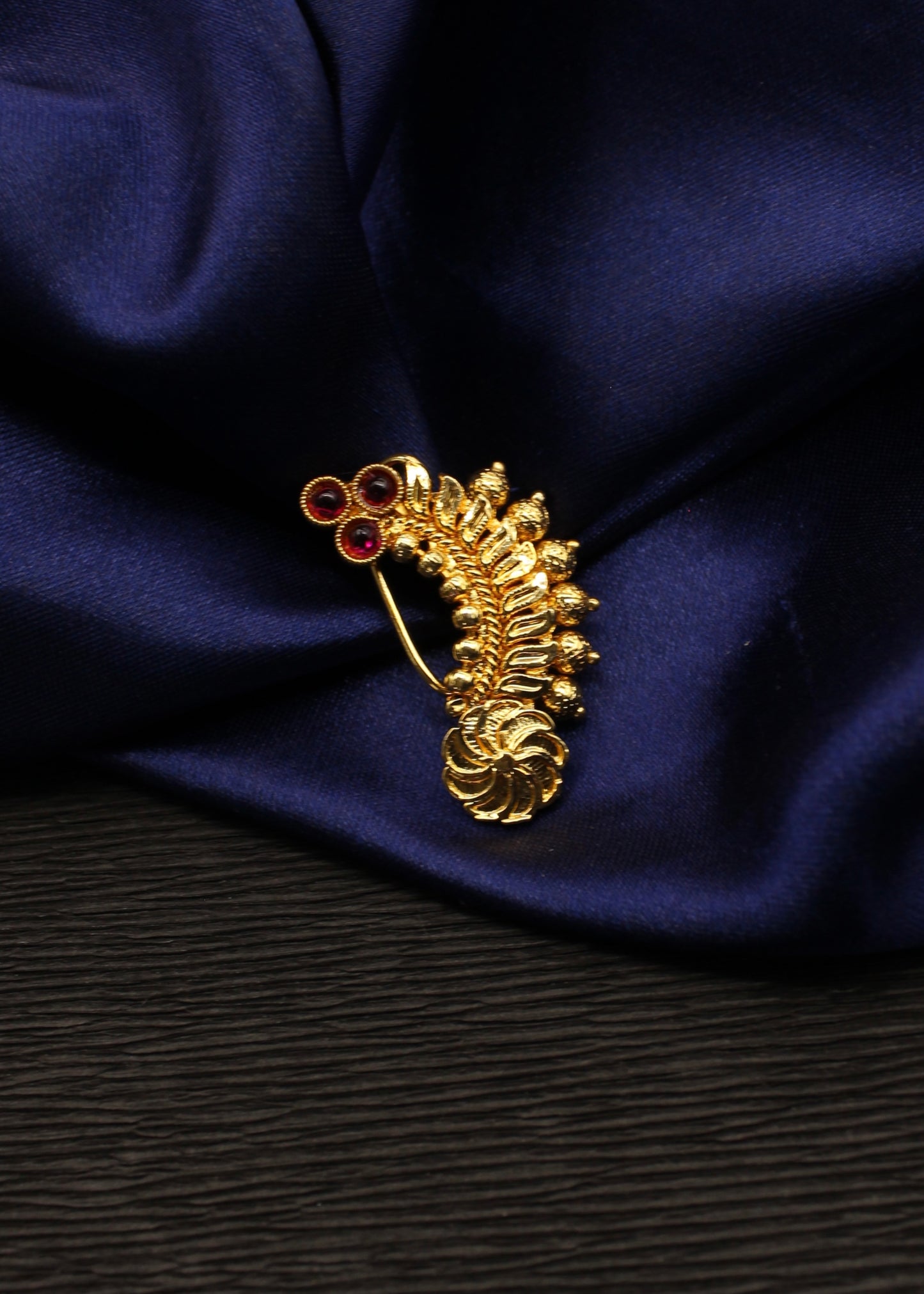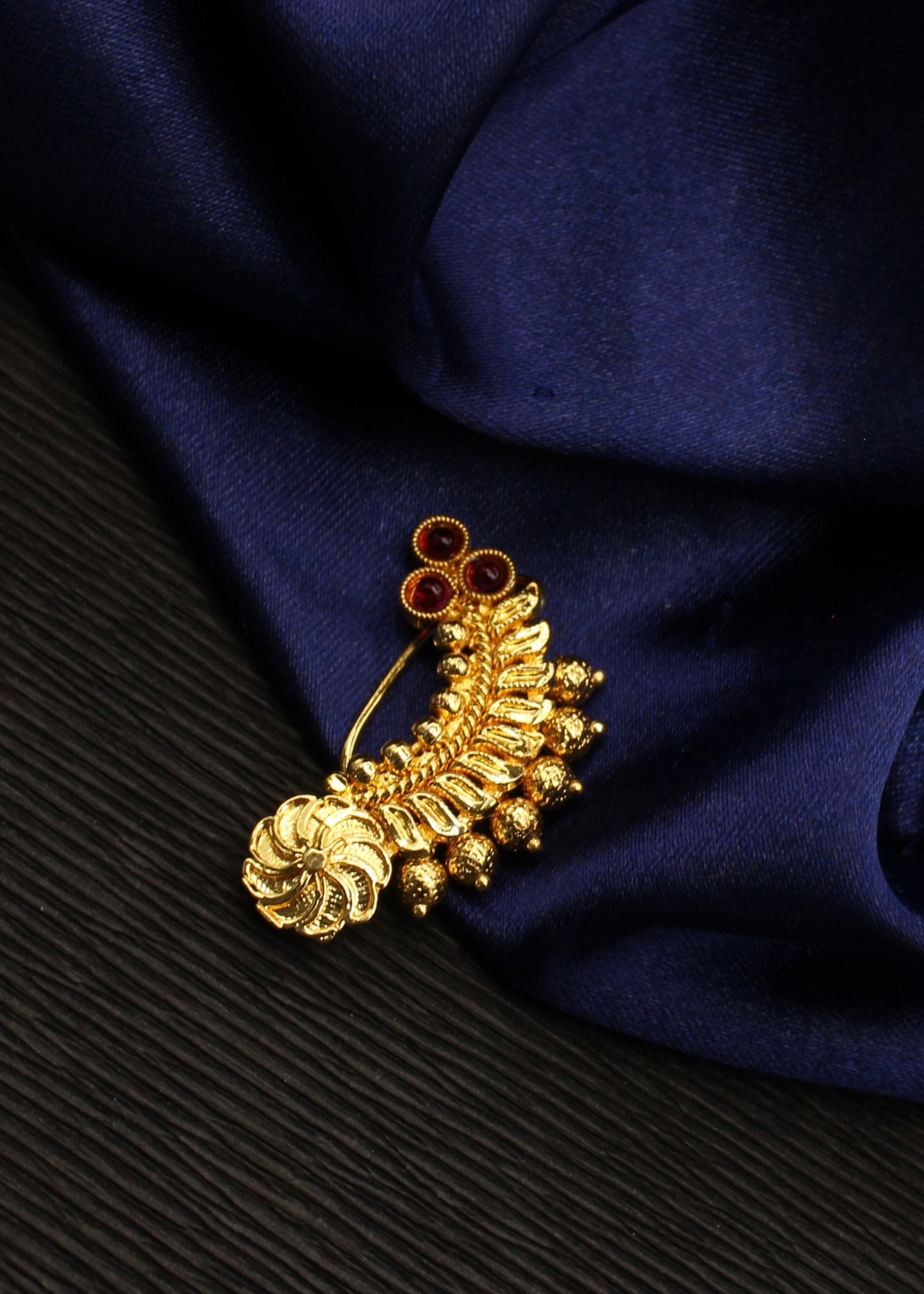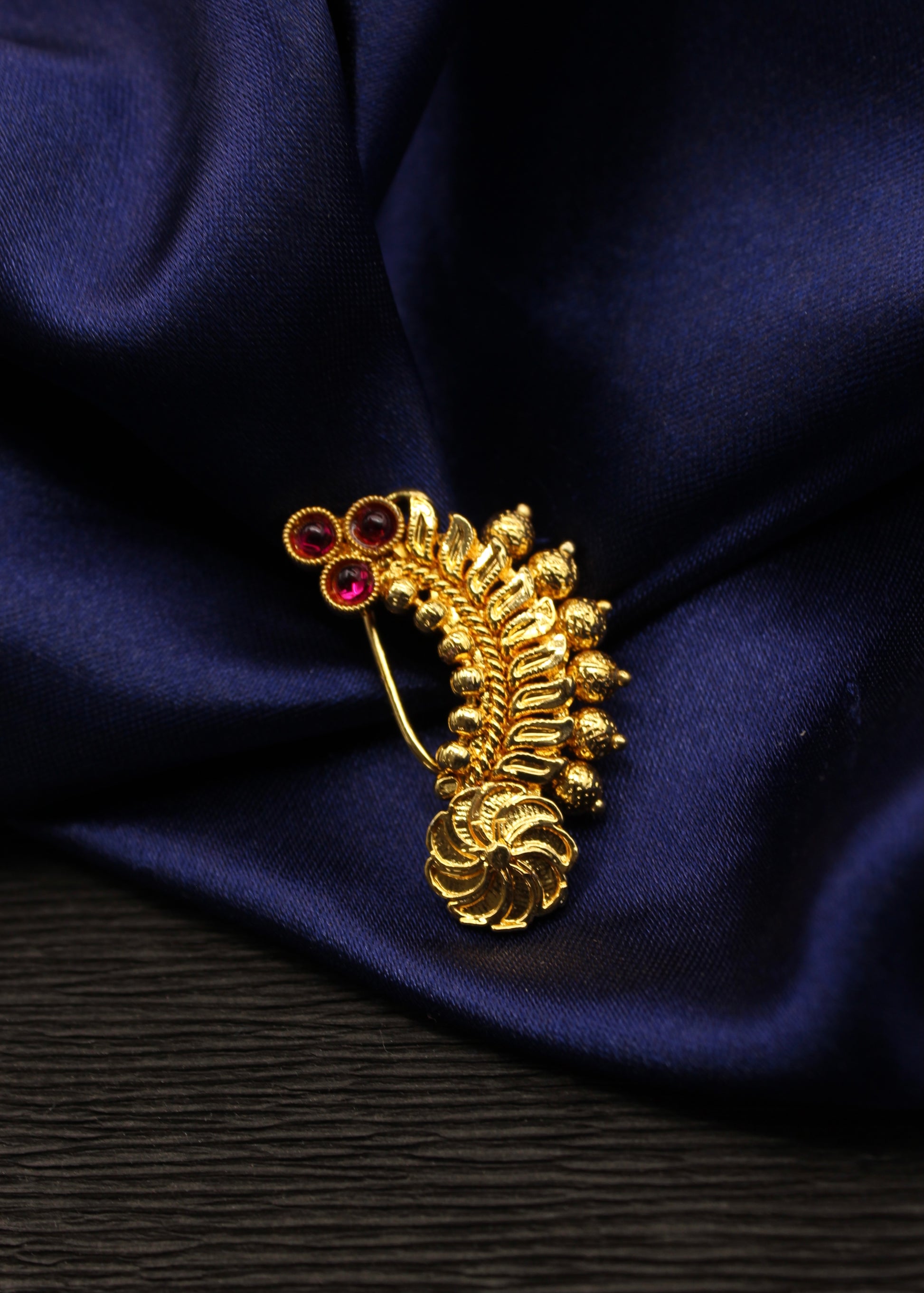 To get that perfect Maharashtrian look, nath is must to wear so Sonchafa Jewellery offers this beautiful nath for you. It is woven with golden beads and studded with sparkling pink colour stones. This metal crafted nath is good in quality and requires piercing.