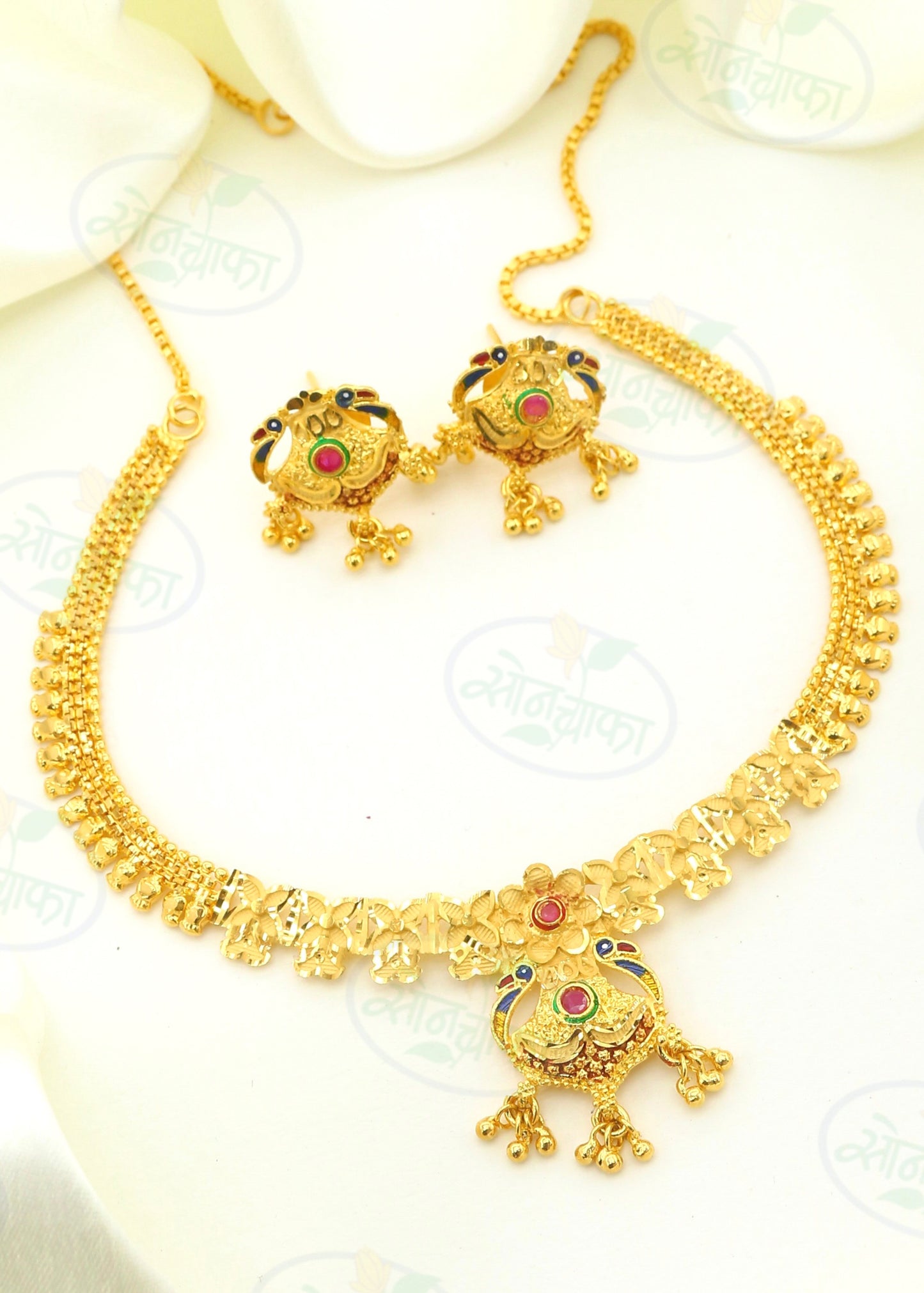 Beautifully latest Gold plated Floral choker set from Sonchafa Jewellery for stylish girls like you. It is styled with studded golden beads & made from 1 gram gold plated metal. This Gold plated jewellery set has wonderful golden beads droplets & ensures high durability.