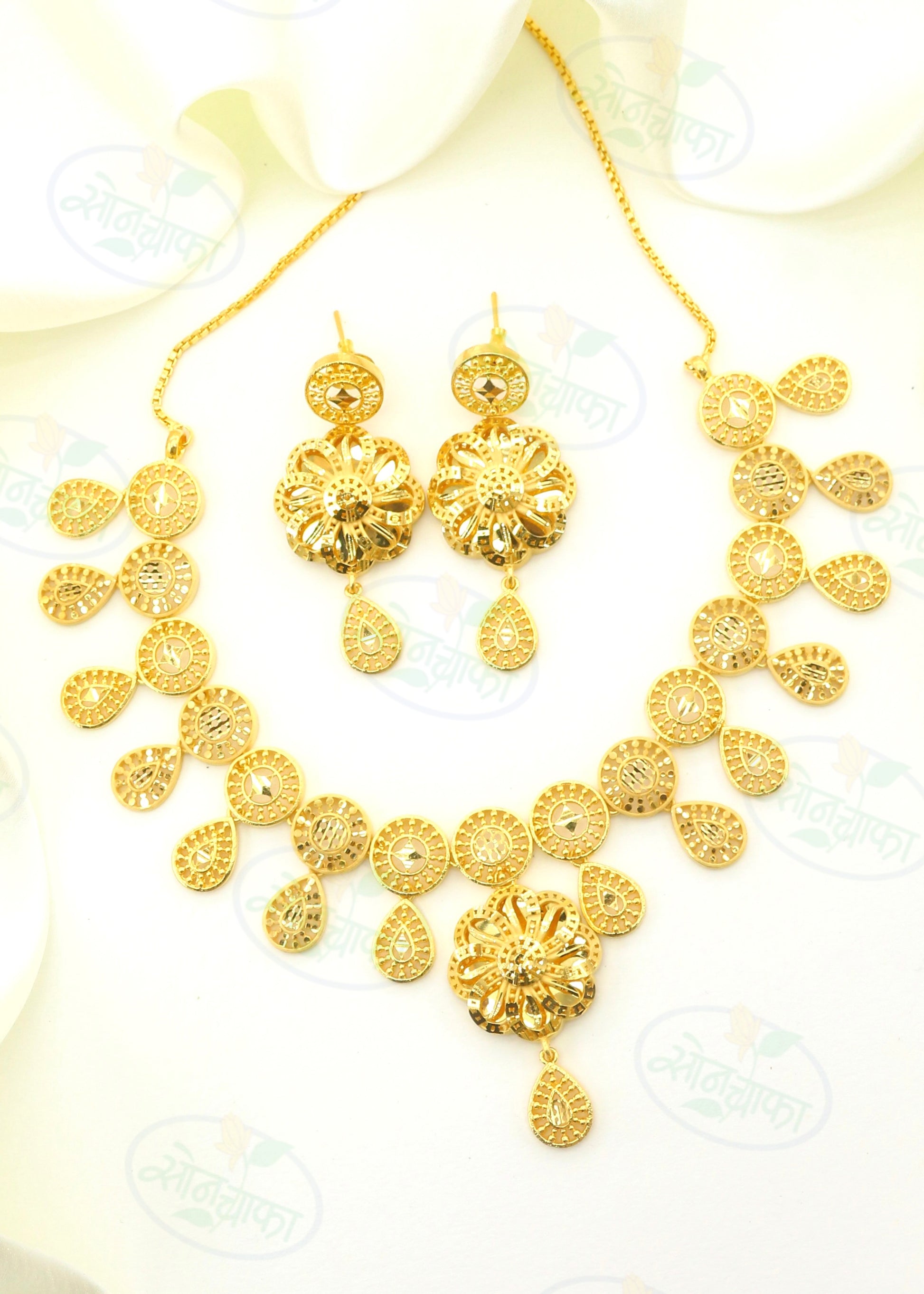 Adorn your neckline with this designer 1gram gold Plated necklace which is perfect blend of class and elegance. It is embedded with Pink, White stone along with wonderfully intricate design made from gold finish metal. This designer necklace set will fetch you lots of compliments from onlookers for your amazing choice.
