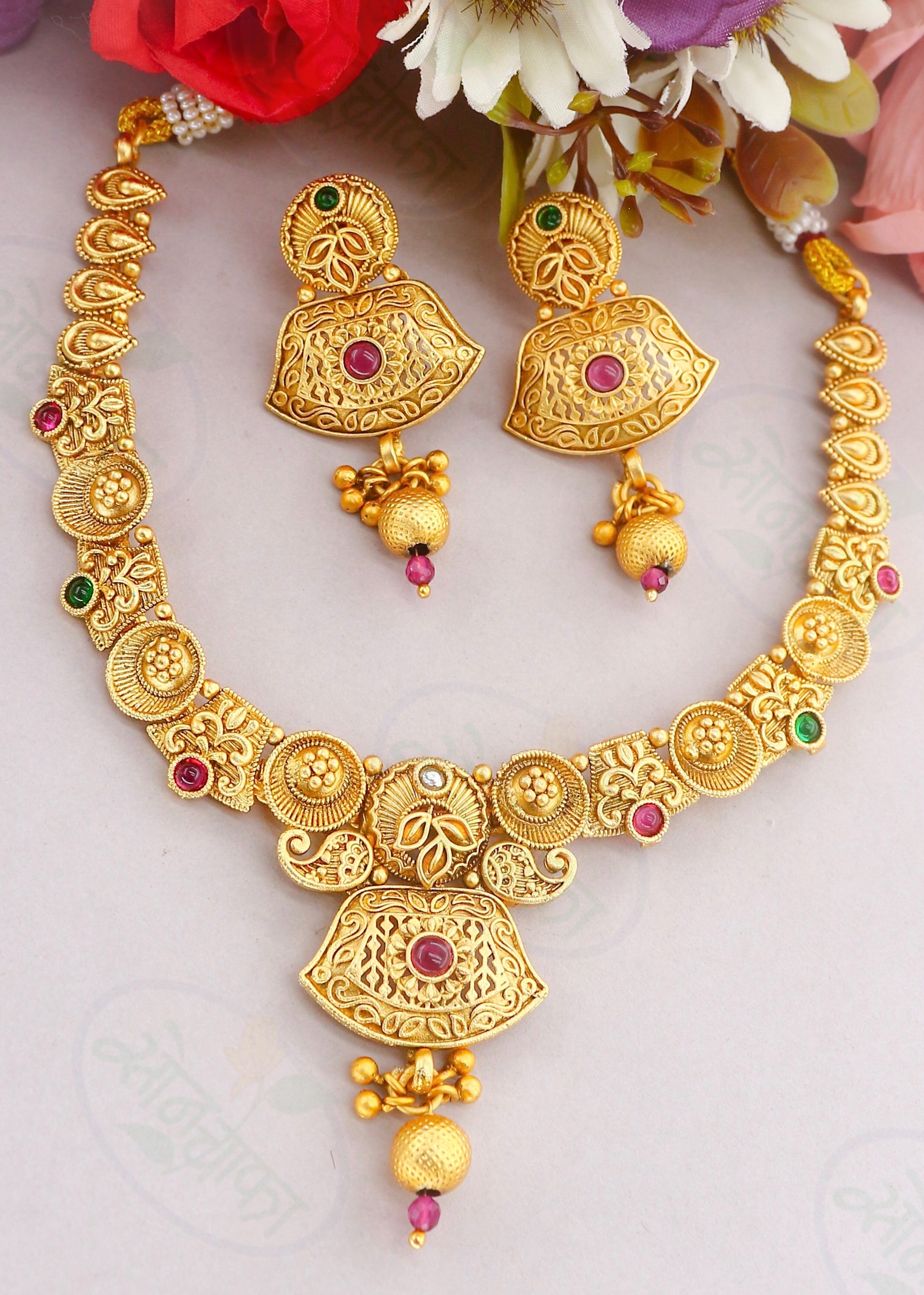Sonchafa Jewellery brings to you this antique golden finish floret designer necklace set with your festive costume. It feature intricate carving of floral pendant and encrusted with pink, green ,white stone along with dangled golden beads. This piece of jewellery will fetch you lots of compliments from onlookers for your amazing choice.