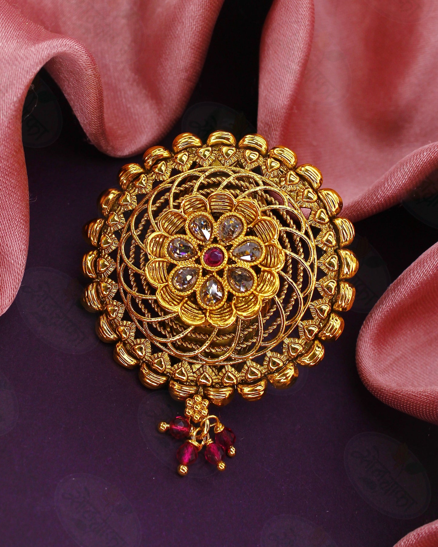 This wonderful classy round shape designer sareepin form Sonchafa Jewellery for styled on hair. It Is studded pink, white stone along with beads and made from metal. This judapin is good in quality and will be your fashion companion for many years.