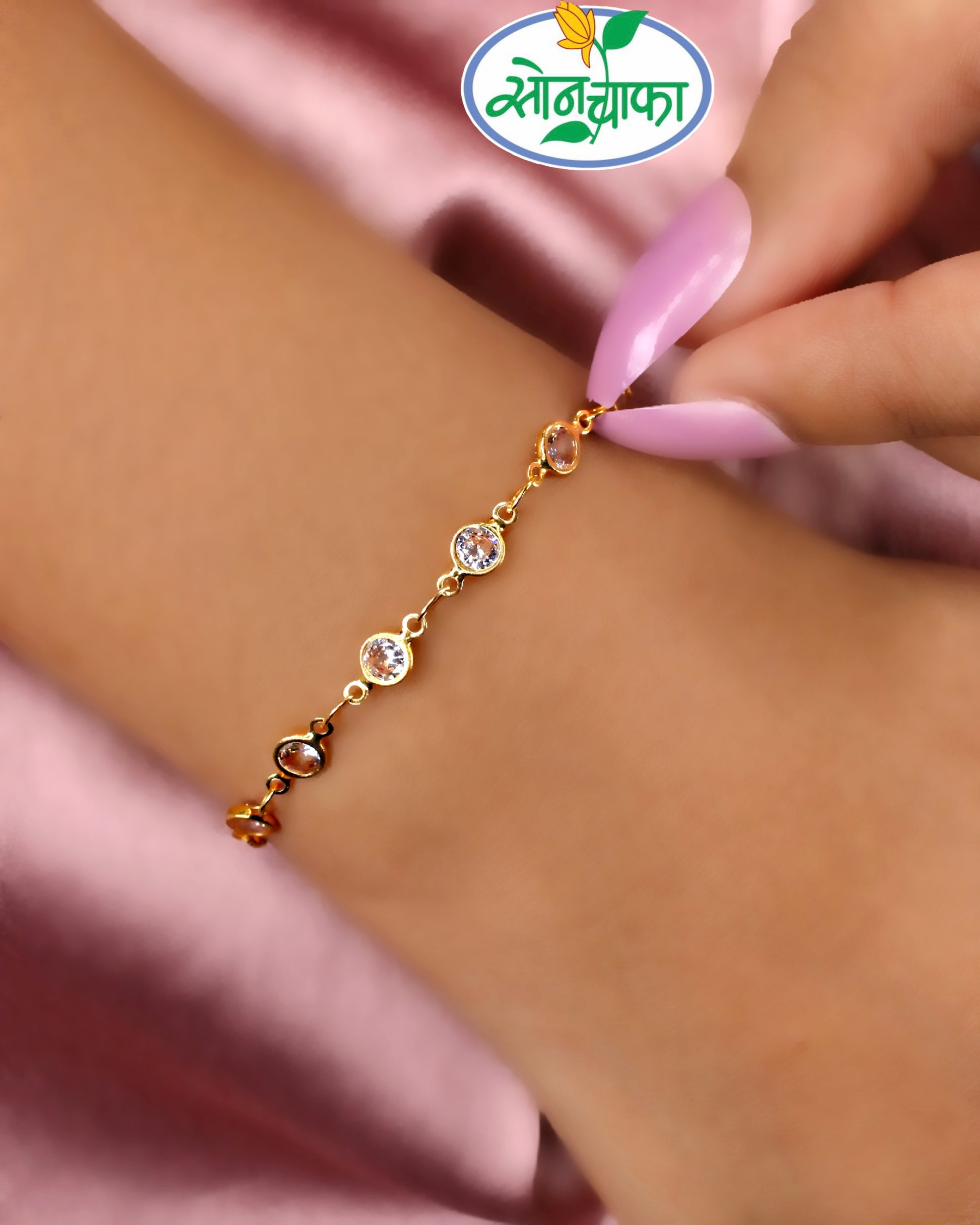 Complete your party look by clubbing this adorable bracelet from Sonchafa Jewellery. It is crafted from antique golden finish superior quality metal. This bracelet is decorated with attractive florals design. It is embedded white stone bracelate for more attraction.