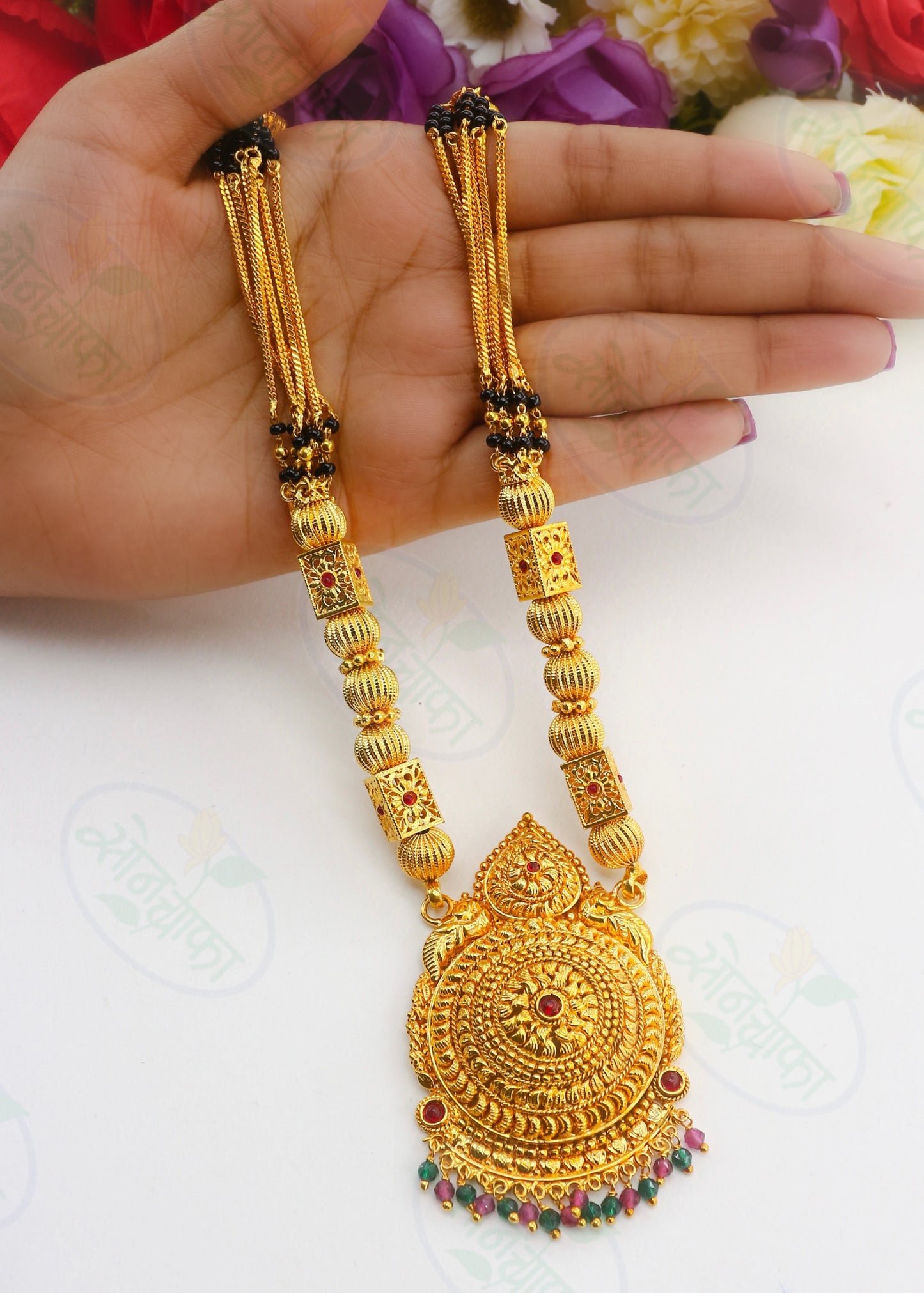 Sonchafa Jewellery brings this appealing mangalsutra for women who love to wear traditional jewellery. It is studded with shiny pink stones and fashioned from highly durable matte gold finish metal. The pendant feature attractive leaf with floral design on metal surface along with dangled golden beads.