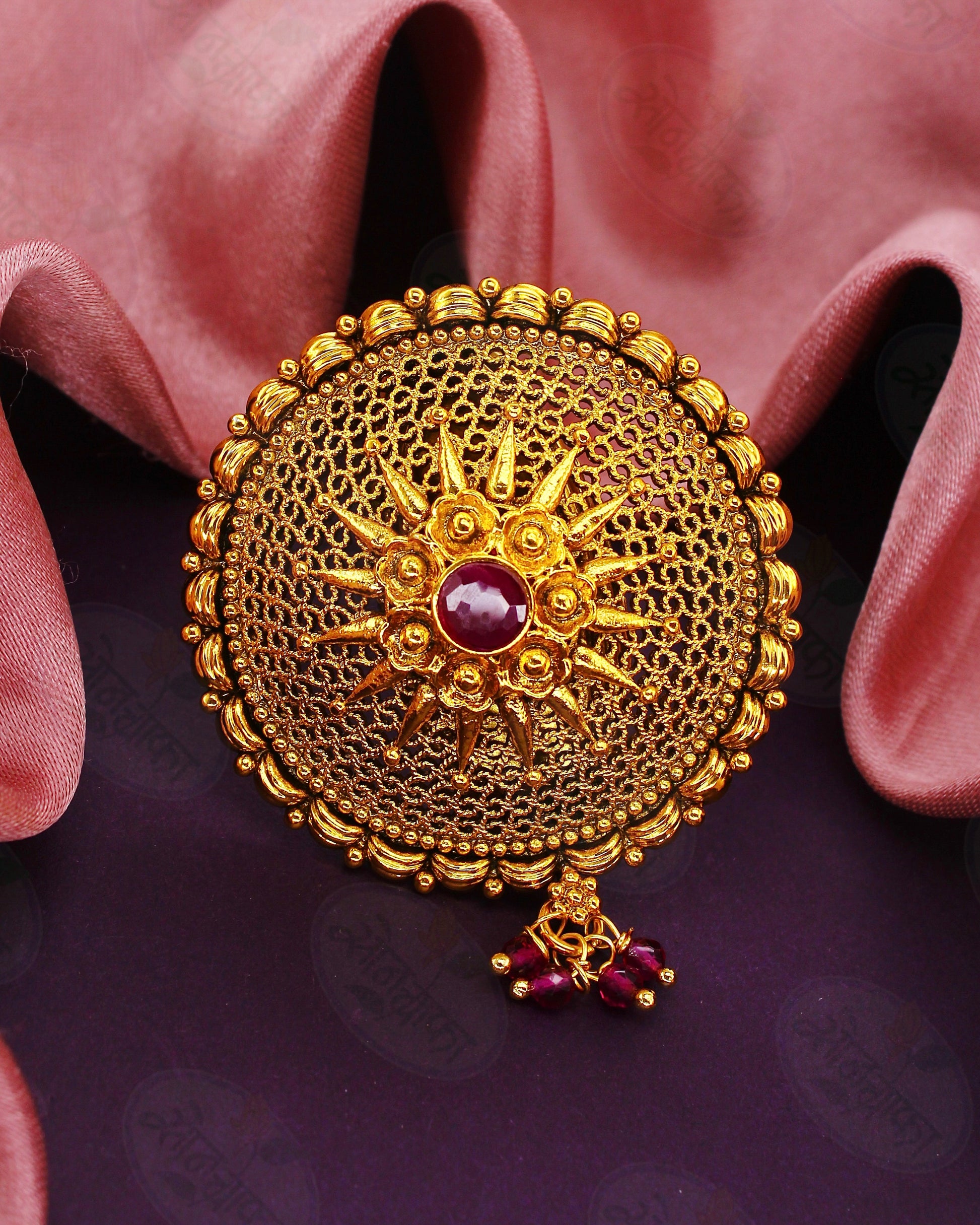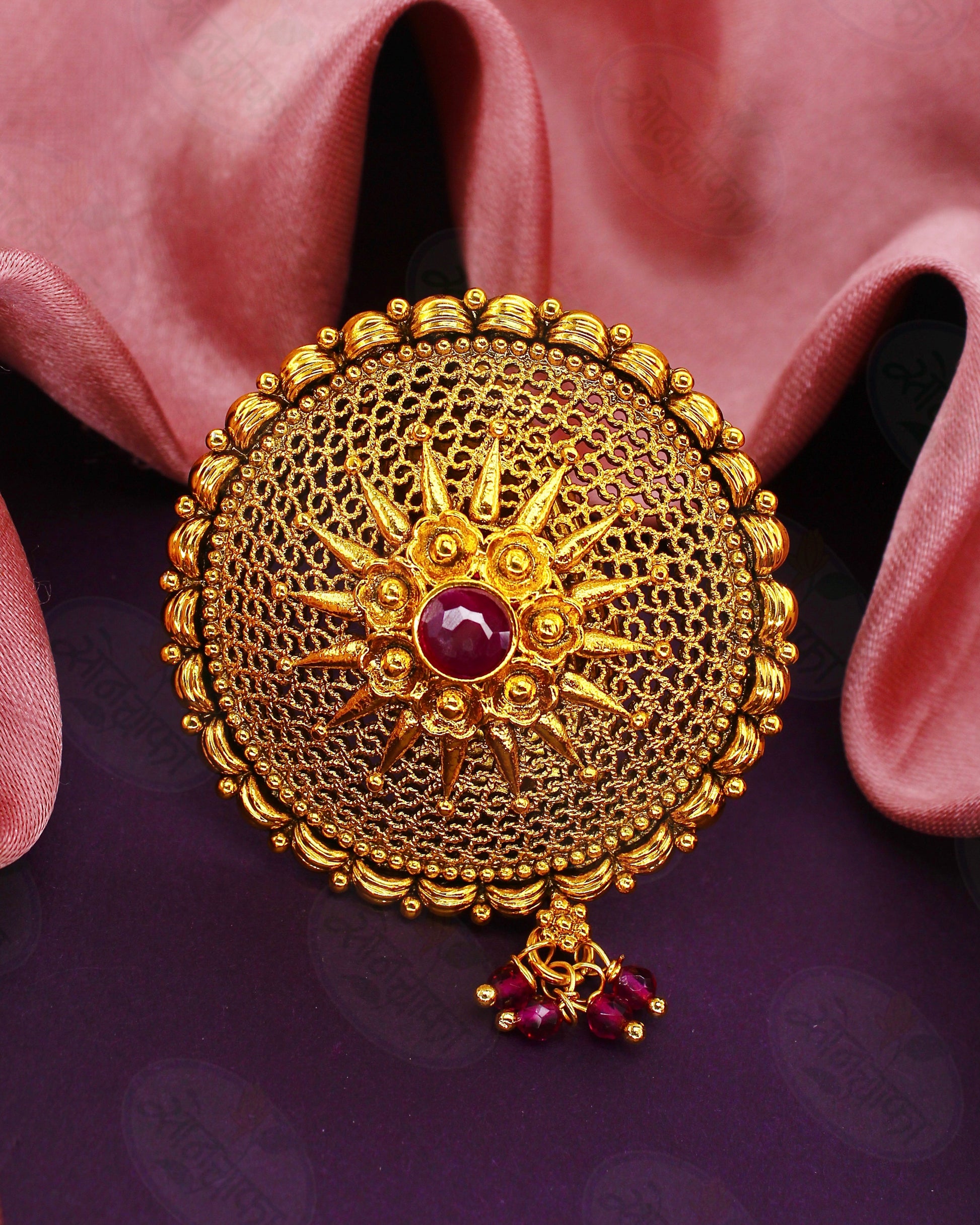 This wonderful classy round shape designer sareepin form Sonchafa Jewellery for styled on hair. It Is studded pink stone along with beads and made from metal. This judapin is good in quality and will be your fashion companion for many years.