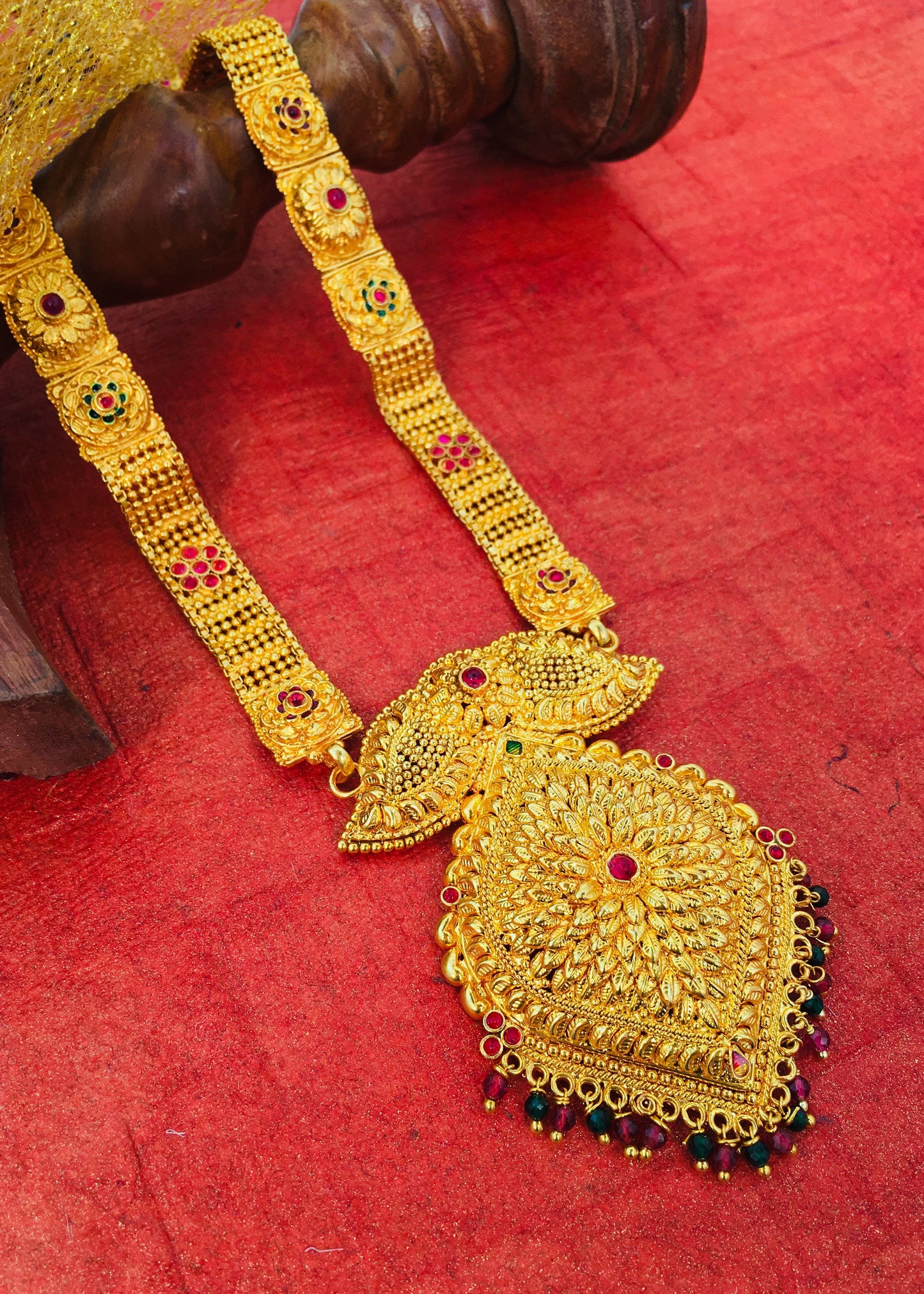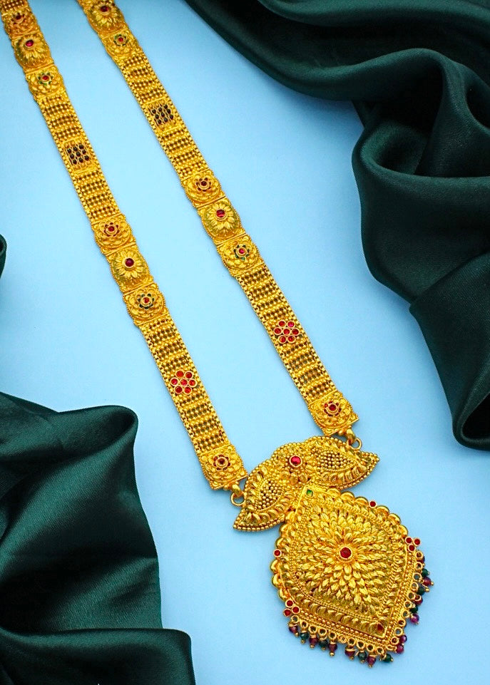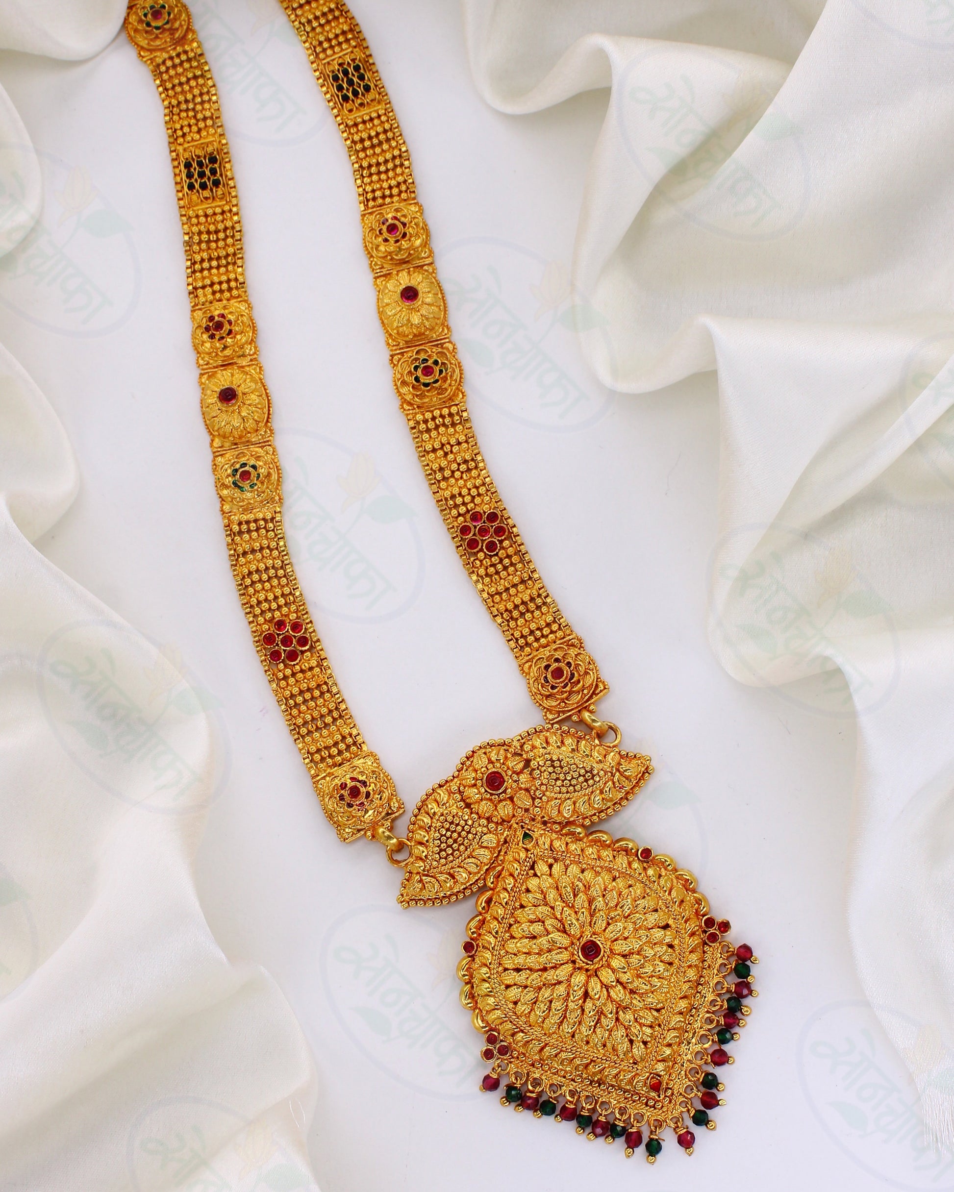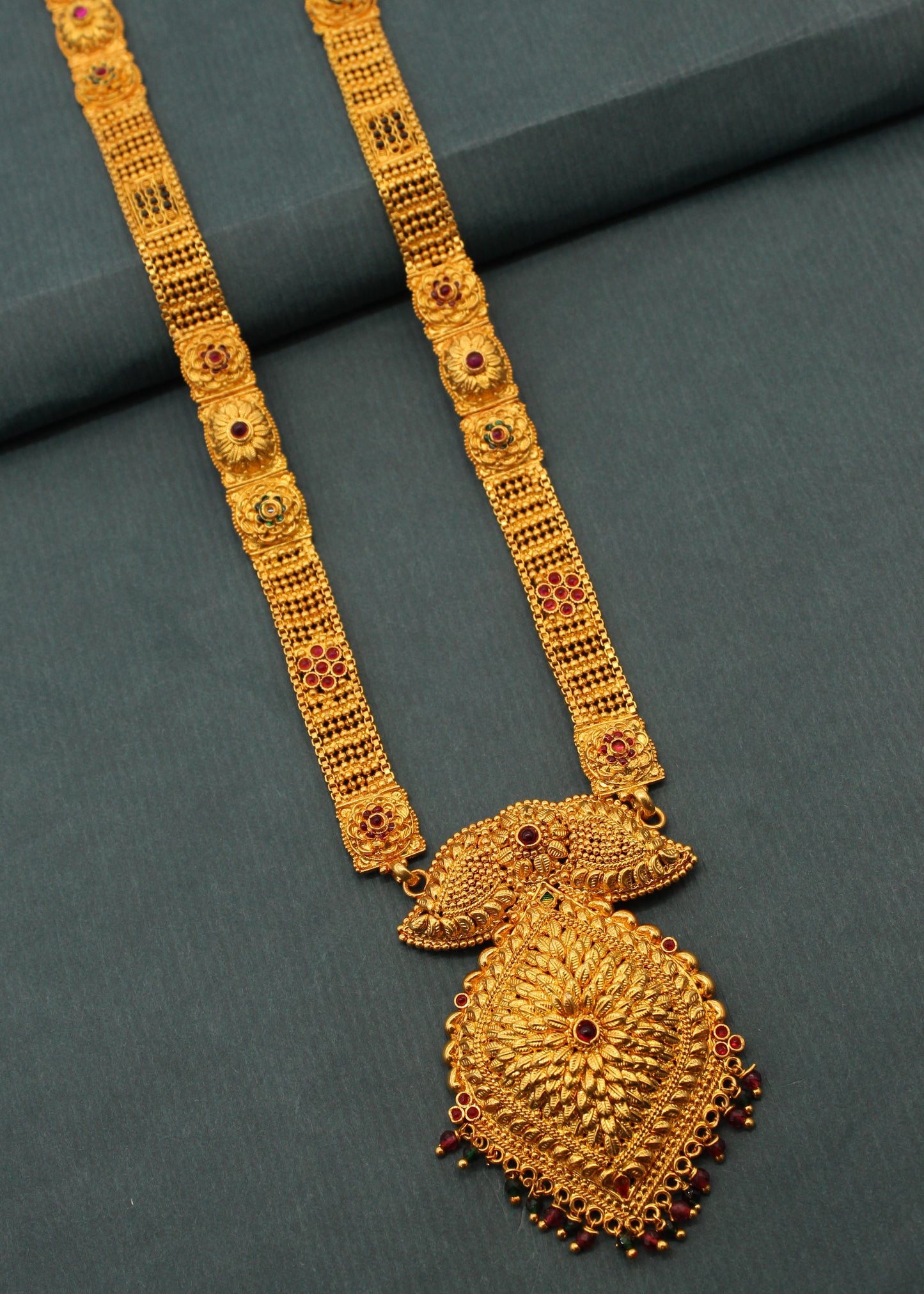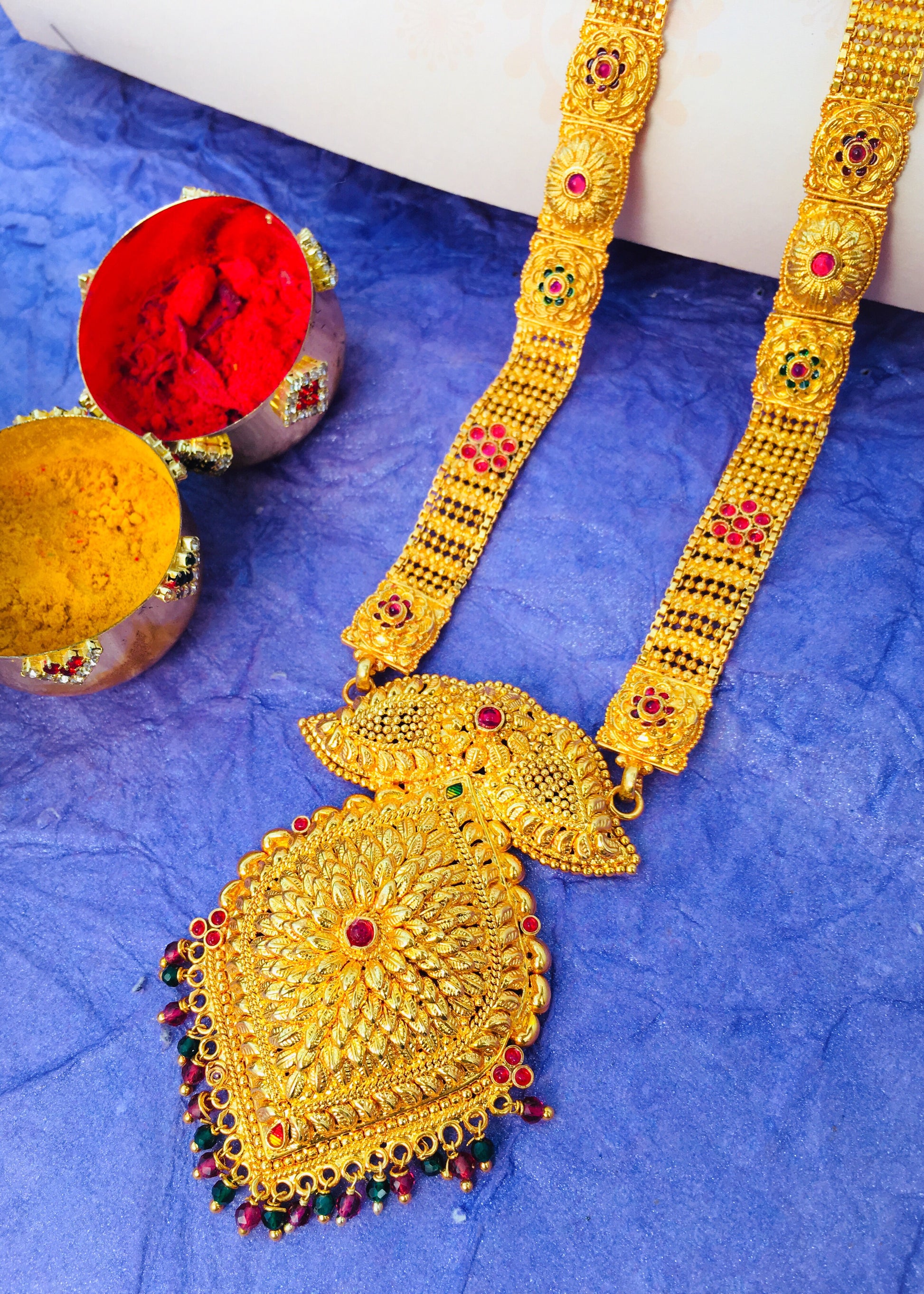 Sonchafa jewellery present the modern designer Leaf design pendant with matte gold finish and crafted with mina work which the mangalsutra one of the kind you were look for ! A perfect piece of craftsmanship. The long chain is deck with kemp stone.