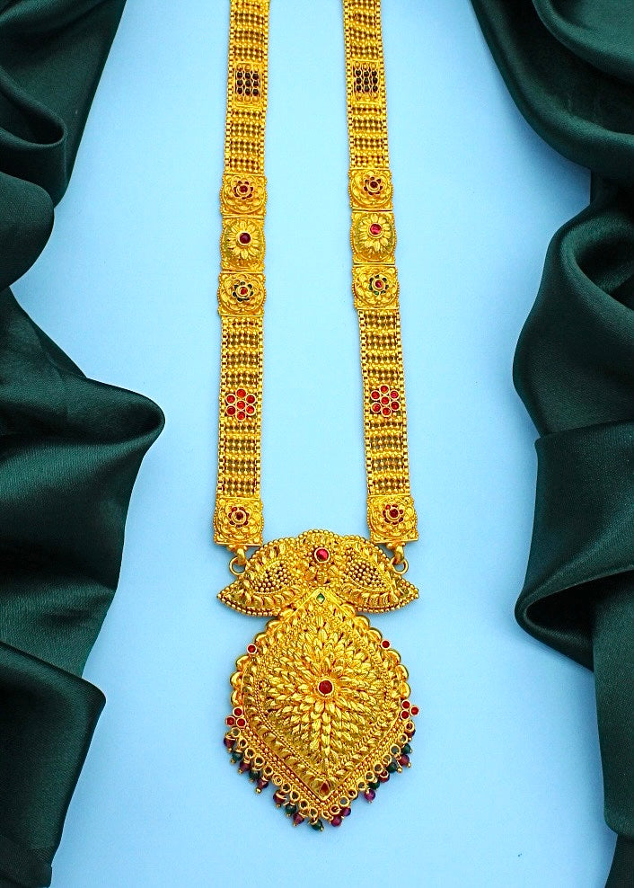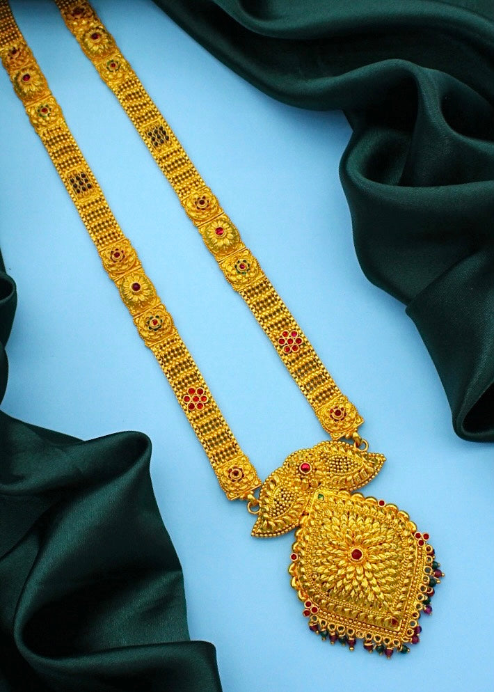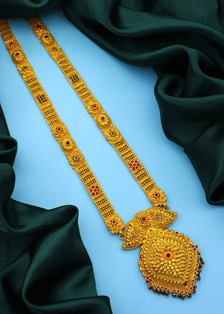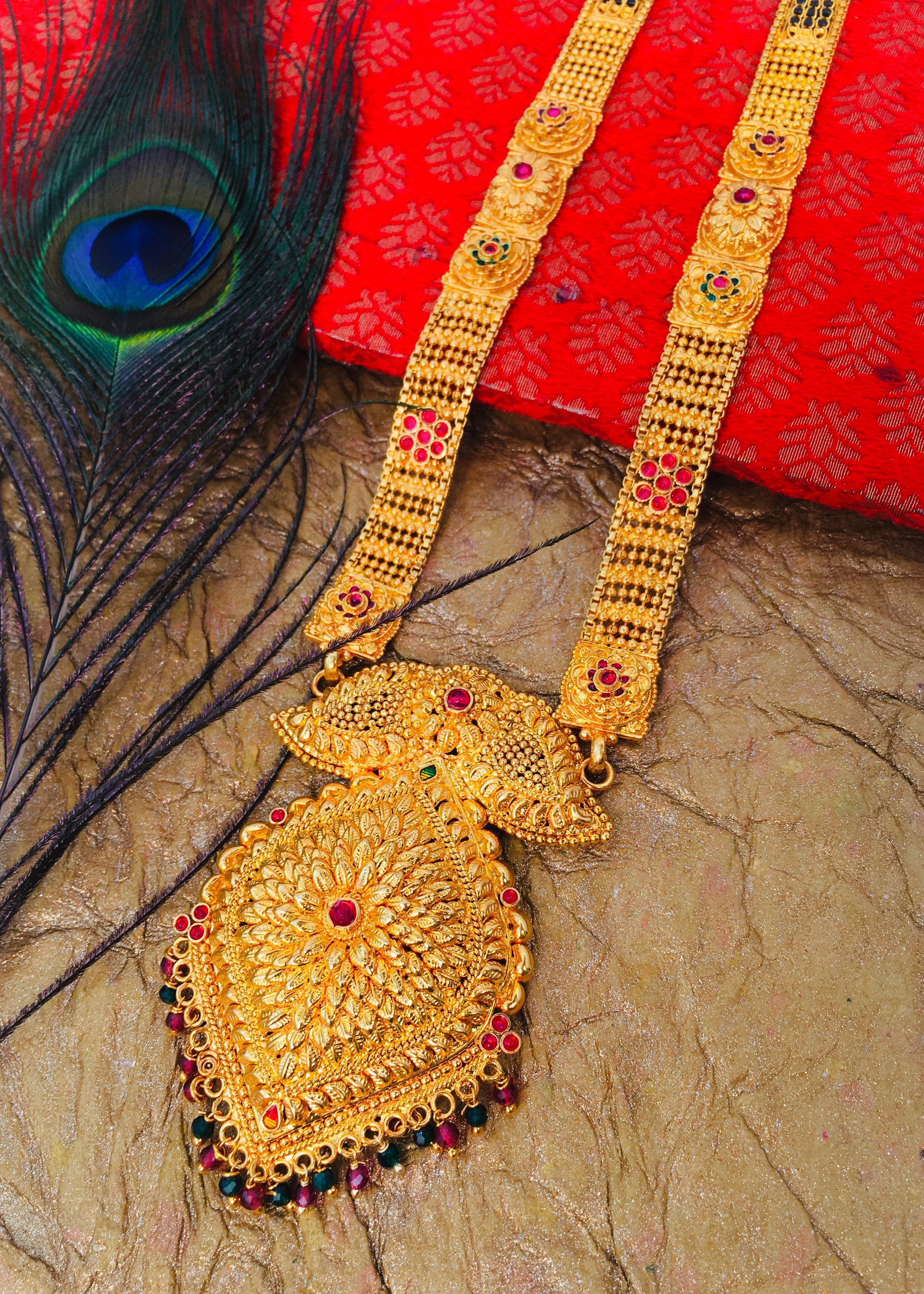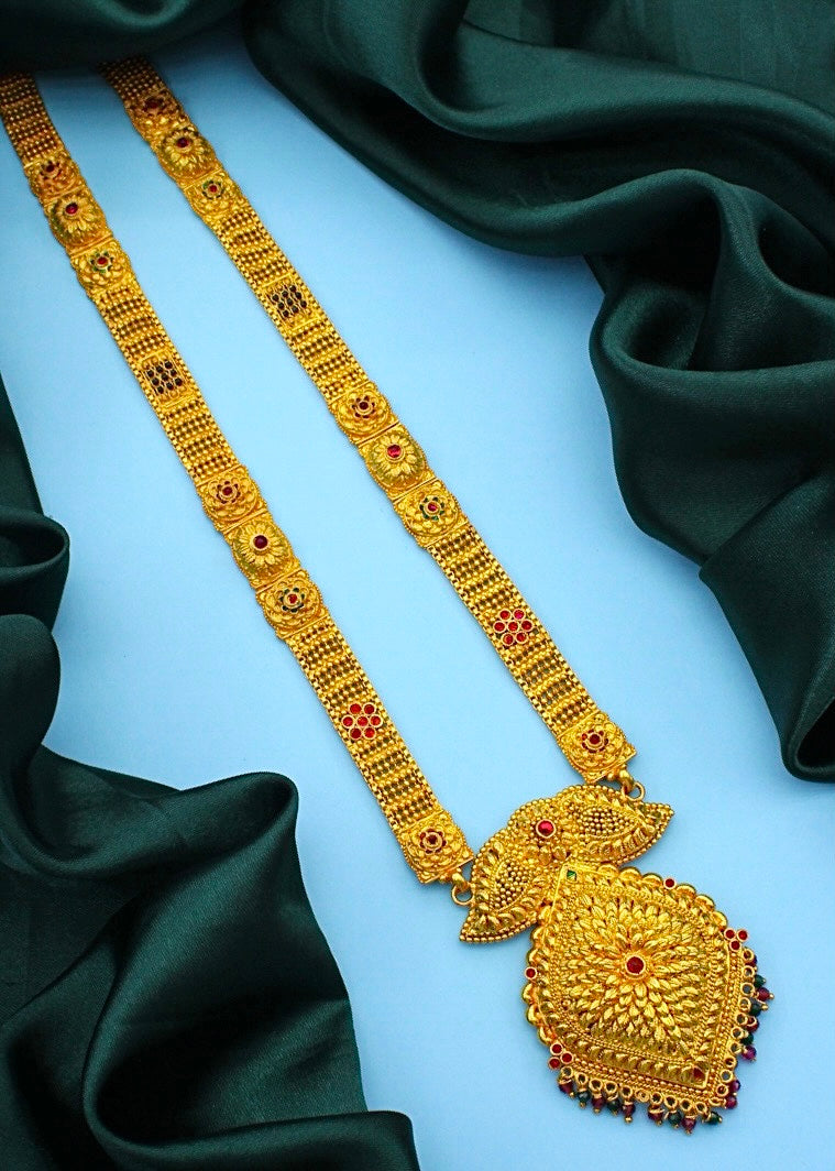 Sonchafa jewellery present the modern designer Leaf design pendant with matte gold finish and crafted with mina work which the mangalsutra one of the kind you were look for ! A perfect piece of craftsmanship. The long chain is deck with kemp stone.