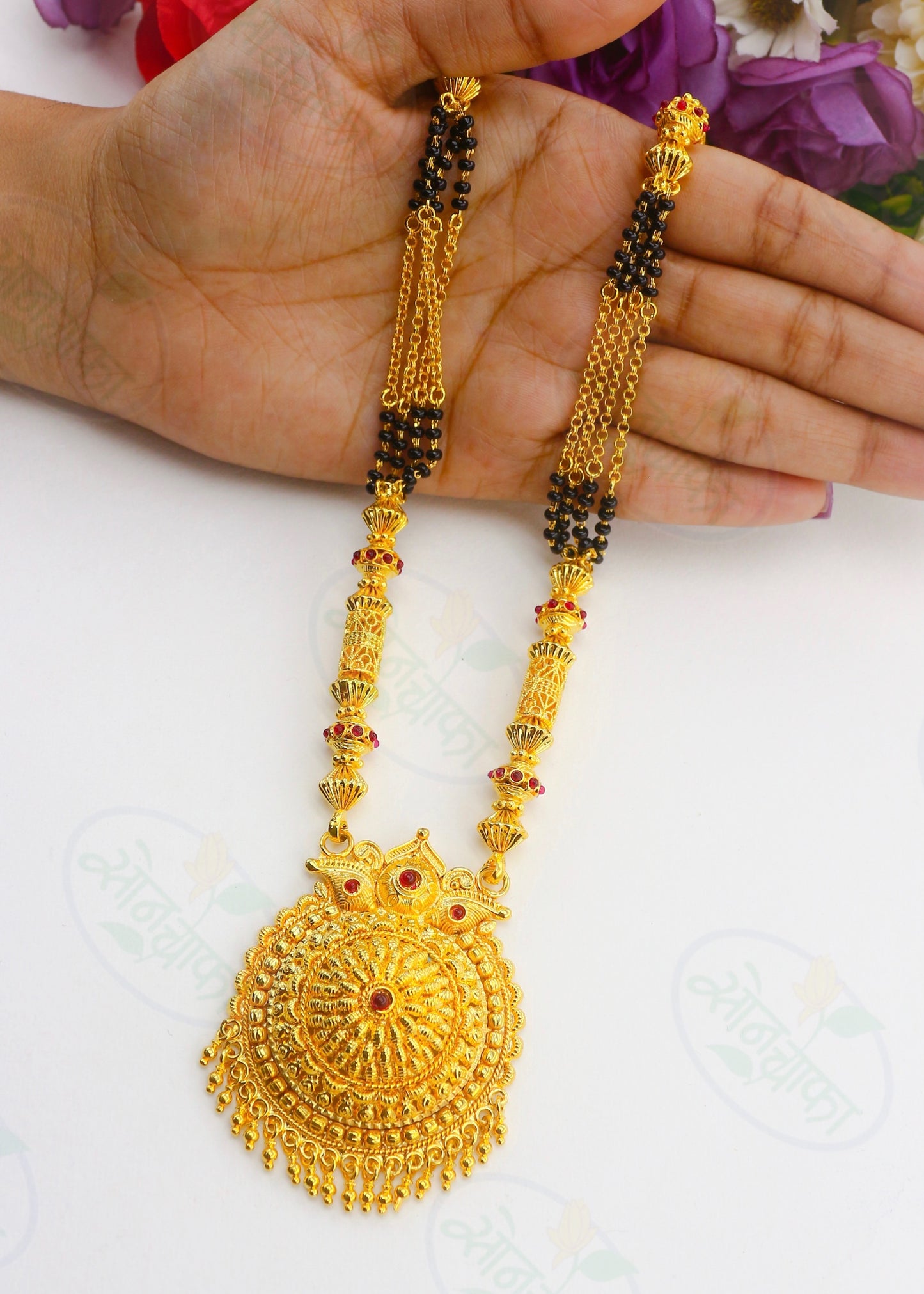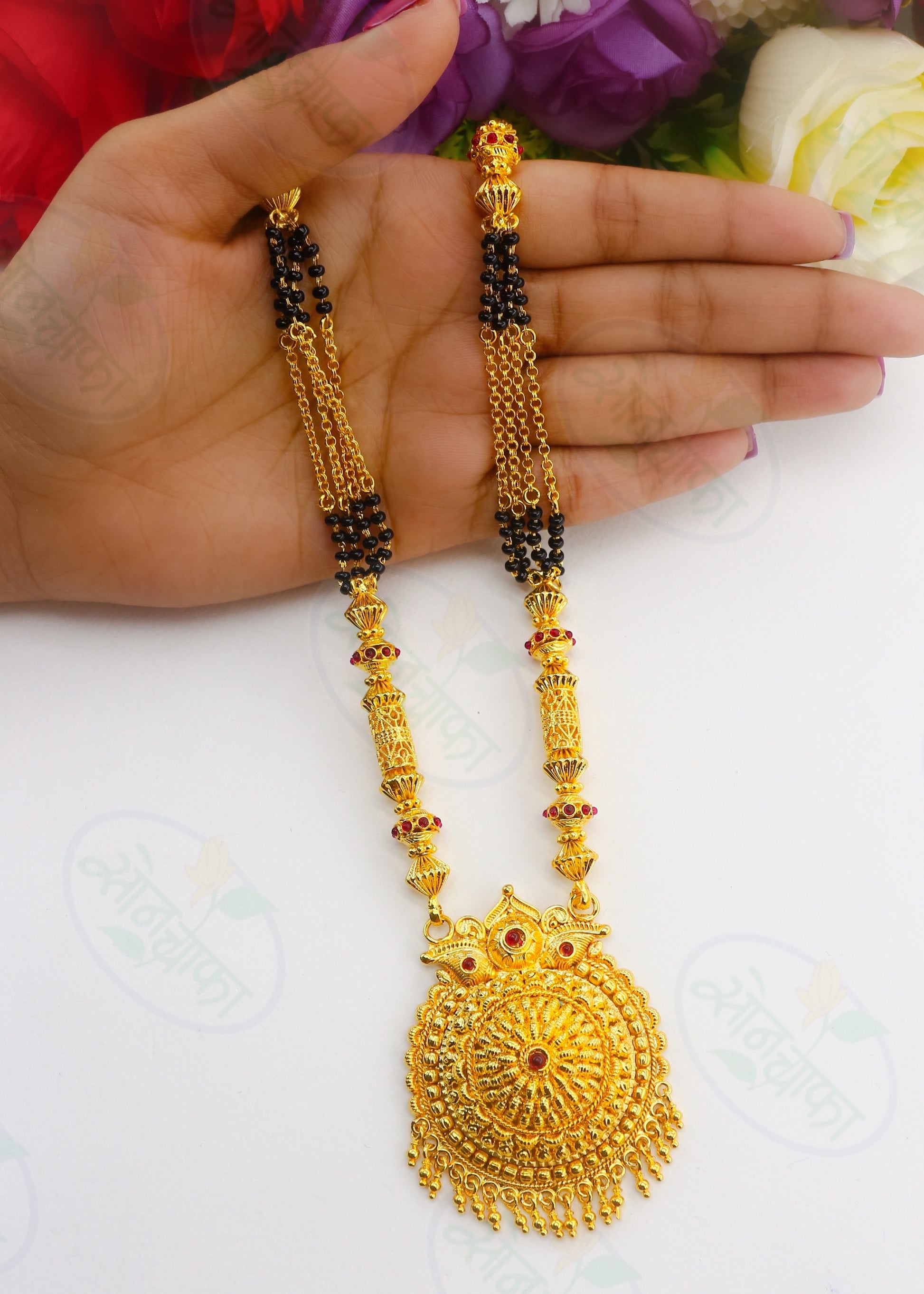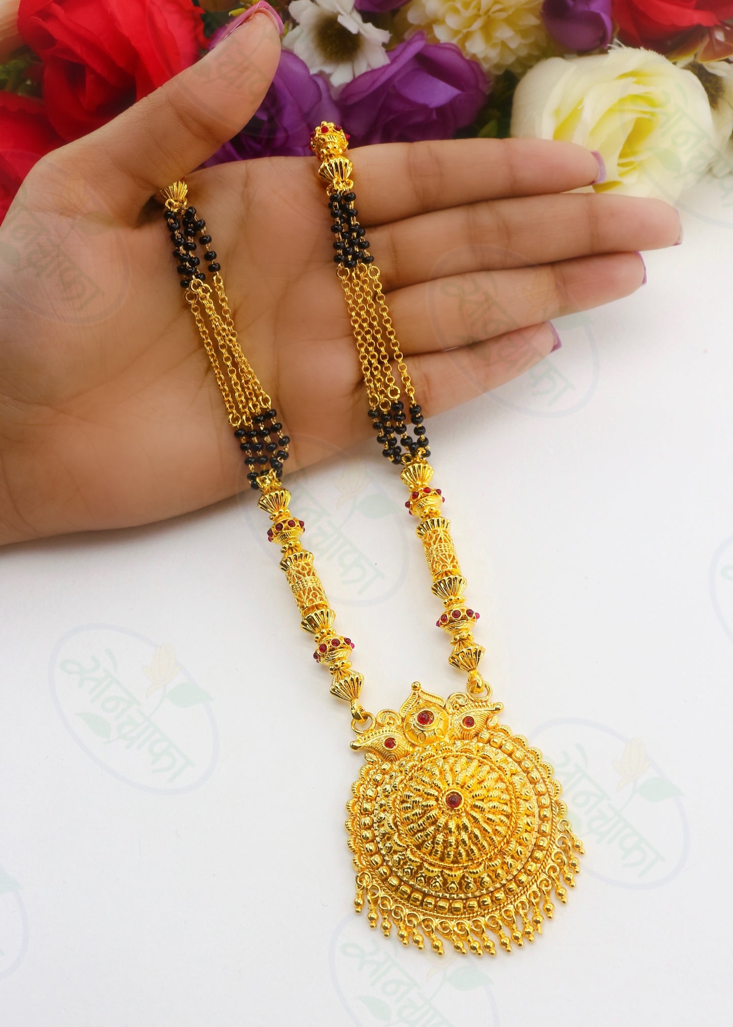 Sonchafa Jewellery brings this appealing mangalsutra for women who love to wear traditional jewellery. It is studded with shiny pink stones and fashioned from highly durable matte gold finish metal. The pendant feature attractive leaf with floral design on metal surface along with dangled golden beads.