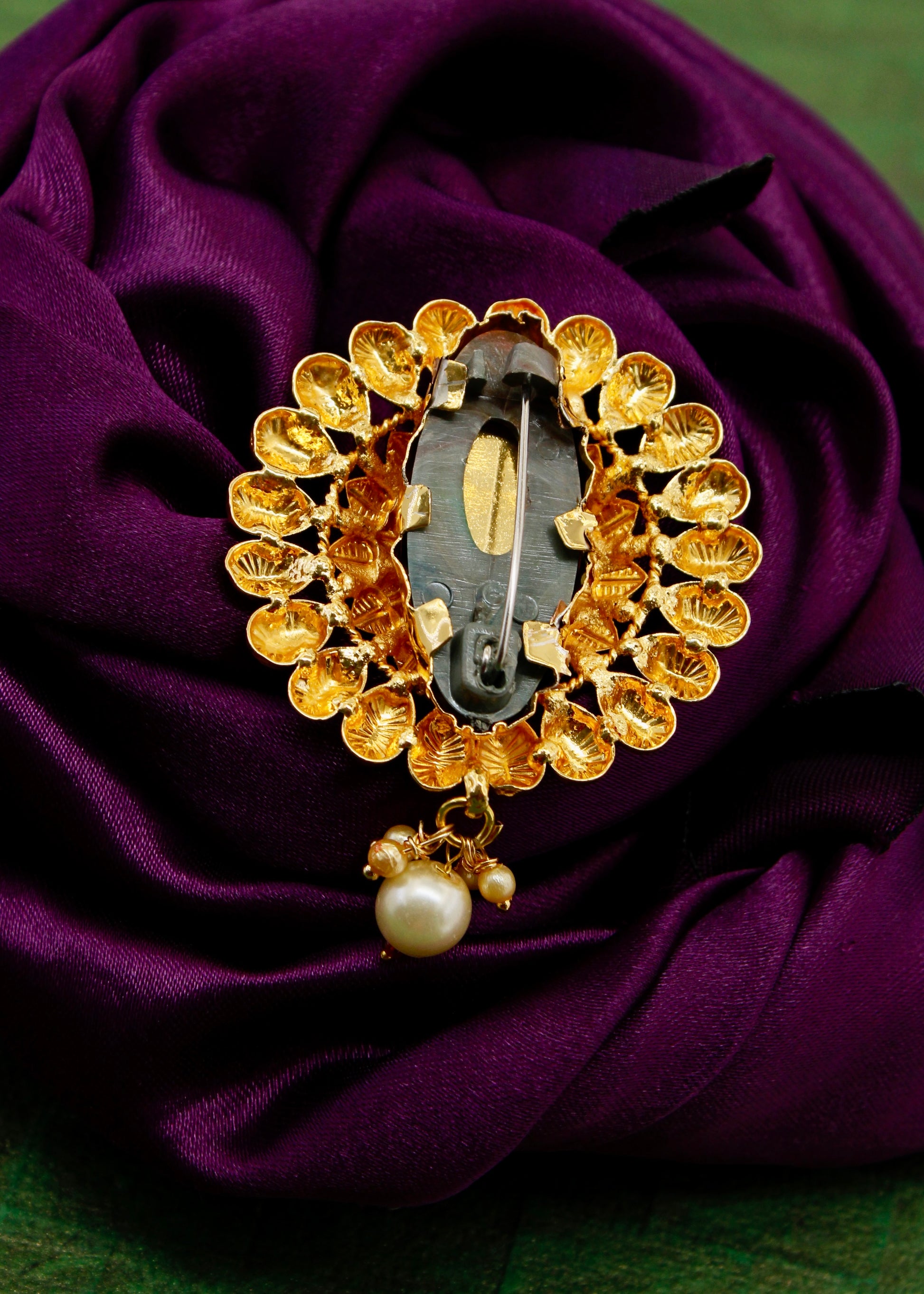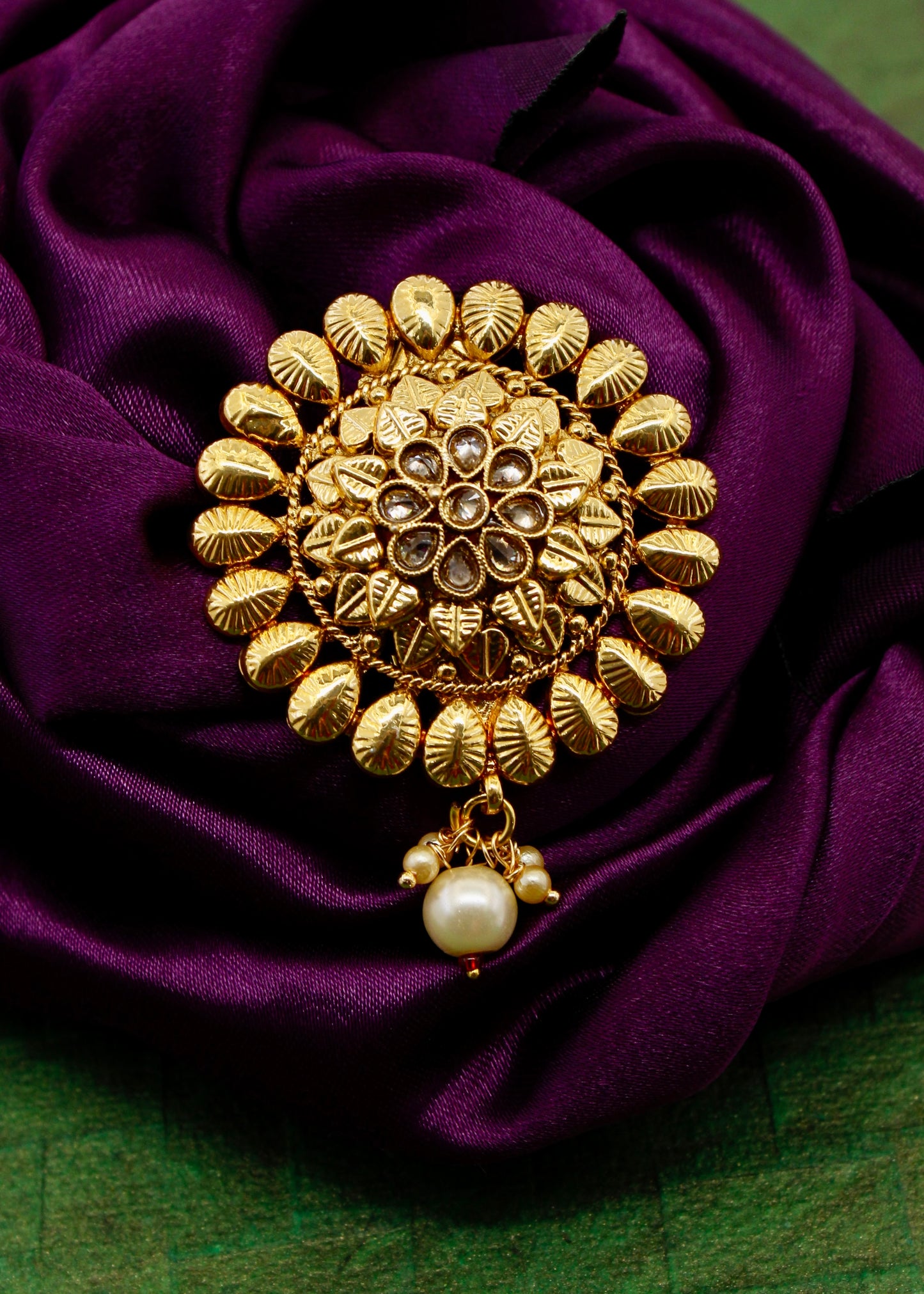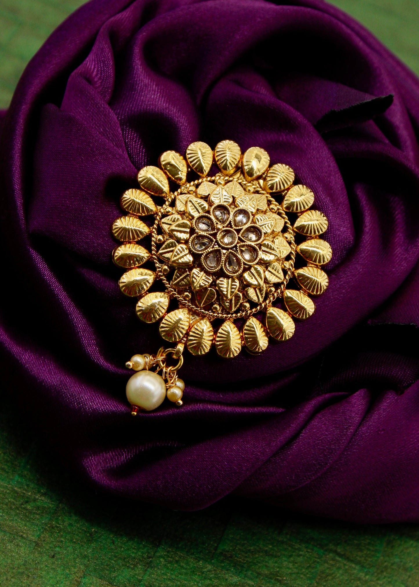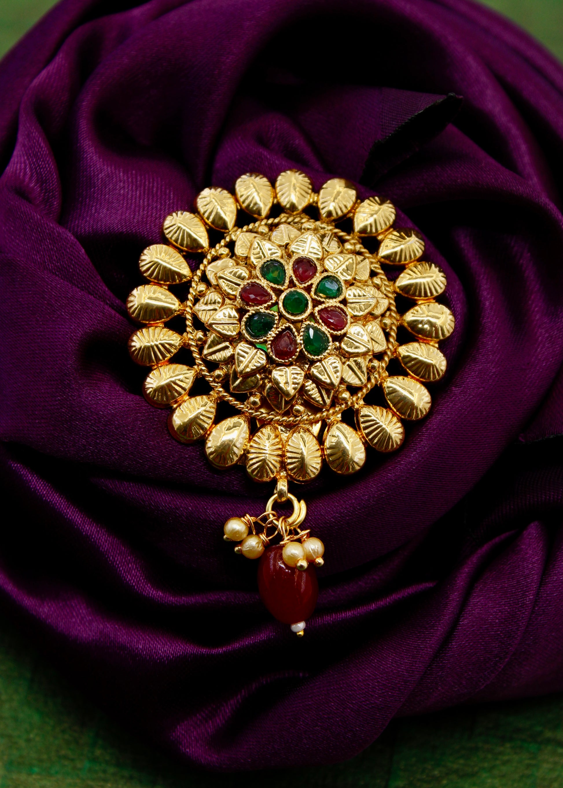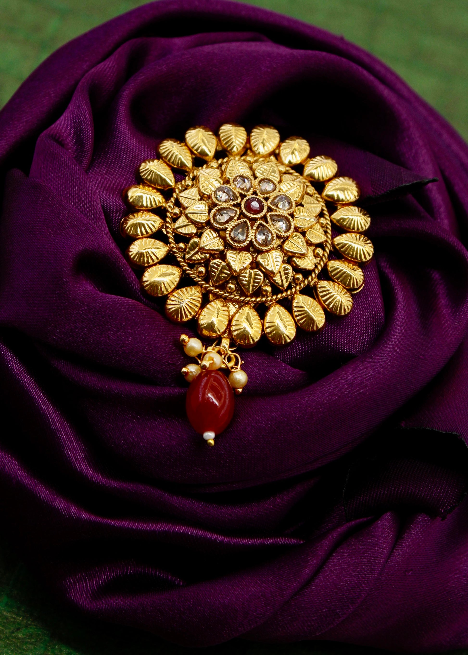 Adorn your jewellery collection with this leaf with floral designer sareepin with your festive saree and get that perfect look. It is studded with golden, pink, green stone along with dangling pearl, red beads and made from antique golden finish metal. This sareepin is long lasting and highly durable.