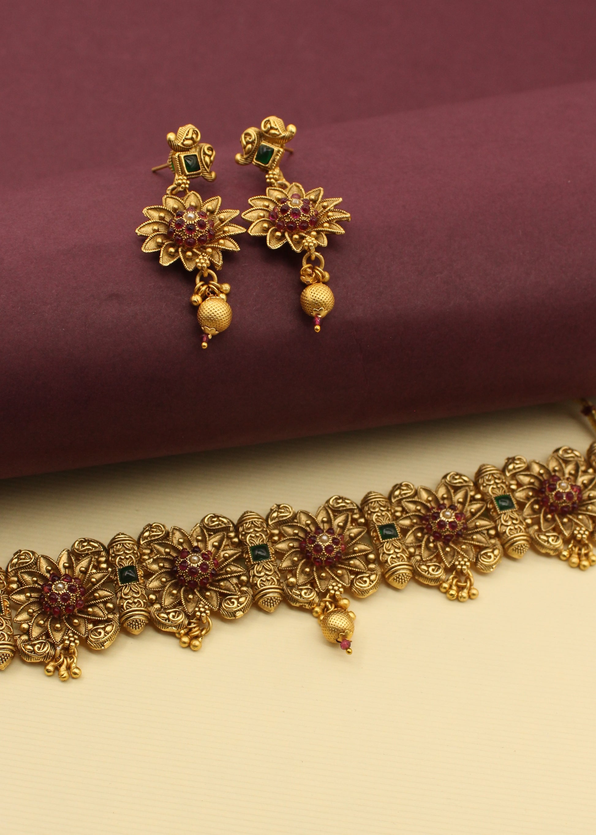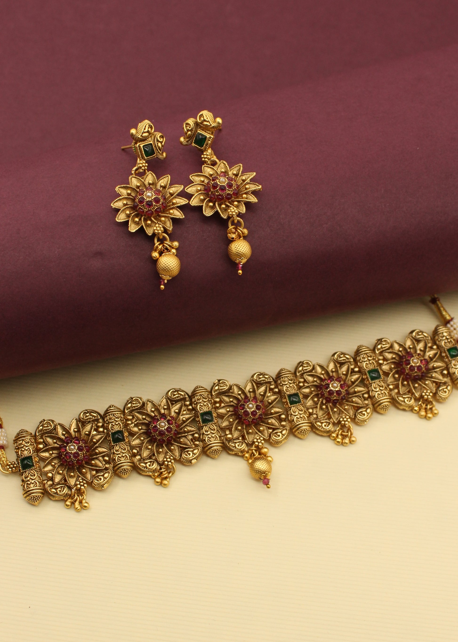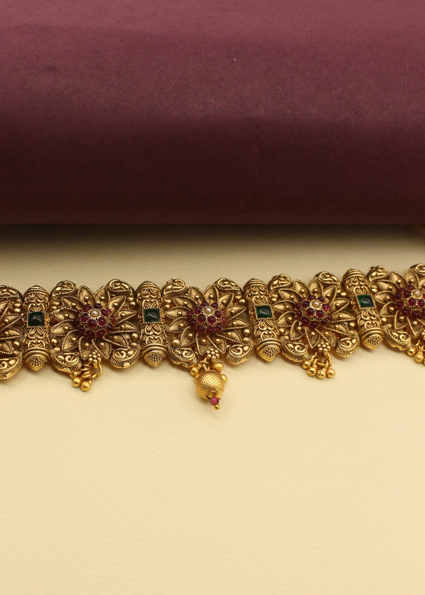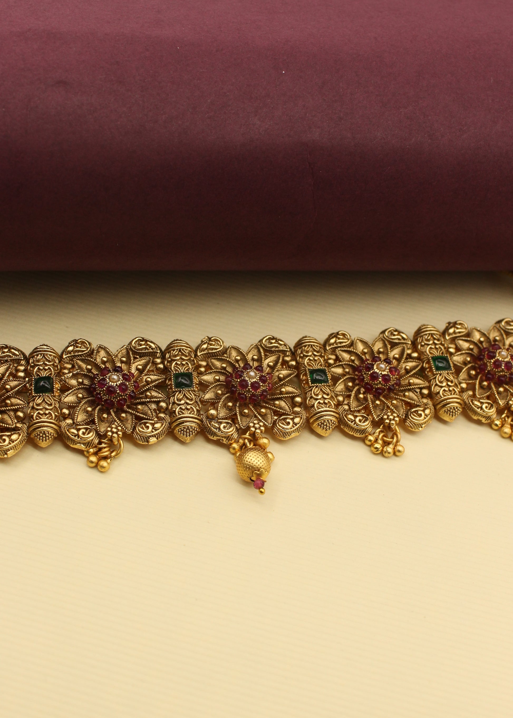 Add a classy touch to your ethnic appearance by wearing this Rajwadi choker necklace set for women from Sonchafa Jewellery. It is studded with pink, green stones and made from antique golden finish metal. Featuring an attractive design of this set will fetch you endless compliments for your amazing choice.