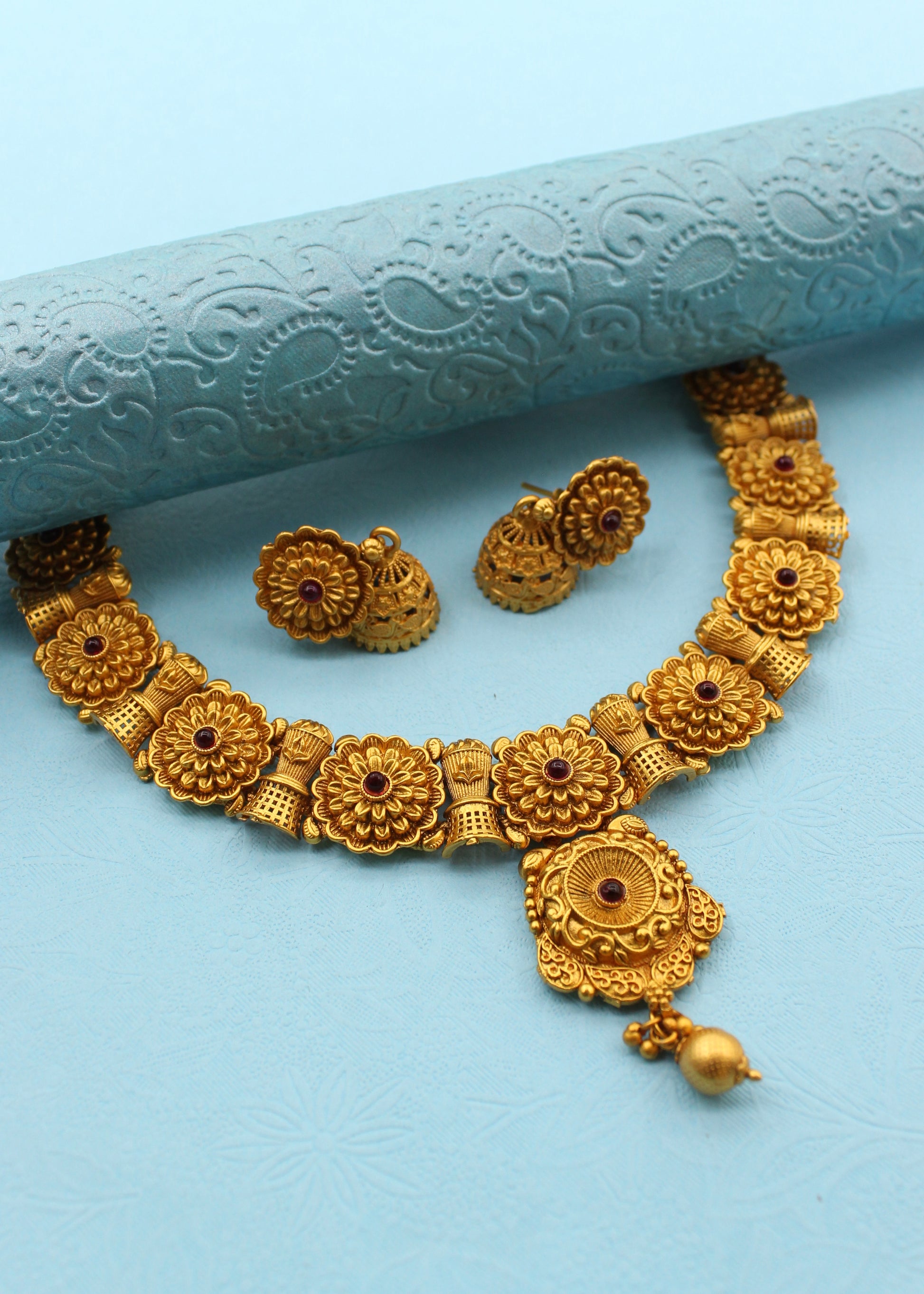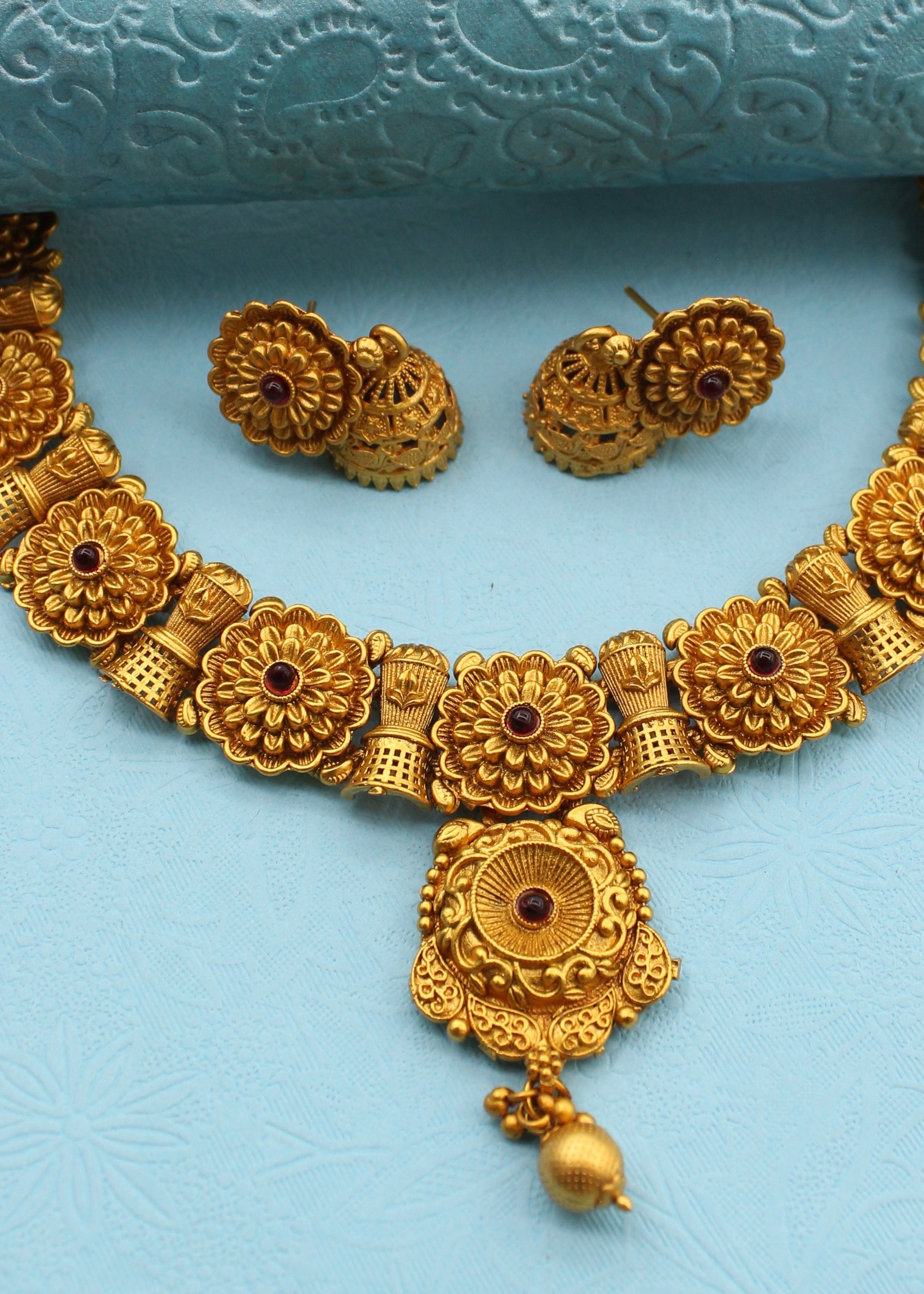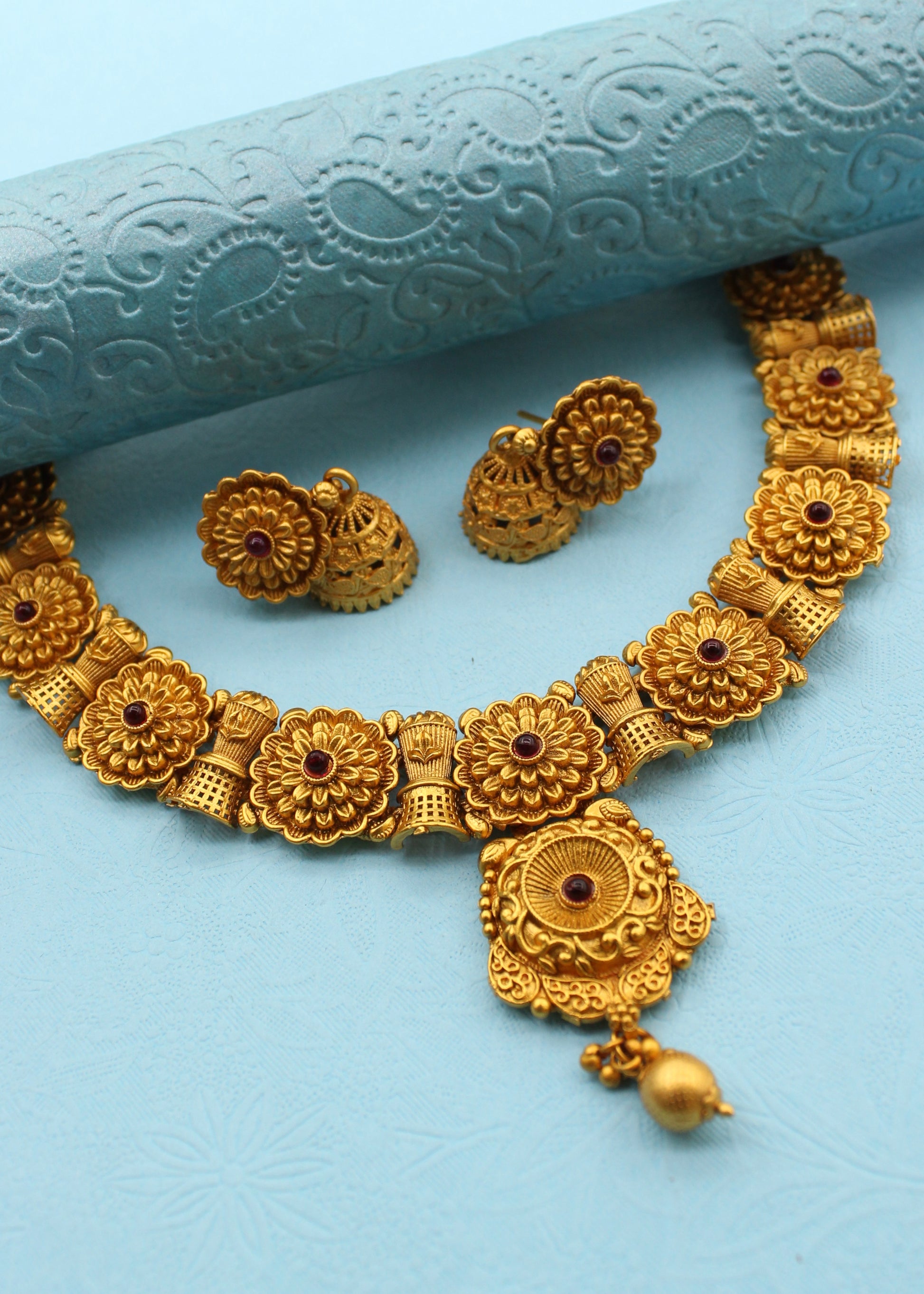 Floral designer necklace set from Sonchafa Jewellery for your traditional look. This necklace feature floral carving on metal surface. It is studded with pink stone and made from matte gold finish metal. This jewellery will fetch you lots of compliments from onlookers for your amazing choice.