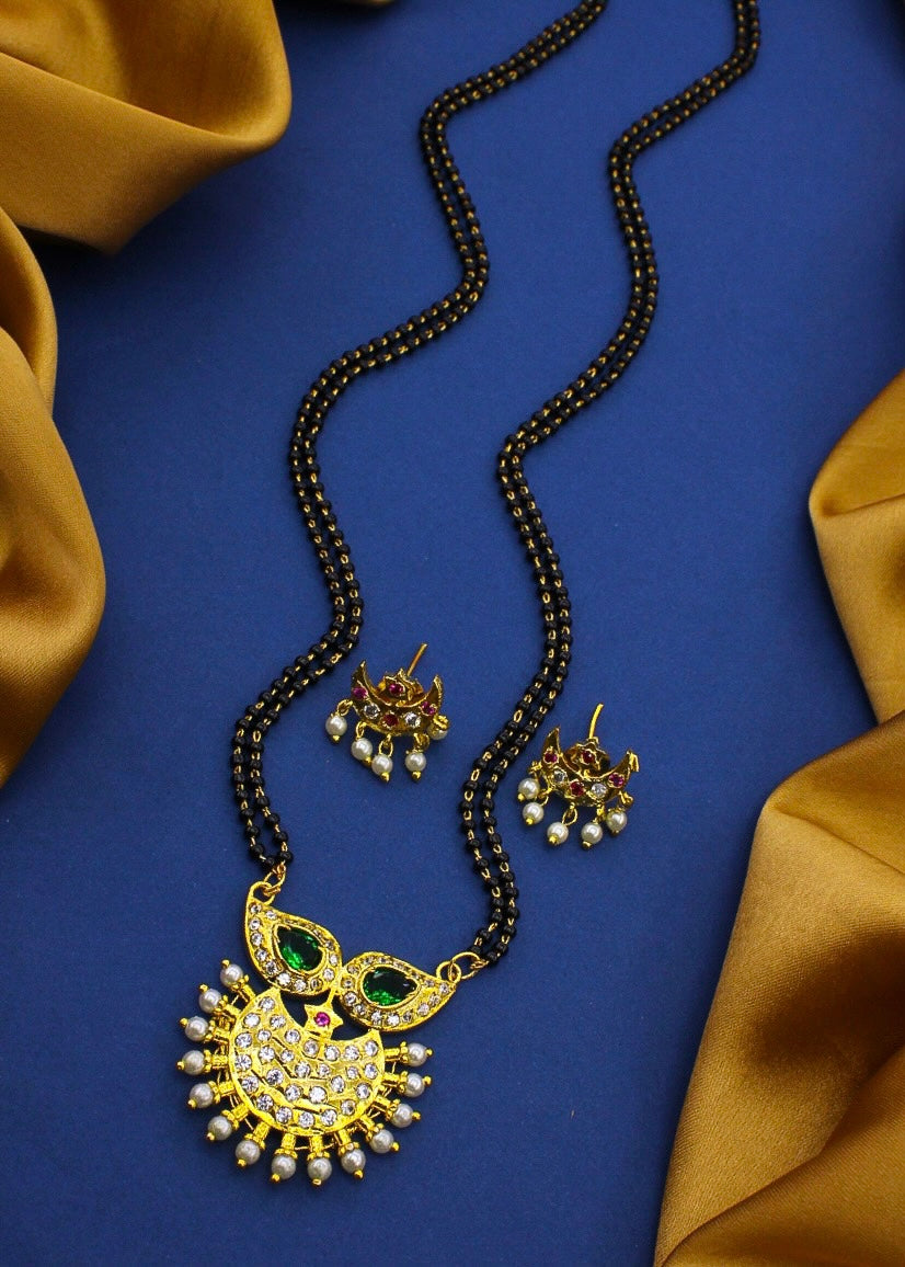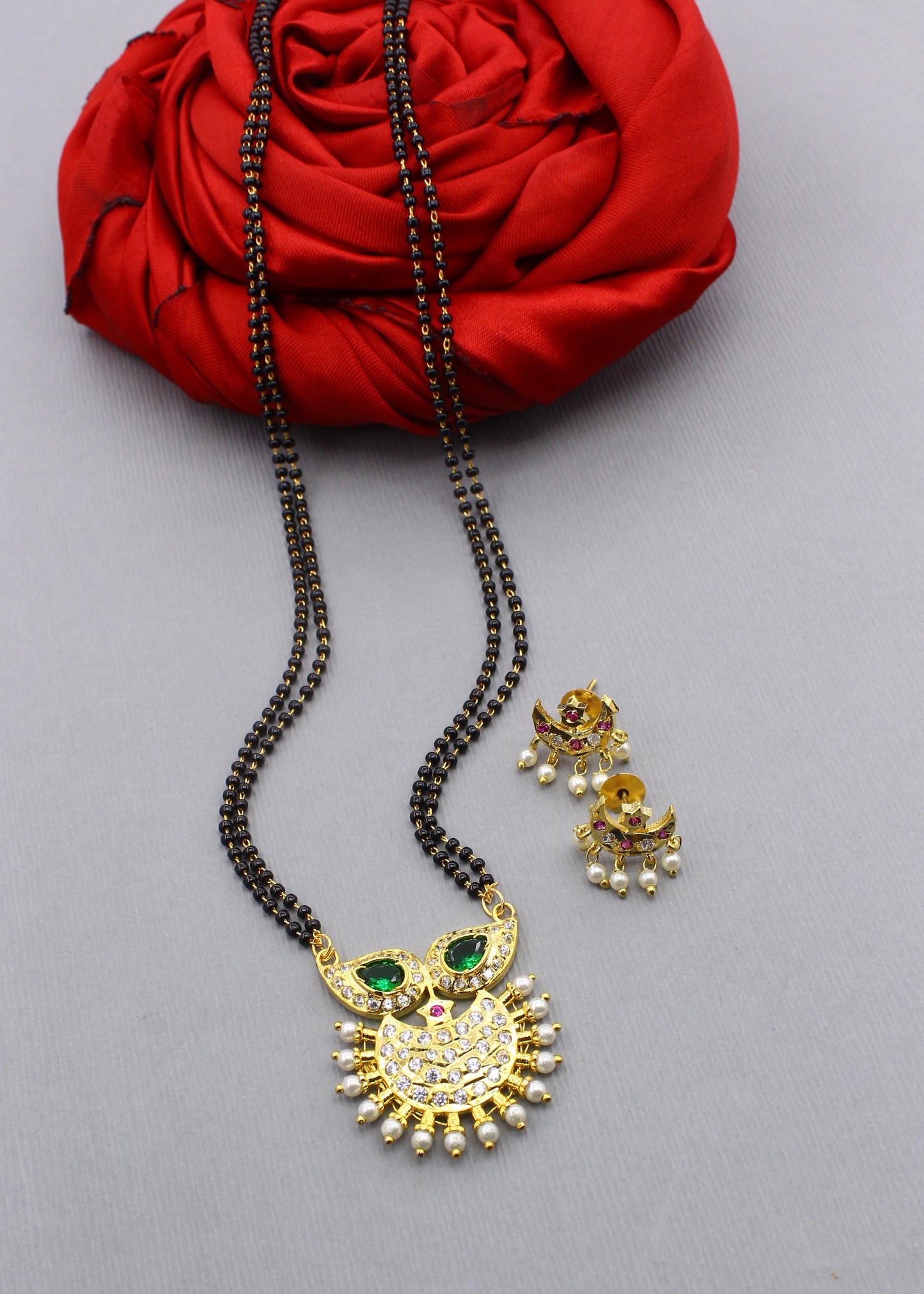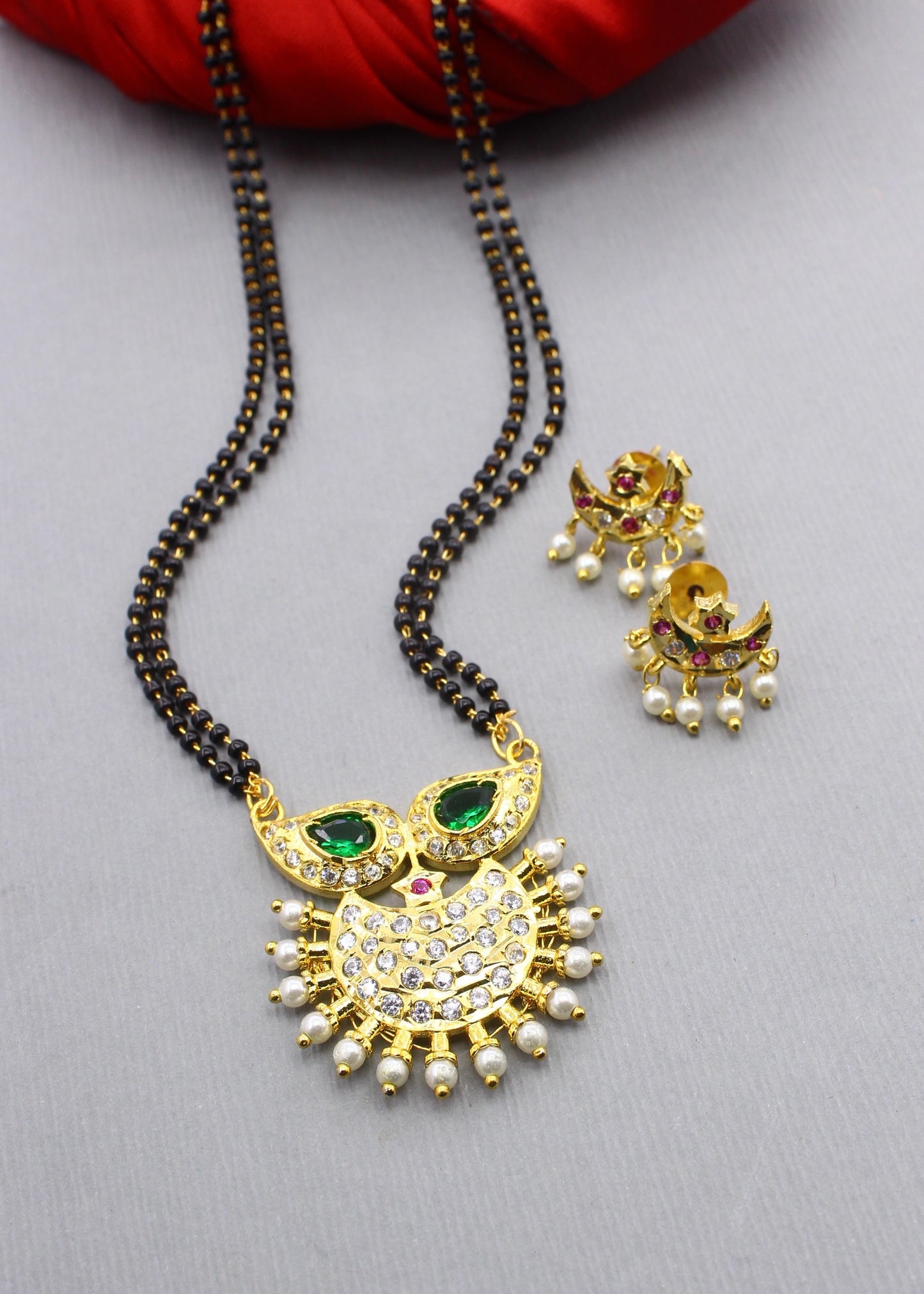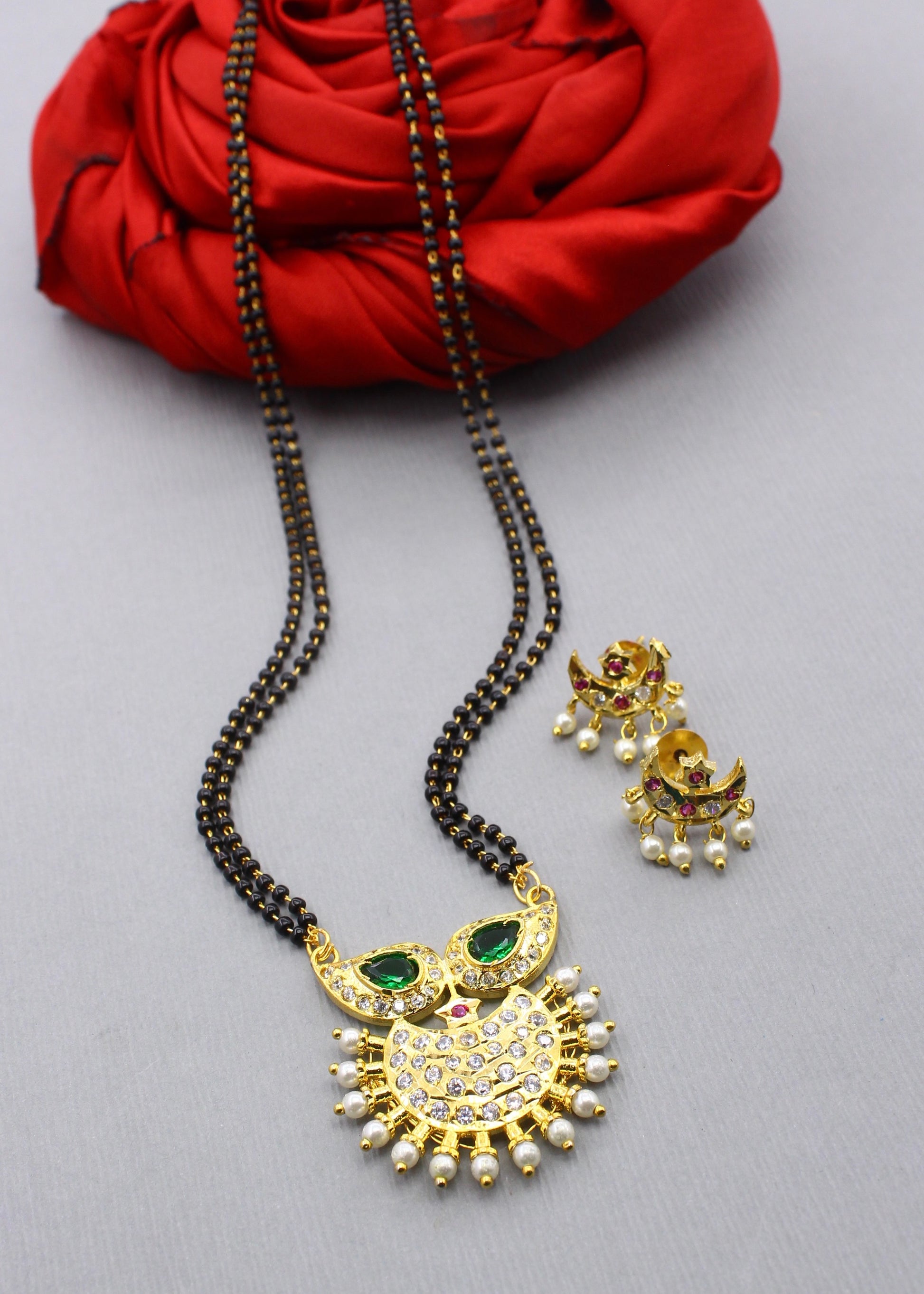 Sonchafa Jewellers brings this excellent designed mangalsutra for modern married women. It is wonderfully crafted with golden finish metal and studded with pink, green, white stone along with pearl beads. This designer mangalsutra has matching earrings for more attractive look.