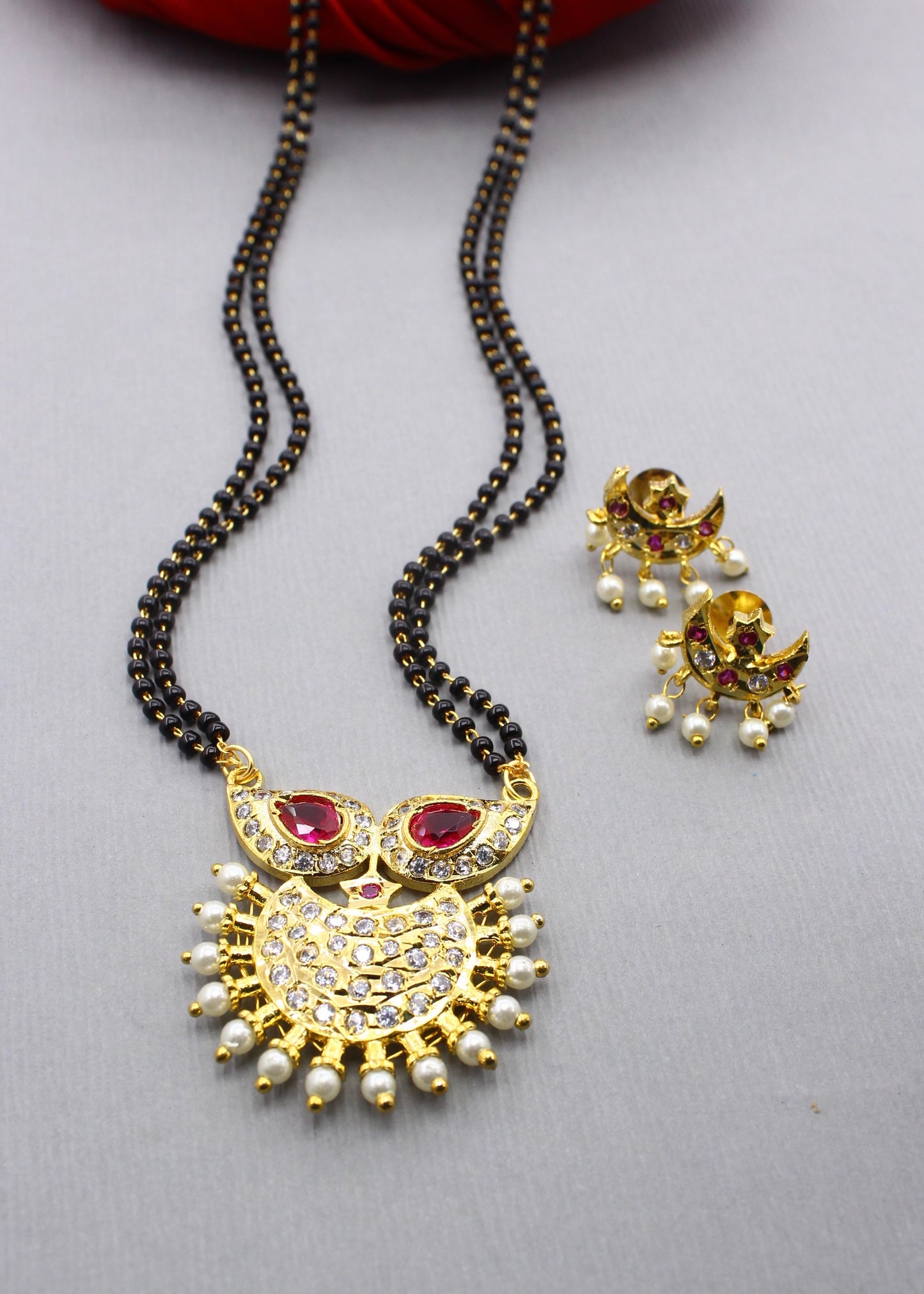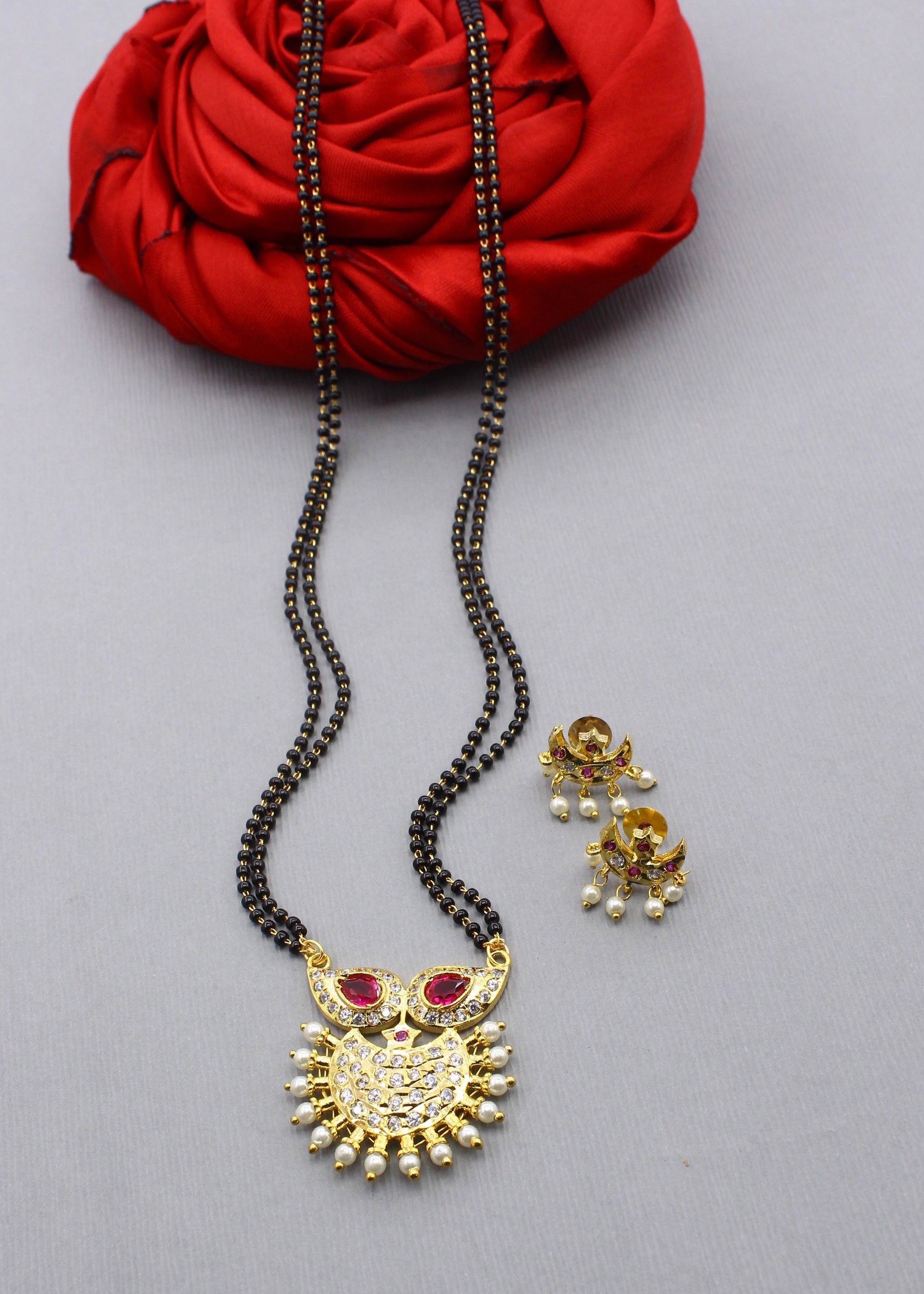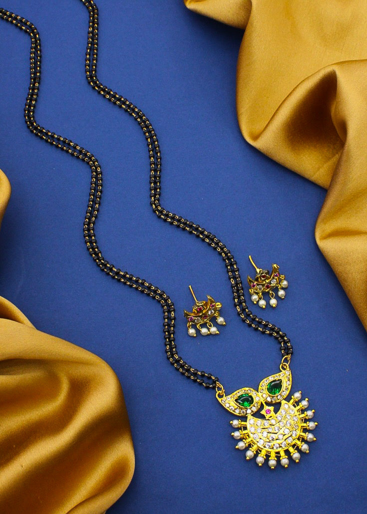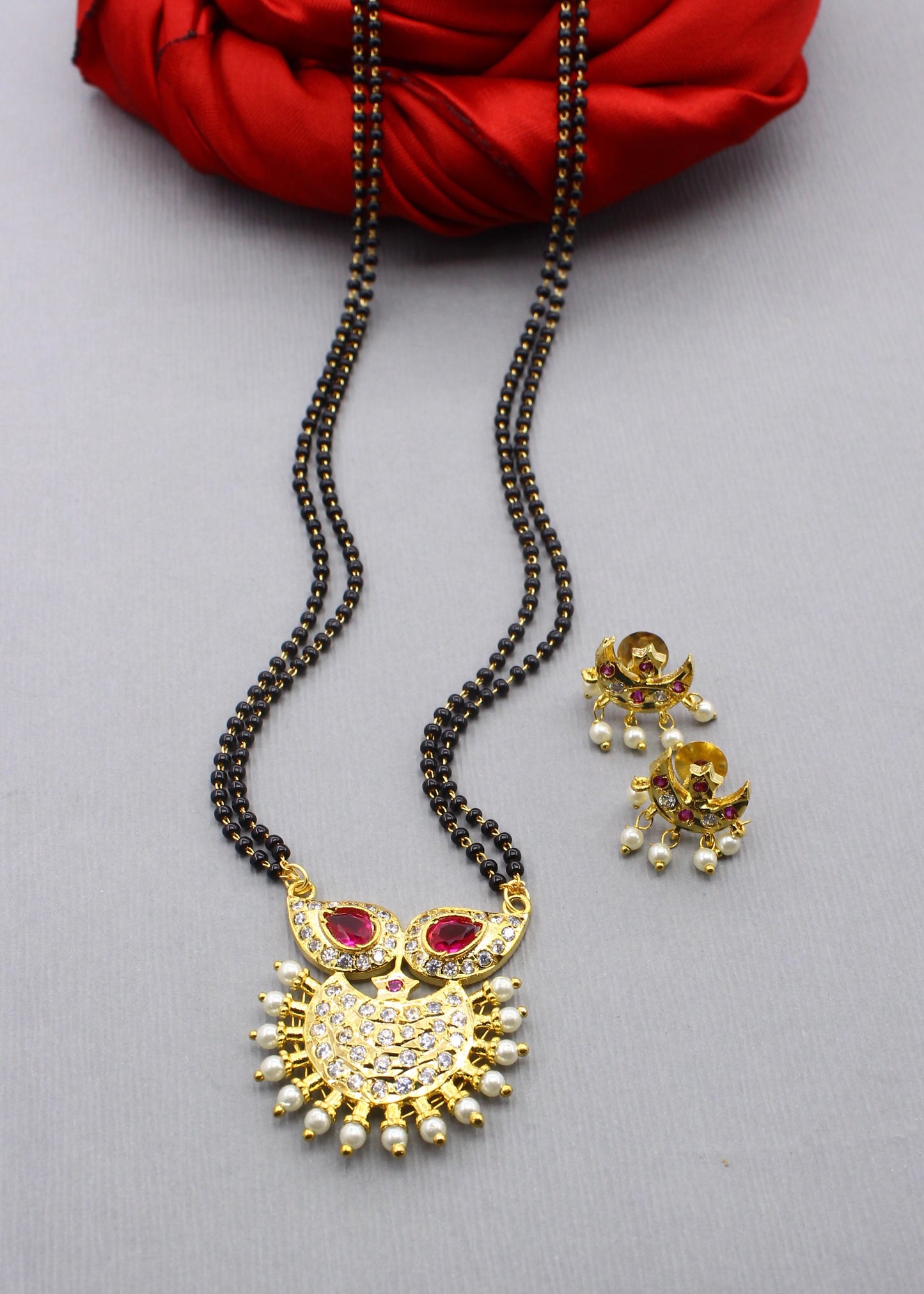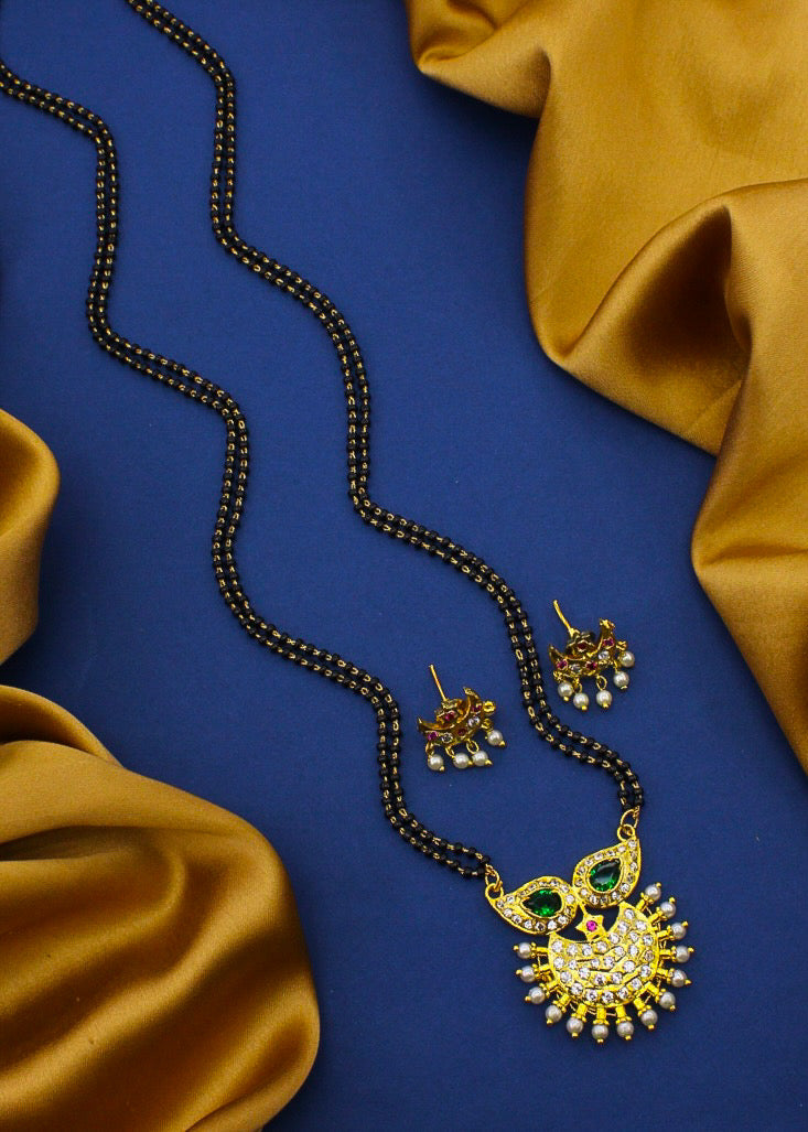 Sonchafa Jewellers brings this excellent designed mangalsutra for modern married women. It is wonderfully crafted with golden finish metal and studded with pink, green, white stone along with pearl beads. This designer mangalsutra has matching earrings for more attractive look.