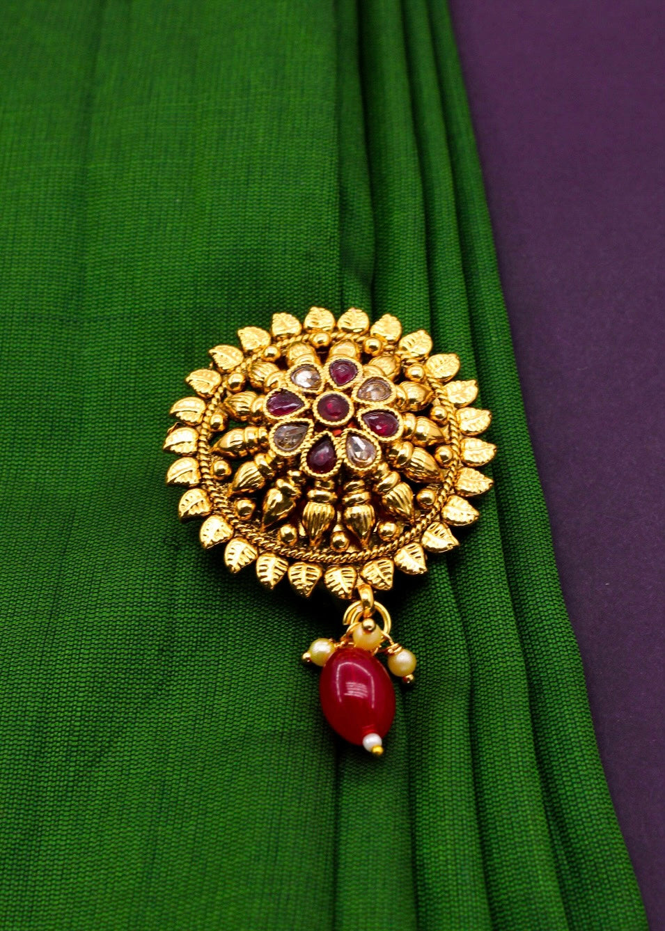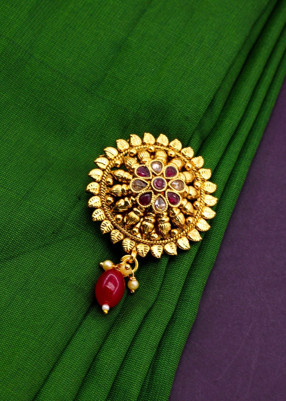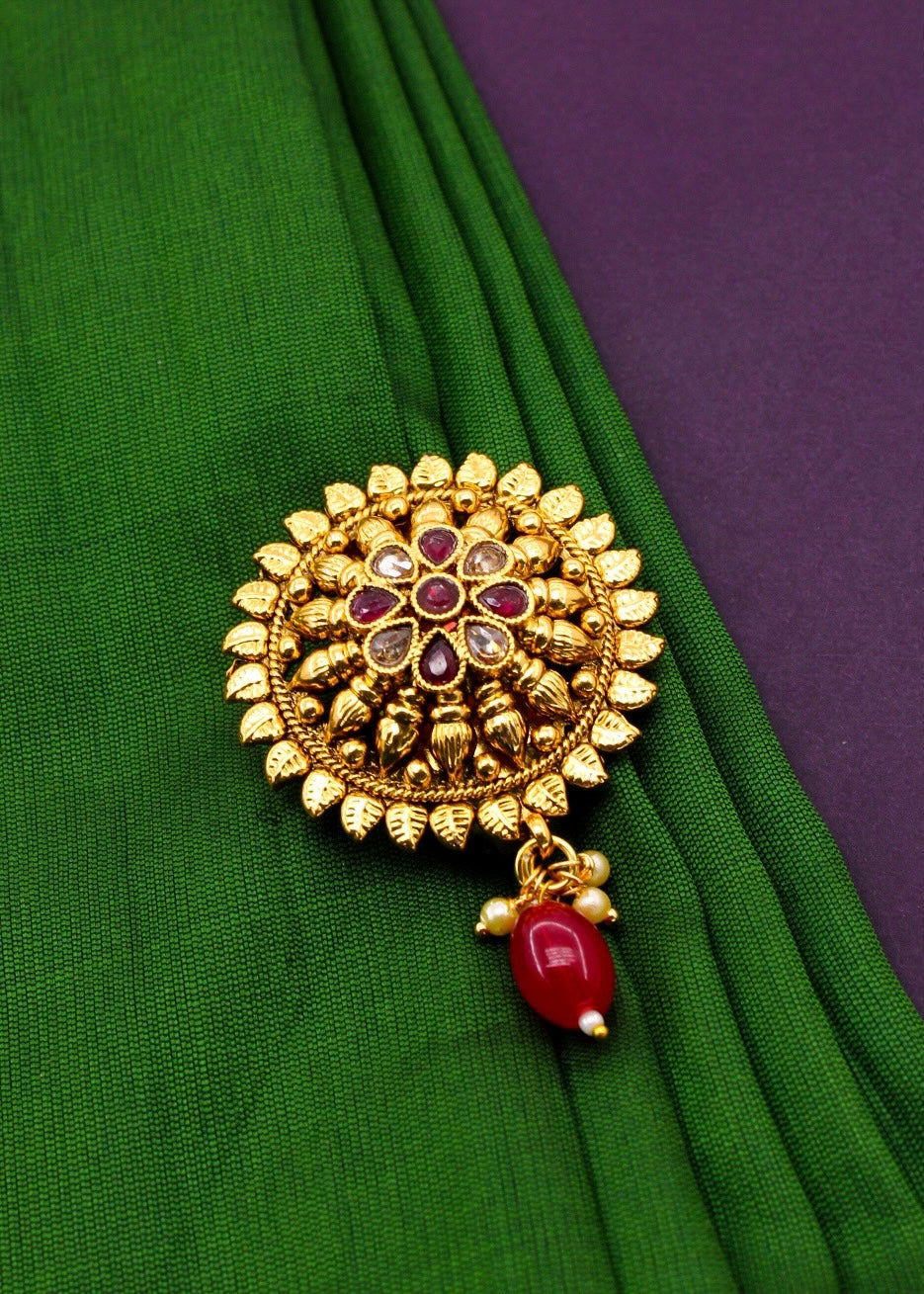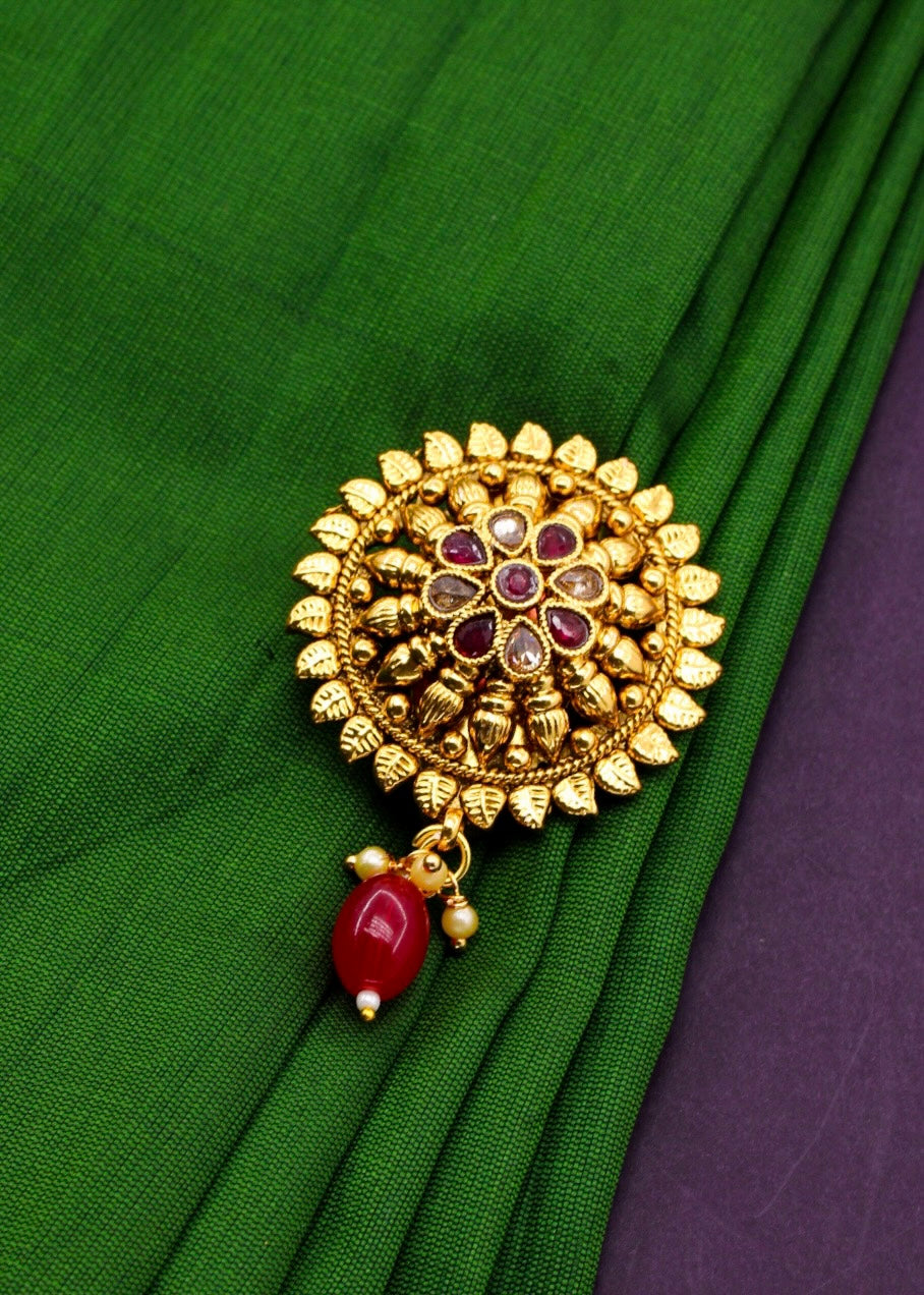 Adorn your jewellery collection with this leaf with floral designer sareepin with your festive saree and get that perfect look. It is studded with golden, pink stone along with dangling red beads and made from antique golden finish metal. This sareepin is long lasting and highly durable.
