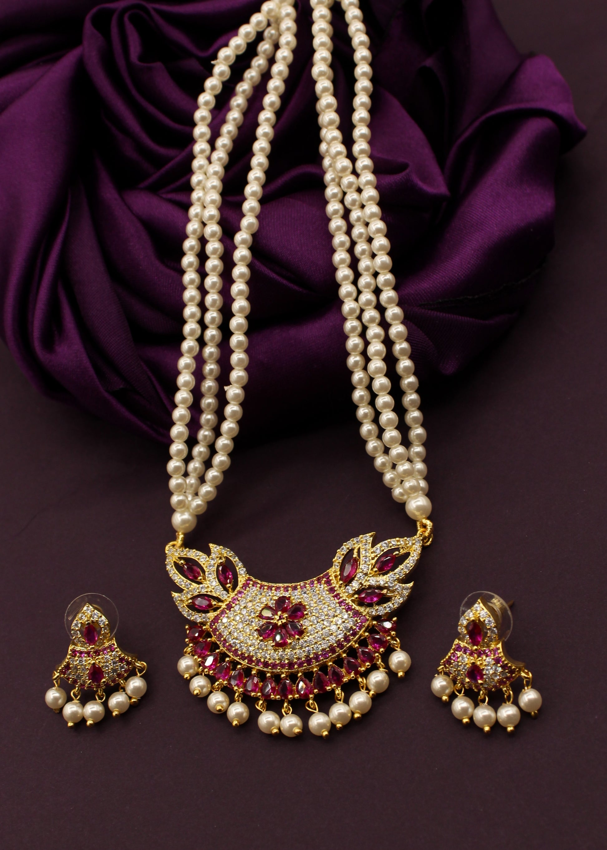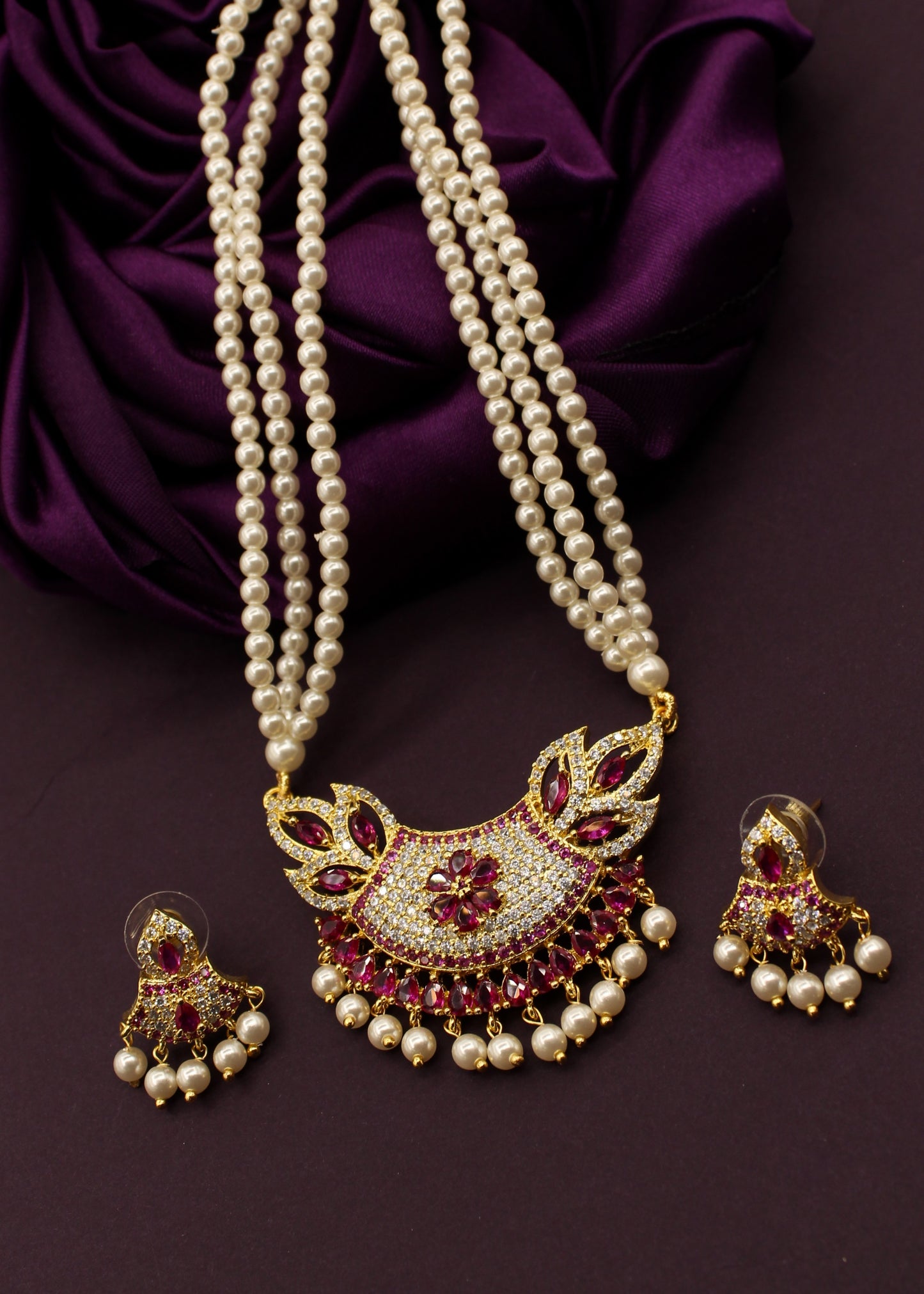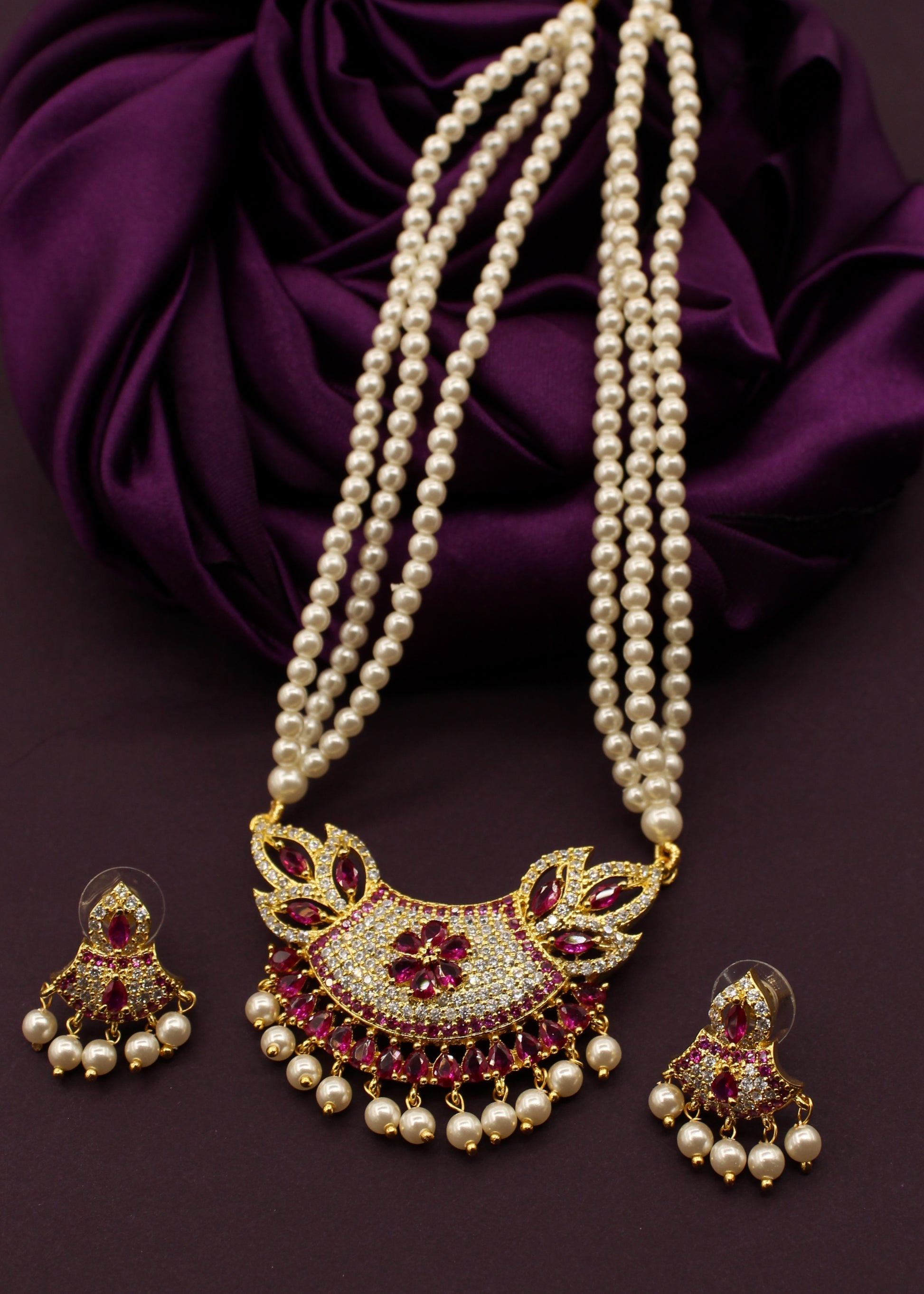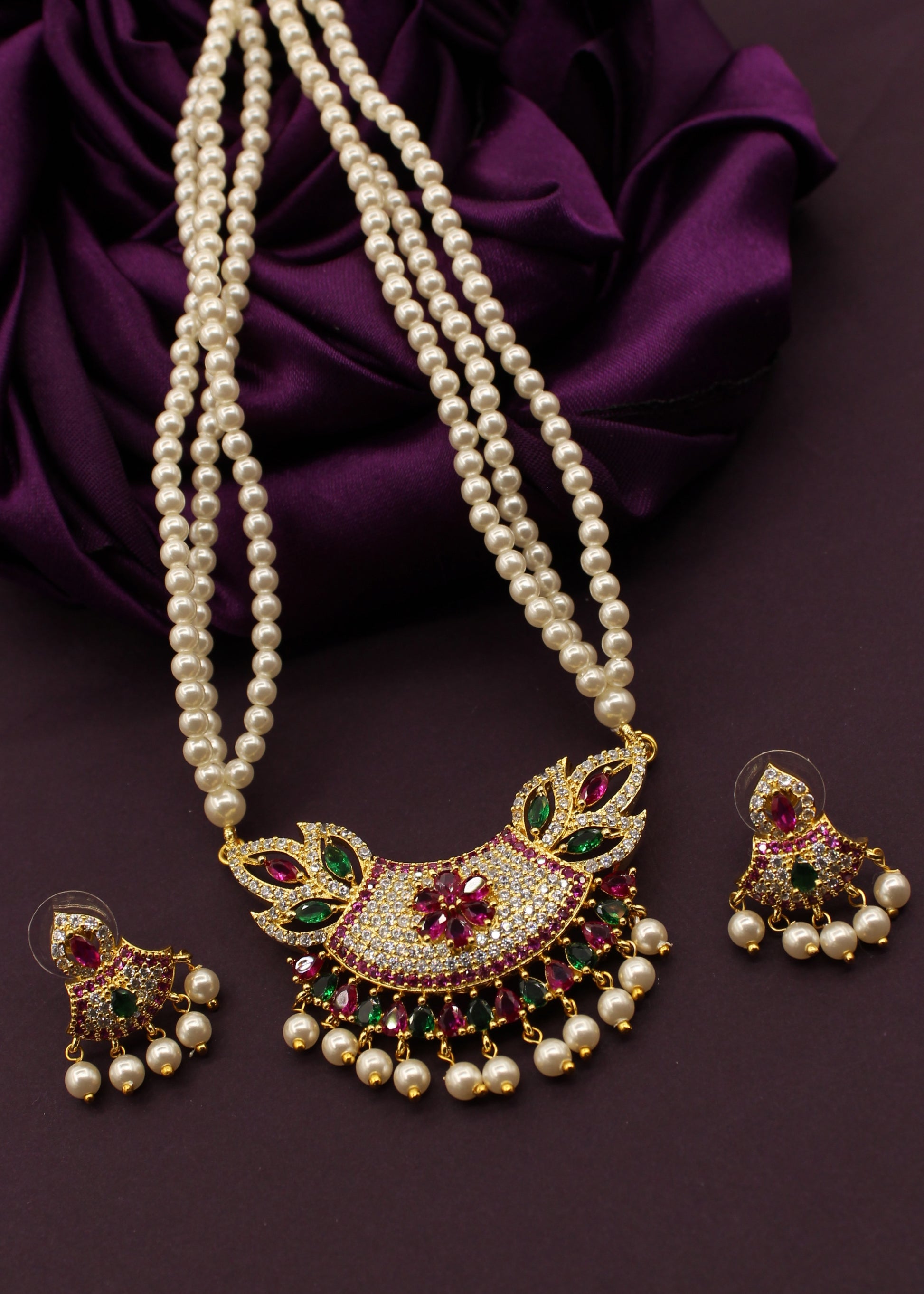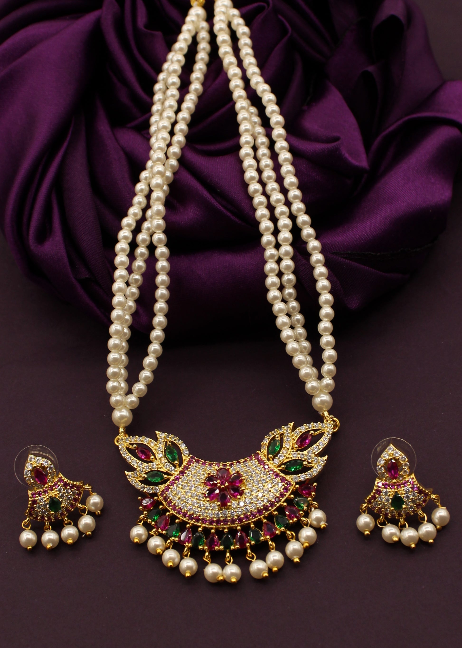 Classic moti necklace set from Sonchafa Jewellery will strike you at very first look. It is styled with wonderful embedded with pink-green stones. This classy necklace set is high in quality and will be your fashion companion for many years. In addition it has golden finish pendant for added attraction.