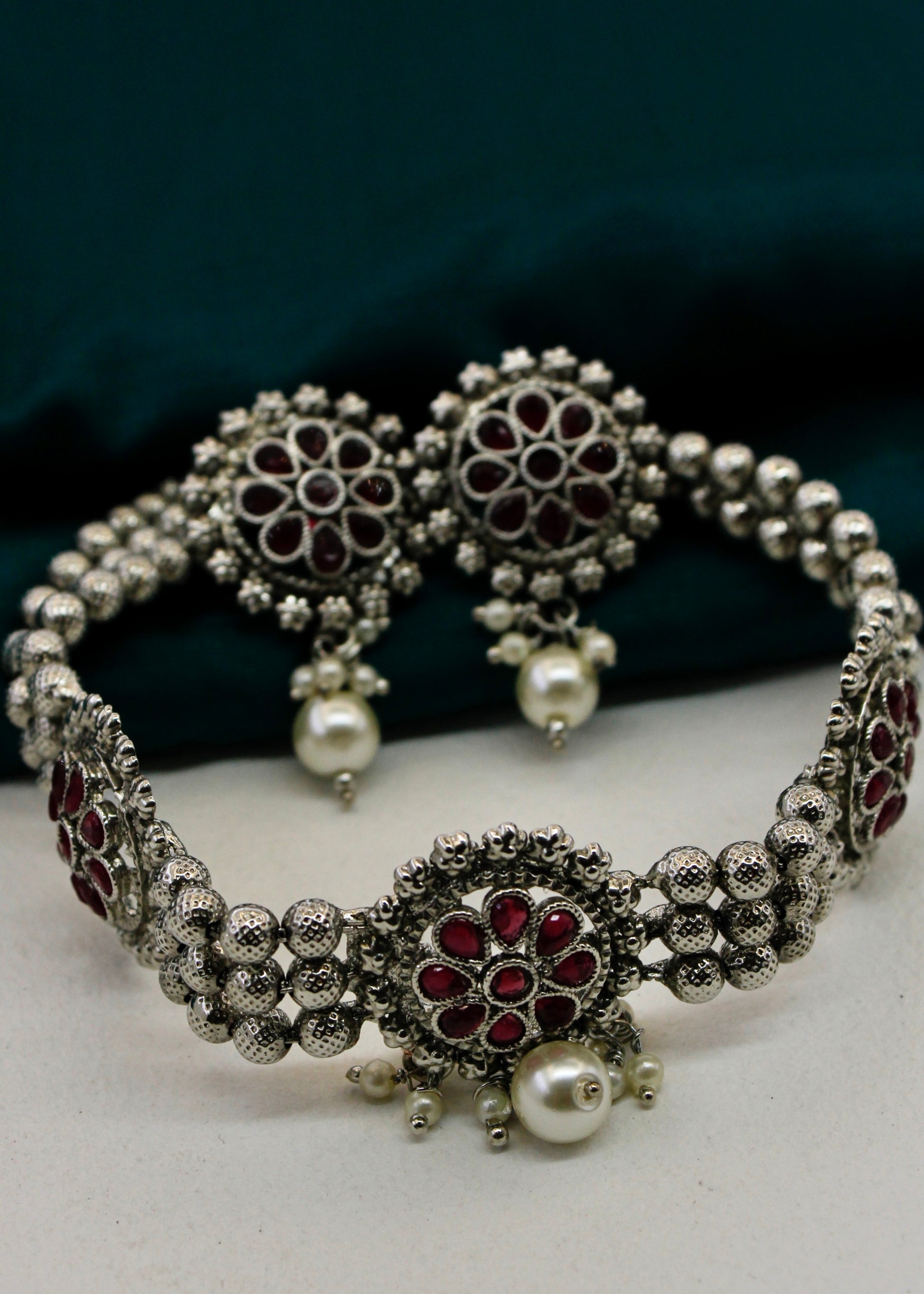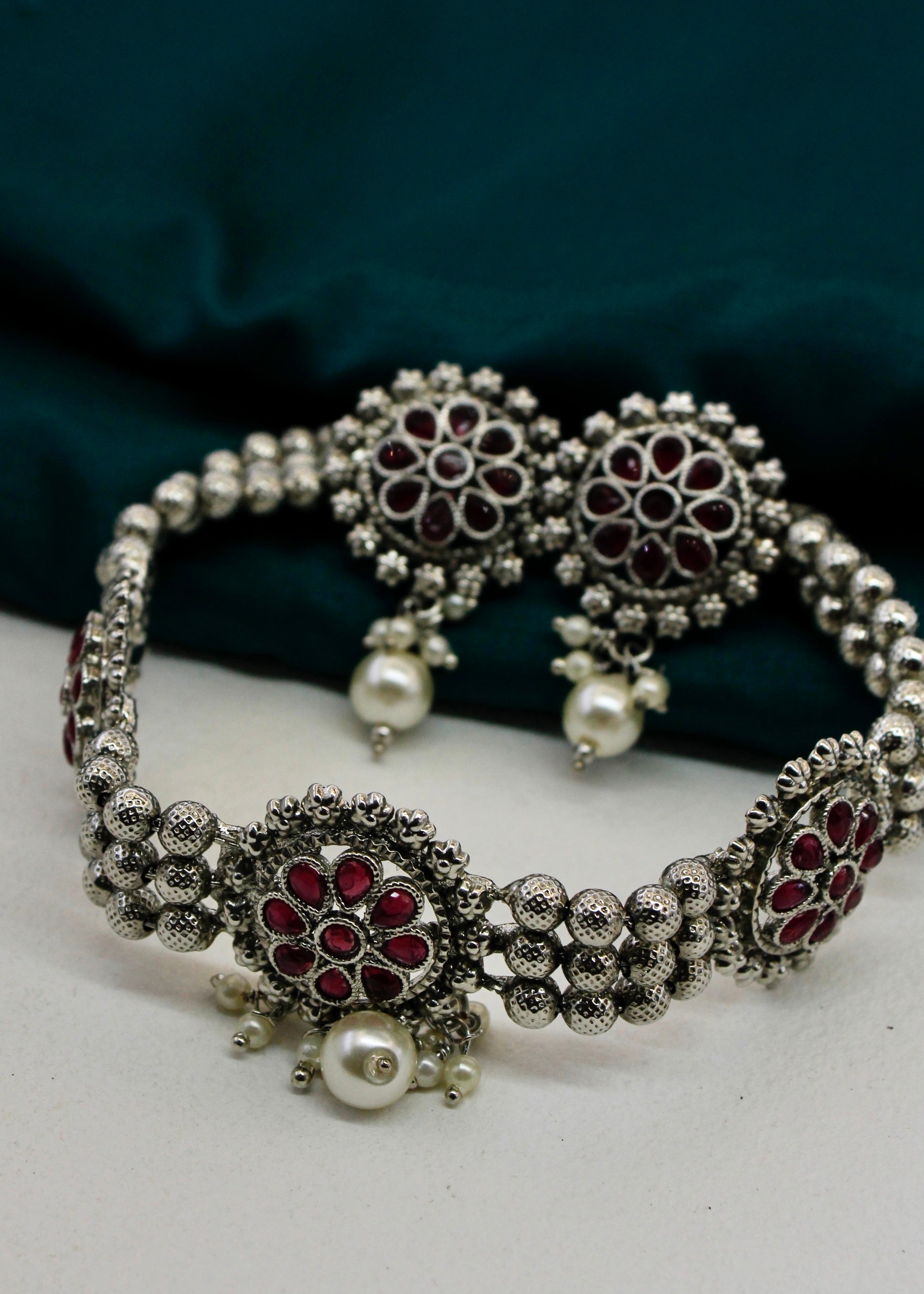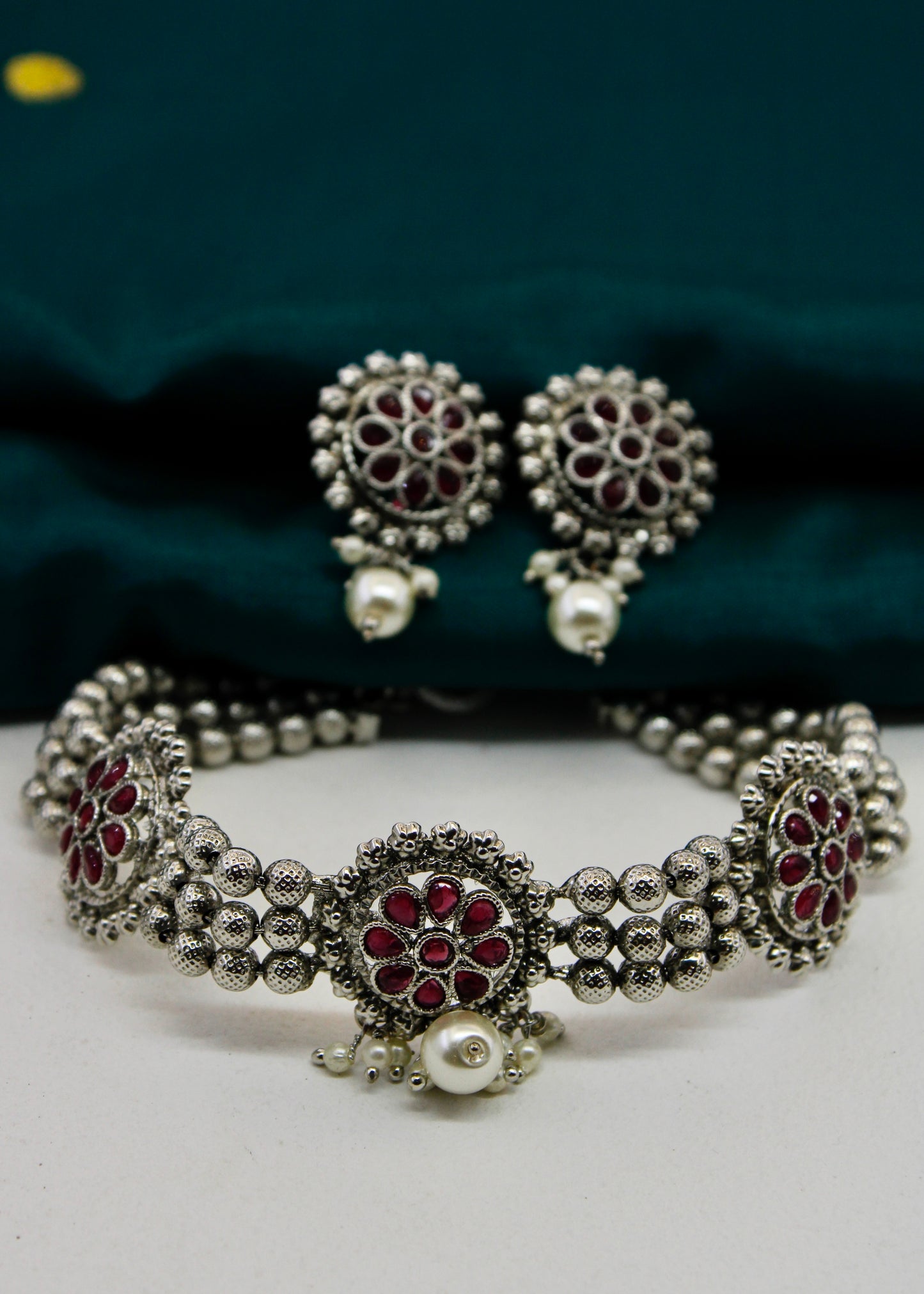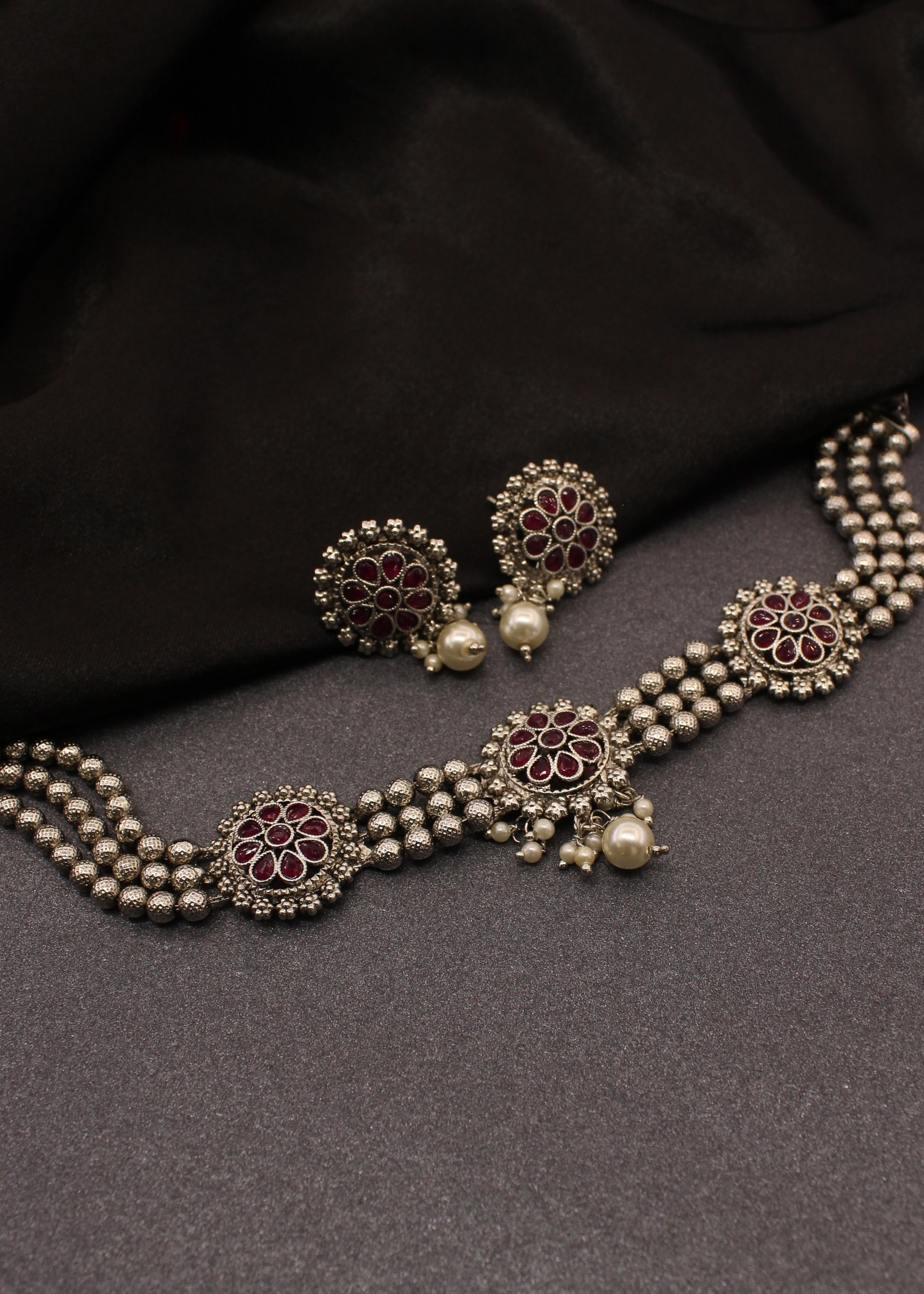 Styled our adorable oxidised finish pink colour necklace set from sonchafa Jewellery for stylish women. It is wonderfully crafted with silver metal and floral design on the surface. This beautiful necklace set will lend you that natural look.