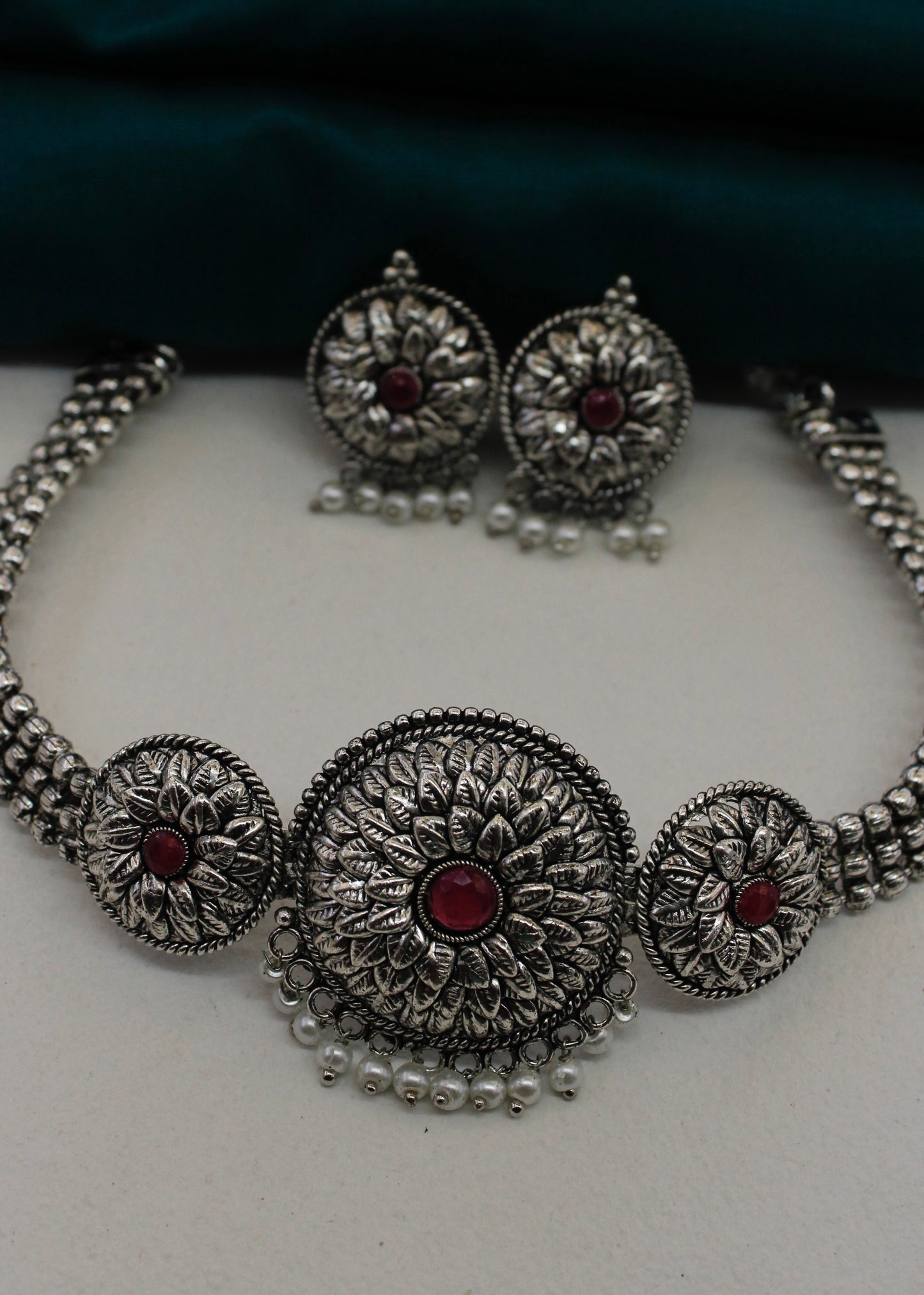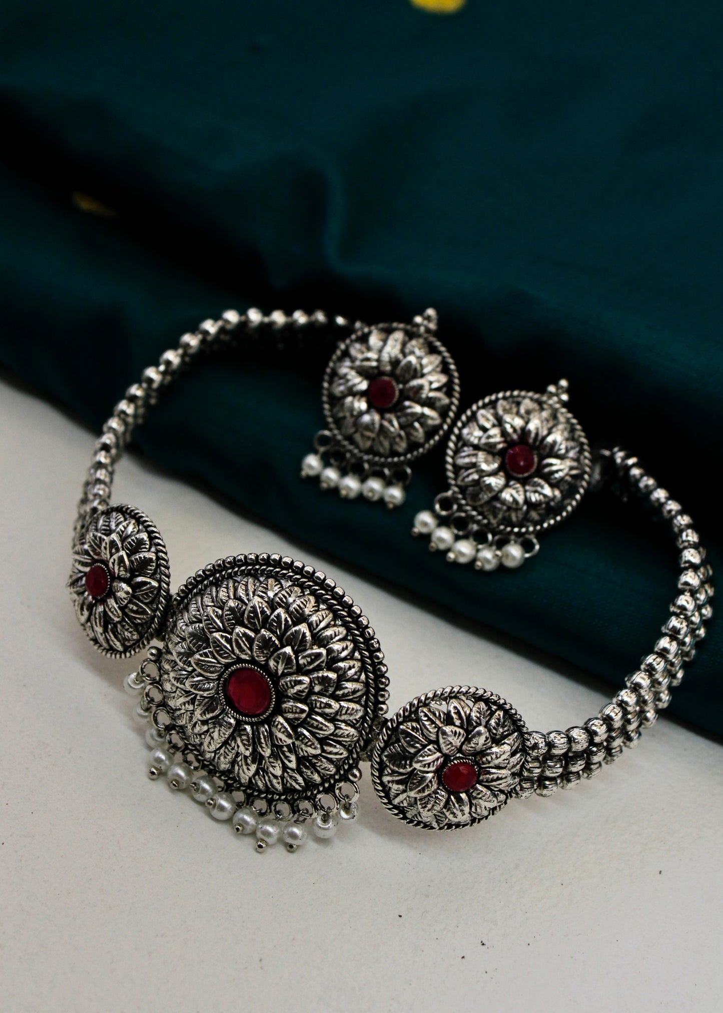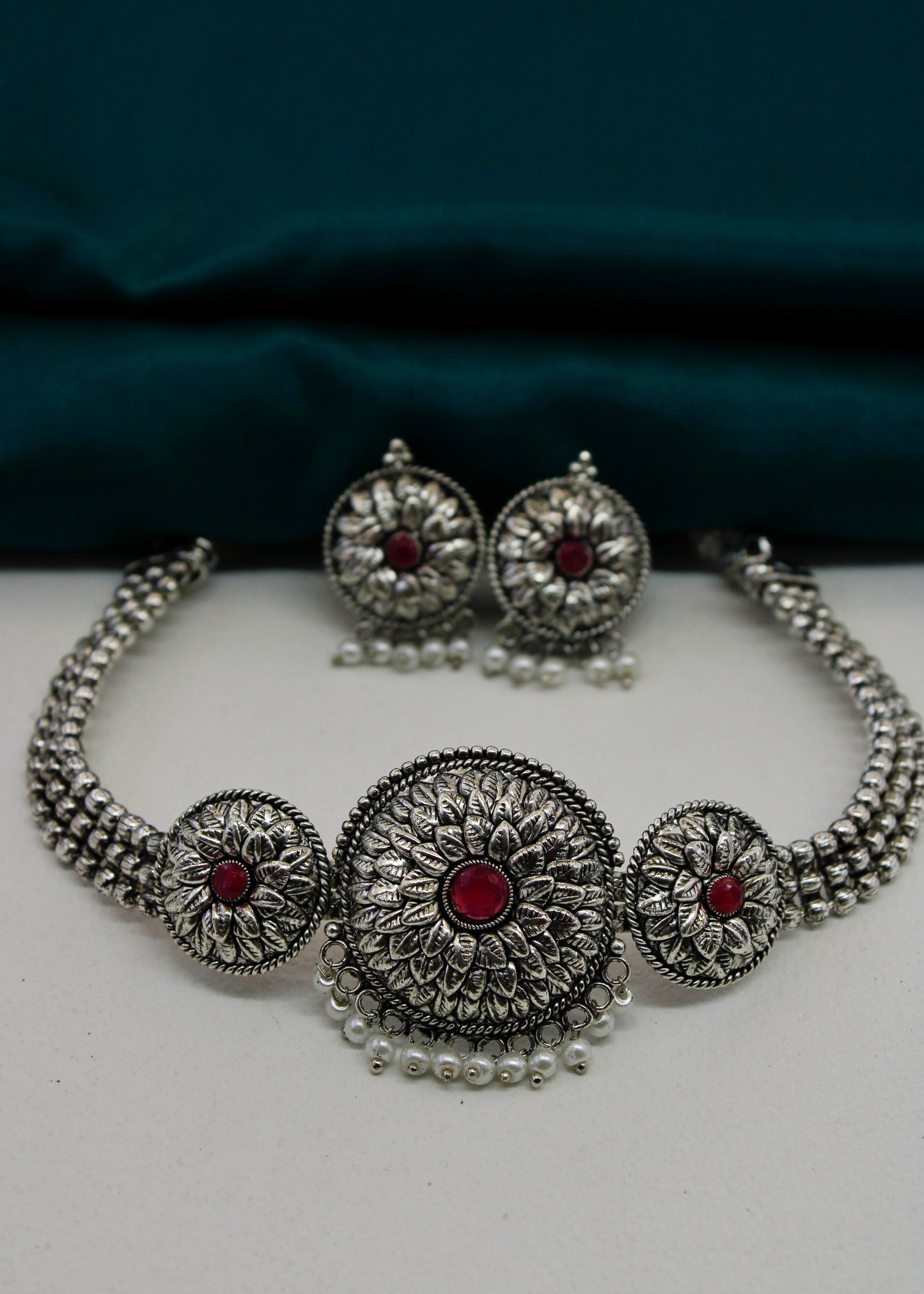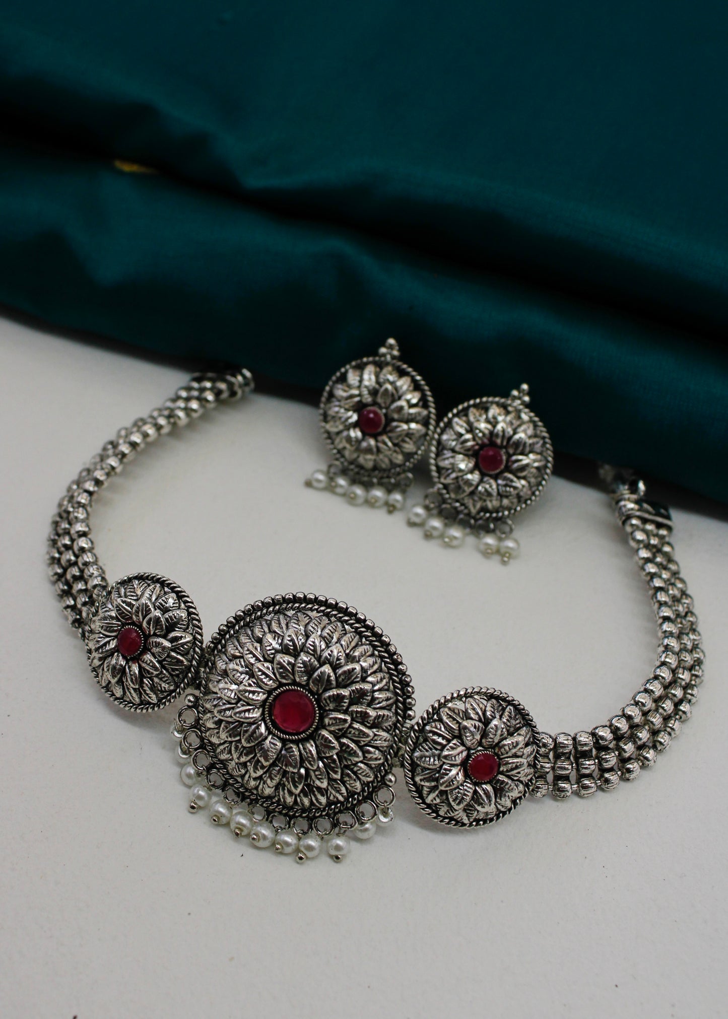 Flaunt your style sense with this charming necklace set. Pink,Green stones & pearl embellishment make it class apart from others. You’ll be surprised watching yourself in mirror that how wonderful you look with this Blossom necklace set. It is made from Oxidised with Siver Finish that ensures high durability of set..