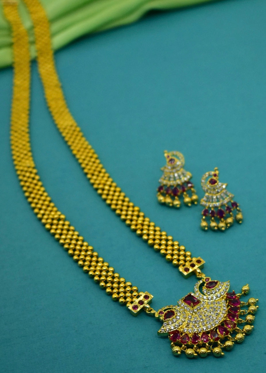 Creatively designed this golden finish classy peacock pendant necklace set from Sonchafa Jewellery. It is embedded with pink, white stones and made from golden finish metal. This classy short necklace set will fetch you lots of compliments from onlookers for your amazing choice.