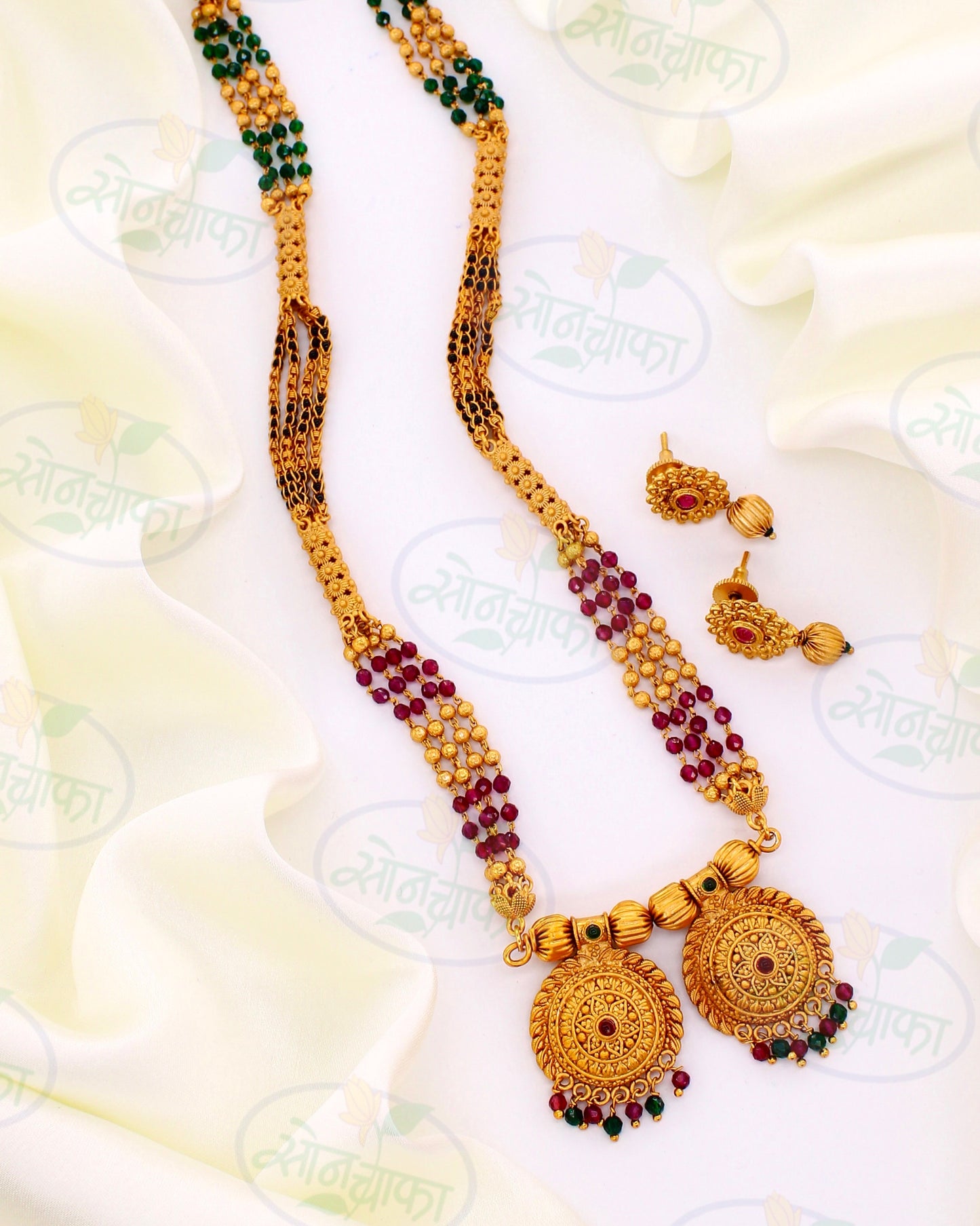 Complete your Maharashtrian look by clubbing this Floral adorable mangaslutra with your paithani saree from Sonchafa Jewellery. The three layer black beaded chain is styled with pink stones. This Mangalsutra is easy to wear and comfortable to hold all day long.
