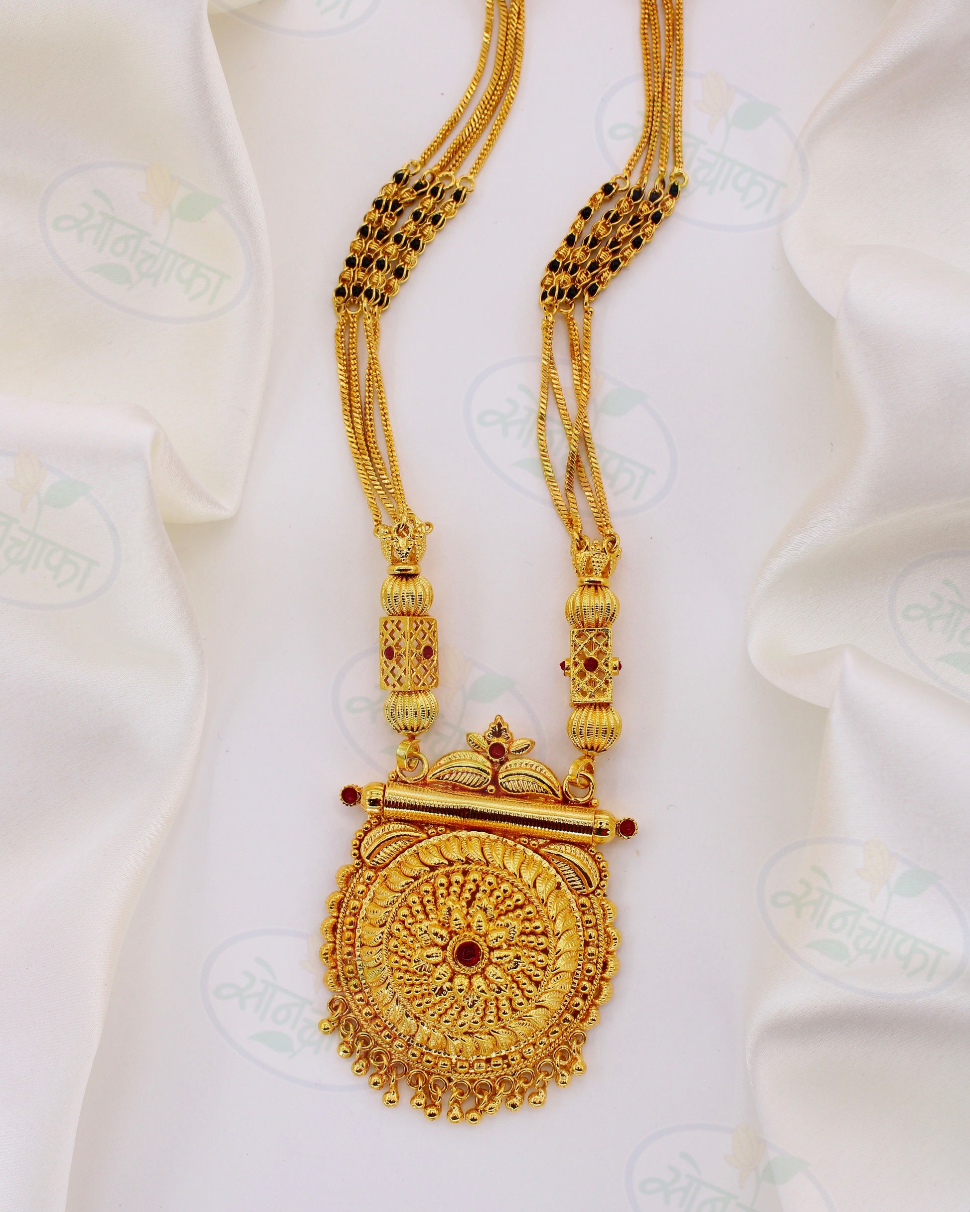 Delicate matte golden finish mangalsutra designs for women traditional from Sonchafa Jewellery. This Mangalsutra is made from matte golden finish metal and it is superior in quality.