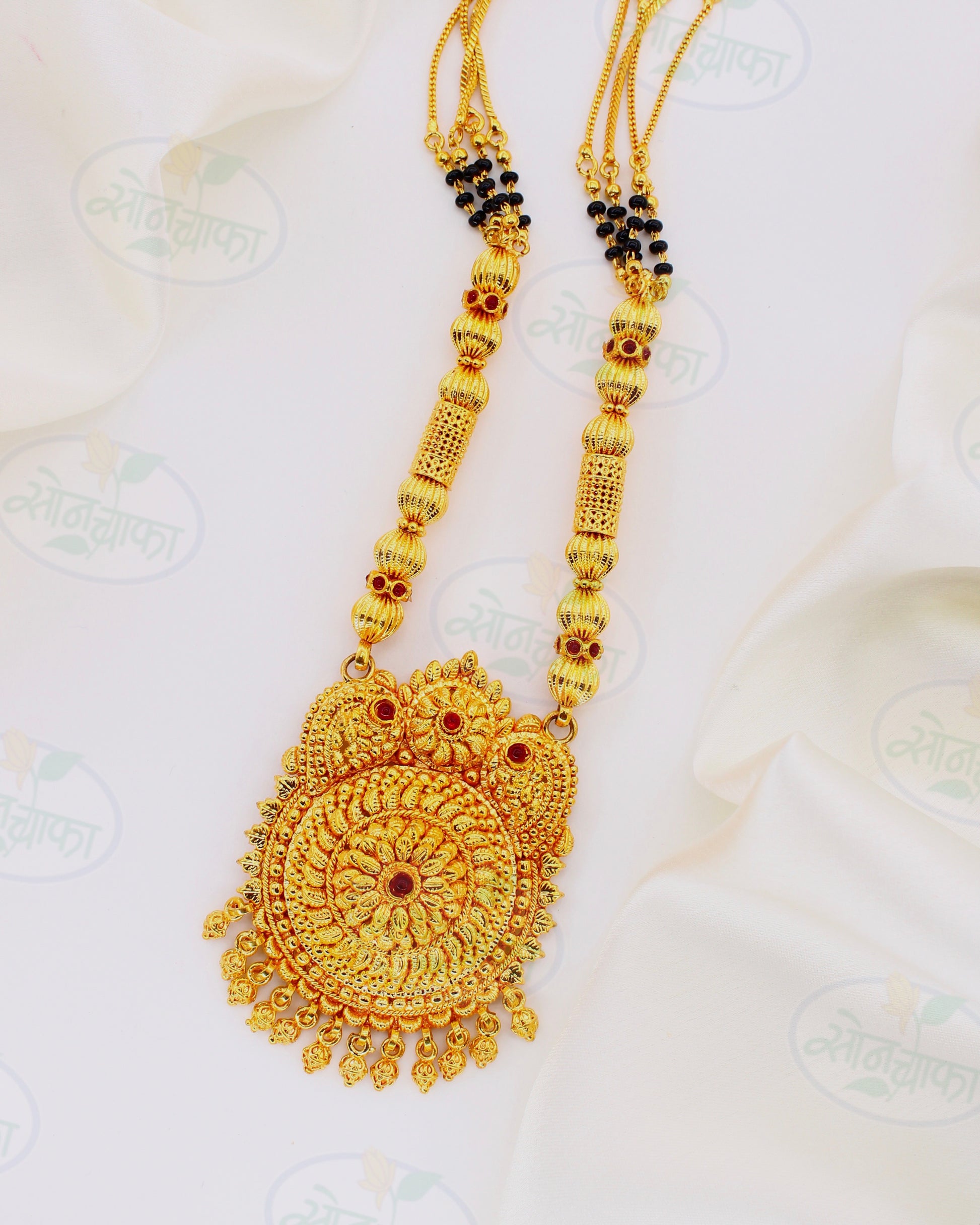 Sonchafa Jewellery brings this appealing mangalsutra for women who love to wear traditional jewellery. It is studded with shiny pink stones and fashioned from highly durable matte gold finish metal. The pendant feature attractive leaf with floral design on metal surface along with dangled golden beads.